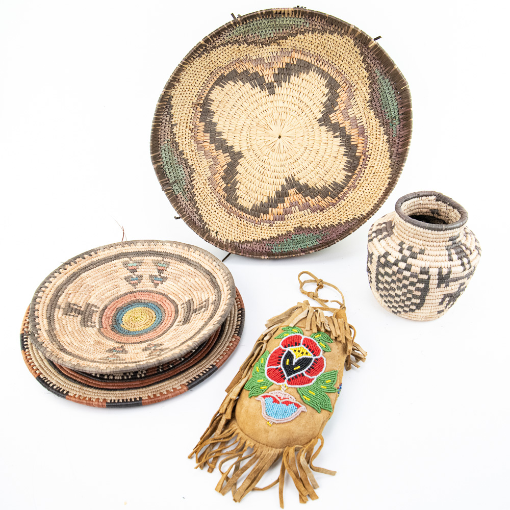 Native American Baskets, Tray, Beaded Pouch