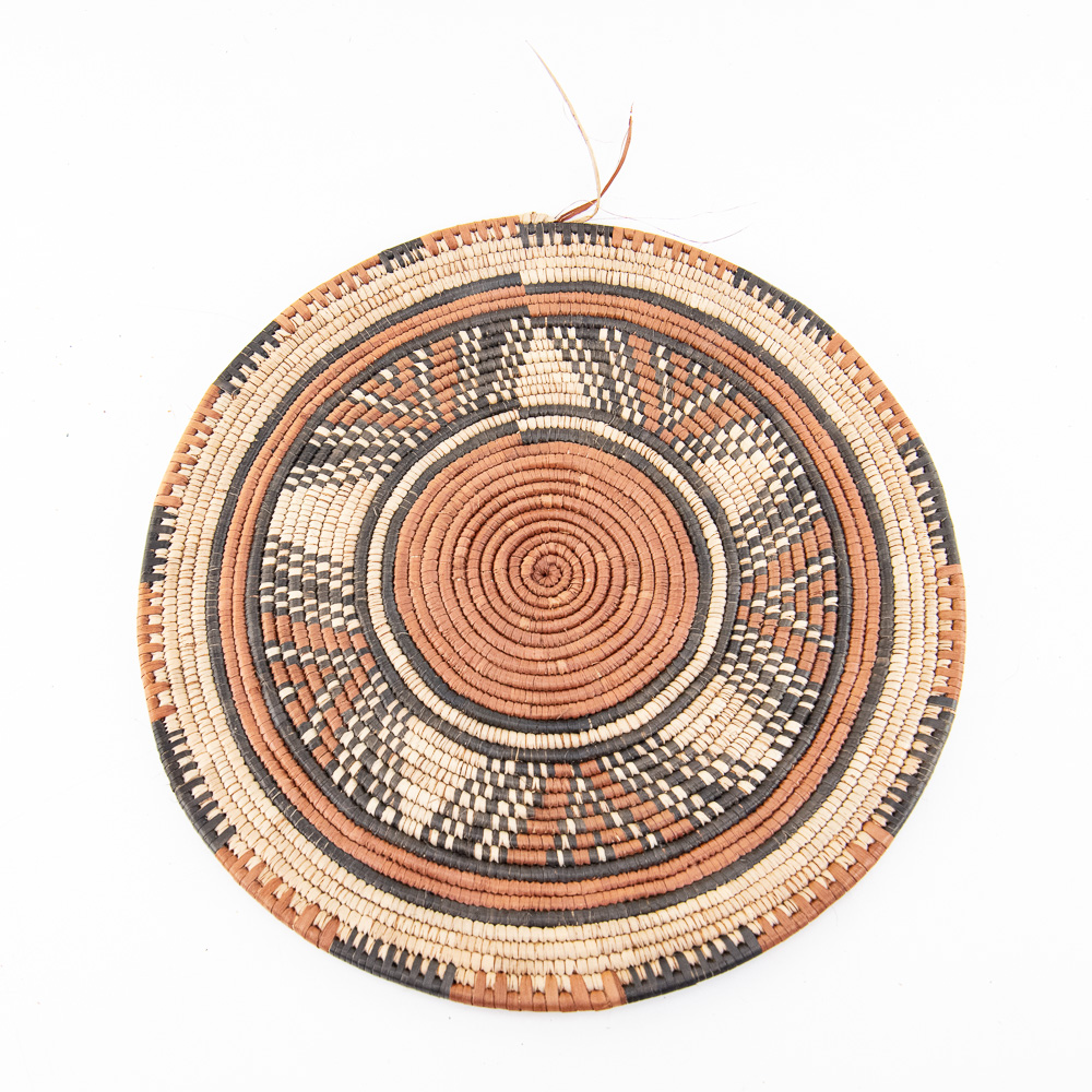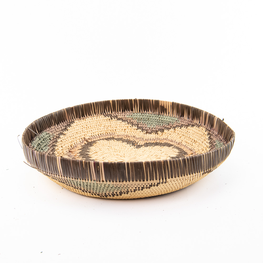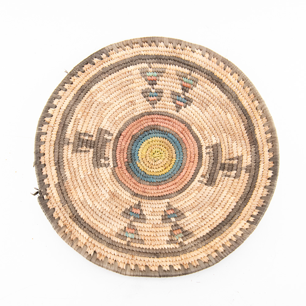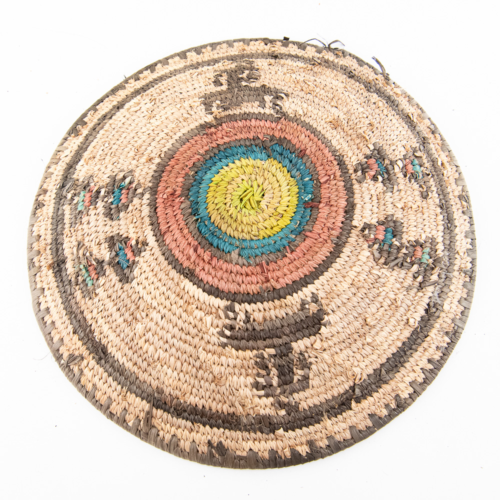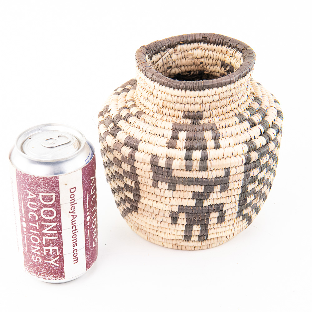 This is an attractive collection of five pieces of Native American art, including four woven baskets/trays and a beaded leather pouch, likely dating from mid to late-20th century. The woven items are crafted from natural plant fibers and grasses, exhibiting fine coiling and twining techniques with geometric and floral-inspired designs in natural tones of straw, dark brown, and terracotta. The shallow, round basket with the dark quatrefoil-like design and the two smaller trays show sophisticated pattern work, typical of tribes in the Southwest or Plateau regions. The smaller, taller basket features a distinctive stepped pattern. Complementing the woven pieces is a supple leather drawstring pouch with fringe, which is beautifully adorned with beadwork in a floral motif of red, black, and green on a sky-blue background, beaded on both sides. The condition of all pieces is generally very good, showing age-appropriate minor fading and some slight fraying of the fibers, particularly on the edges of the trays, which is consistent with use and age. The beadwork on the pouch appears intact and vibrant. H 6.5″, W 16.5″, D 16.5″. See photos. From the Native American display in Donley’s Wild West Town.