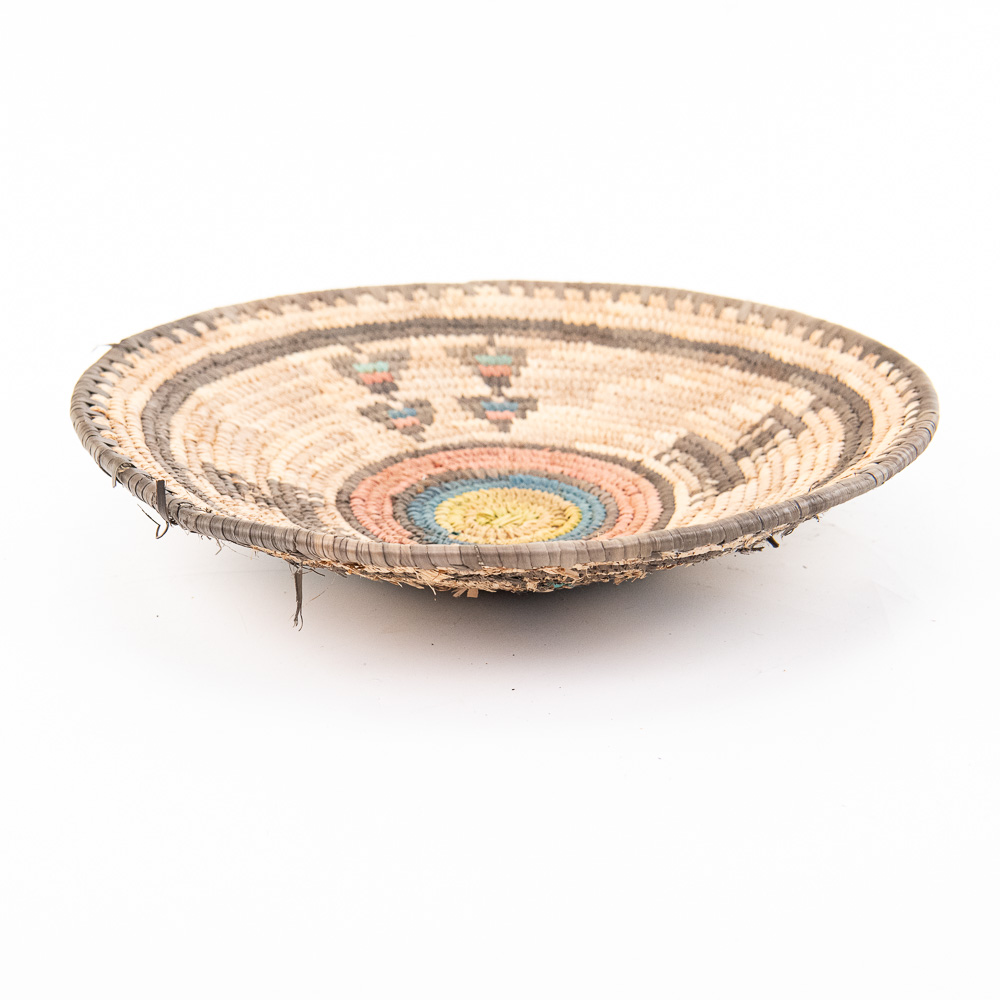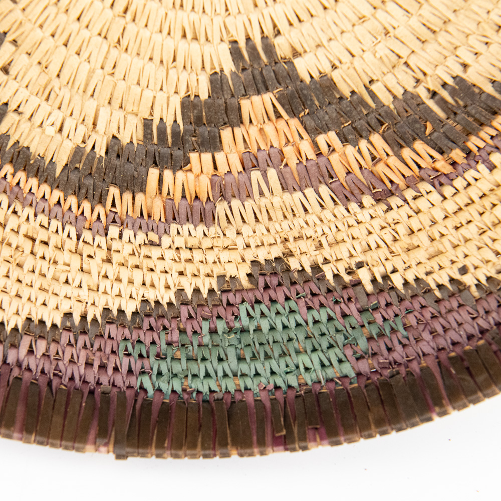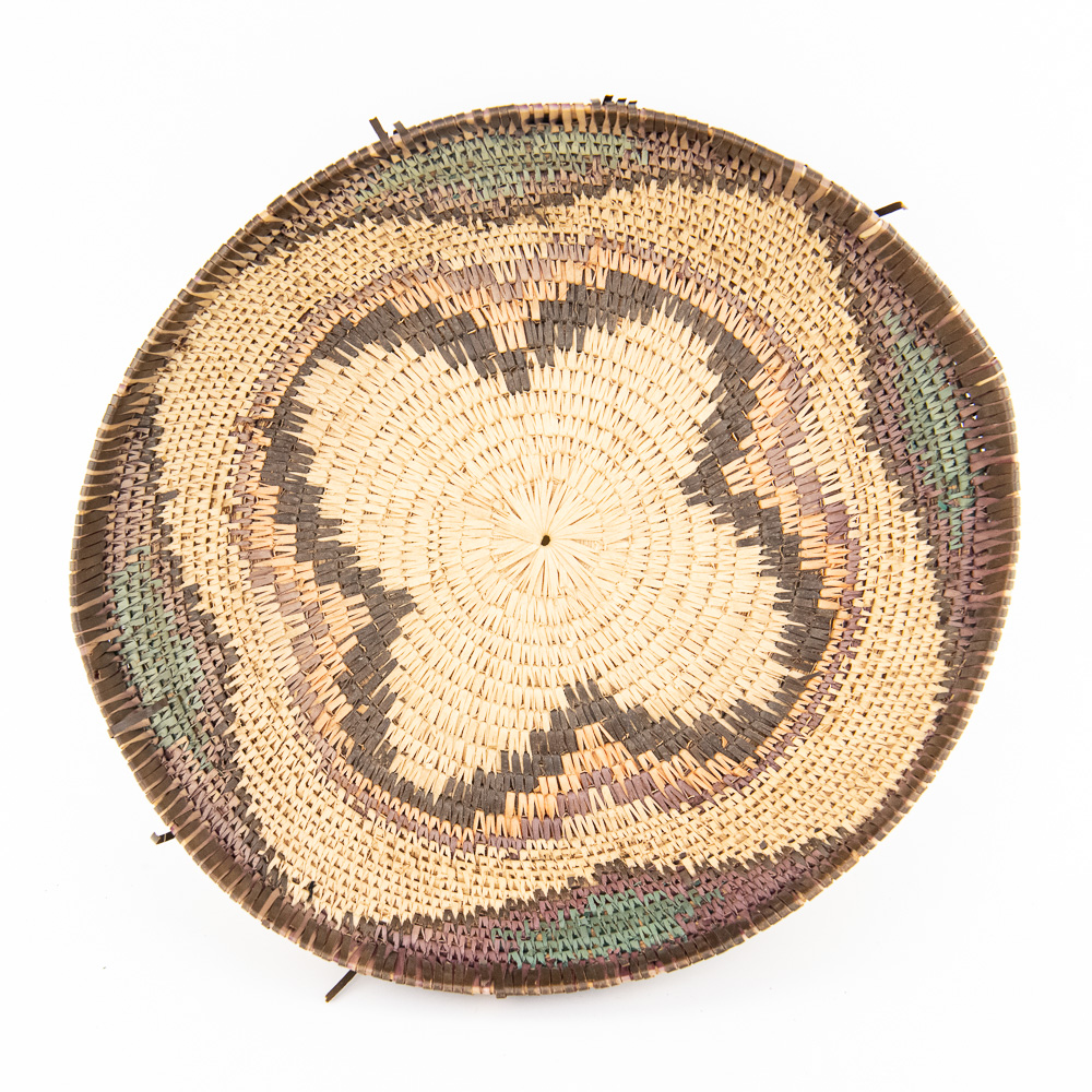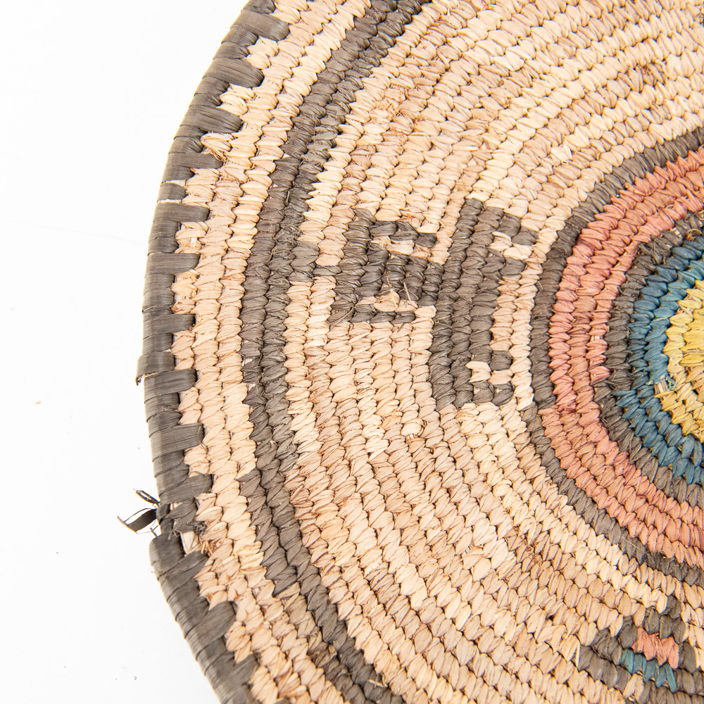 This is an attractive collection of five pieces of Native American art, including four woven baskets/trays and a beaded leather pouch, likely dating from mid to late-20th century. The woven items are crafted from natural plant fibers and grasses, exhibiting fine coiling and twining techniques with geometric and floral-inspired designs in natural tones of straw, dark brown, and terracotta. The shallow, round basket with the dark quatrefoil-like design and the two smaller trays show sophisticated pattern work, typical of tribes in the Southwest or Plateau regions. The smaller, taller basket features a distinctive stepped pattern. Complementing the woven pieces is a supple leather drawstring pouch with fringe, which is beautifully adorned with beadwork in a floral motif of red, black, and green on a sky-blue background, beaded on both sides. The condition of all pieces is generally very good, showing age-appropriate minor fading and some slight fraying of the fibers, particularly on the edges of the trays, which is consistent with use and age. The beadwork on the pouch appears intact and vibrant. H 6.5″, W 16.5″, D 16.5″. See photos. From the Native American display in Donley’s Wild West Town.