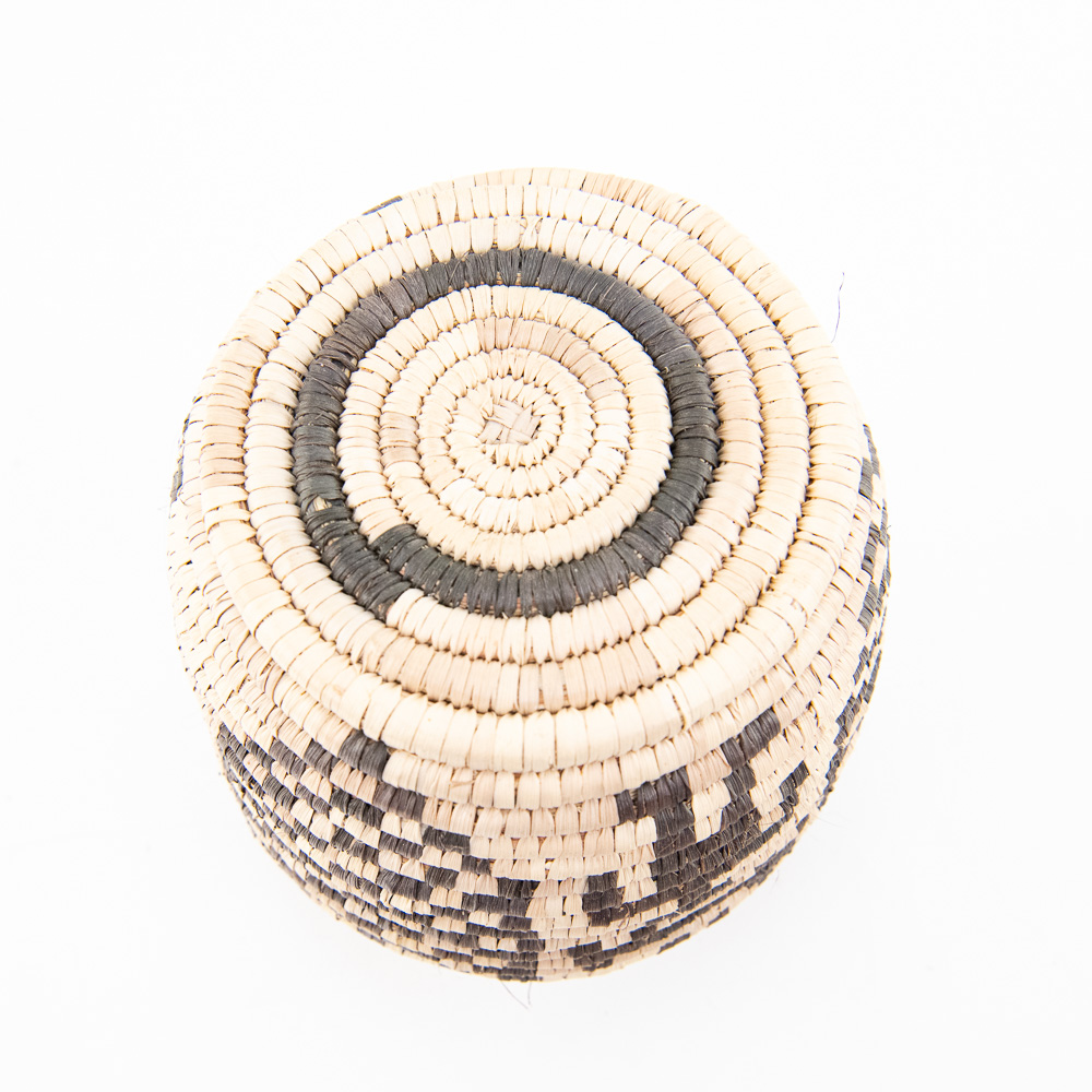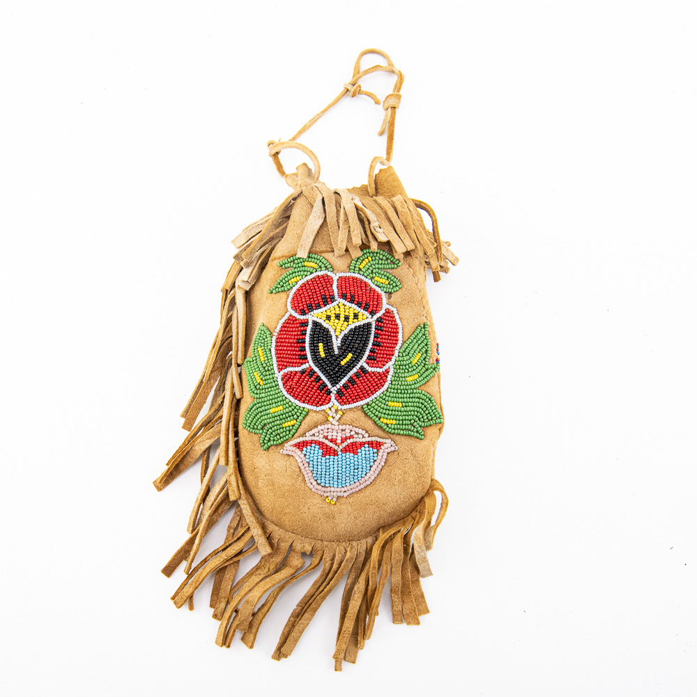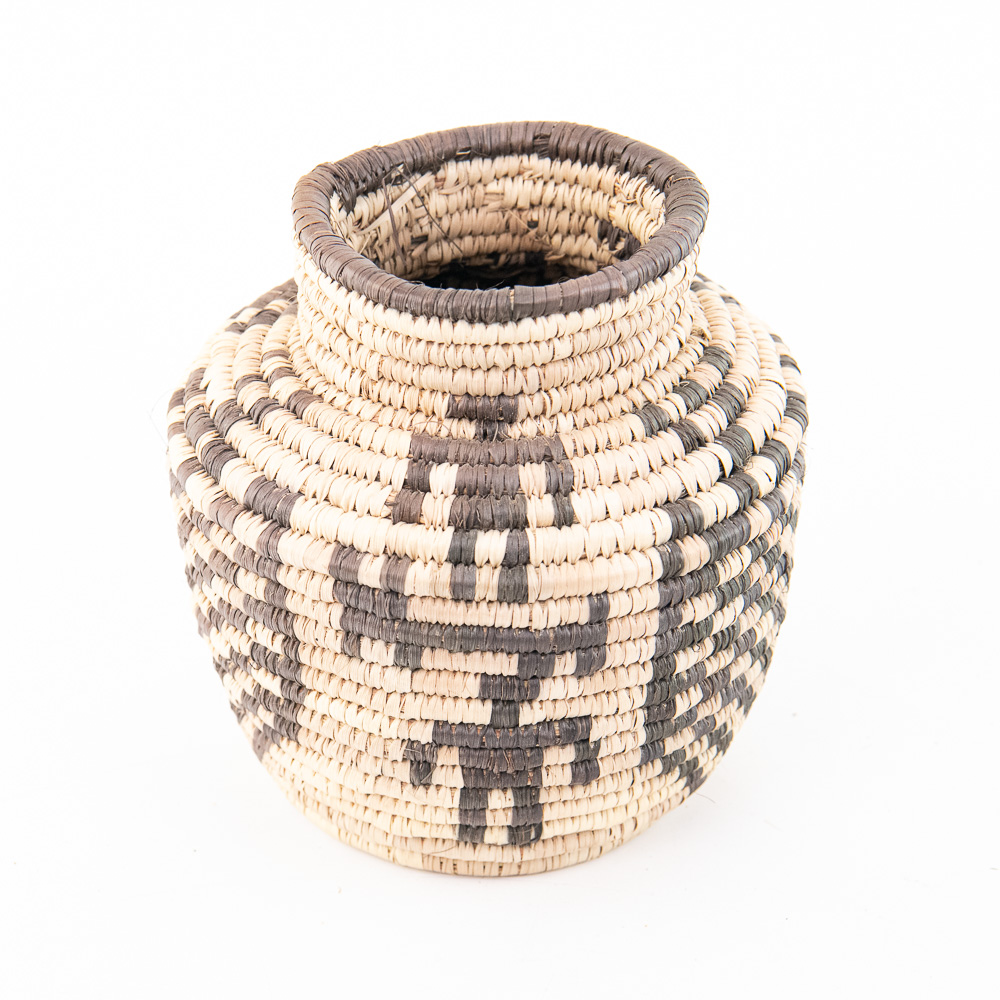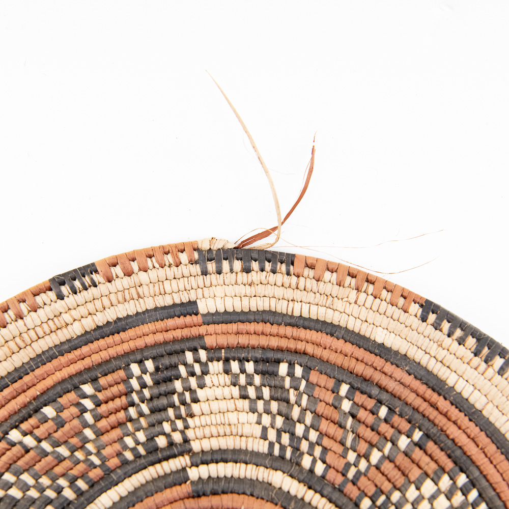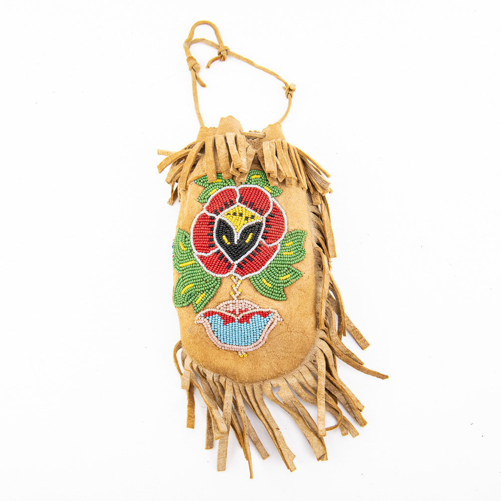 This is an attractive collection of five pieces of Native American art, including four woven baskets/trays and a beaded leather pouch, likely dating from mid to late-20th century. The woven items are crafted from natural plant fibers and grasses, exhibiting fine coiling and twining techniques with geometric and floral-inspired designs in natural tones of straw, dark brown, and terracotta. The shallow, round basket with the dark quatrefoil-like design and the two smaller trays show sophisticated pattern work, typical of tribes in the Southwest or Plateau regions. The smaller, taller basket features a distinctive stepped pattern. Complementing the woven pieces is a supple leather drawstring pouch with fringe, which is beautifully adorned with beadwork in a floral motif of red, black, and green on a sky-blue background, beaded on both sides. The condition of all pieces is generally very good, showing age-appropriate minor fading and some slight fraying of the fibers, particularly on the edges of the trays, which is consistent with use and age. The beadwork on the pouch appears intact and vibrant. H 6.5″, W 16.5″, D 16.5″. See photos. From the Native American display in Donley’s Wild West Town.