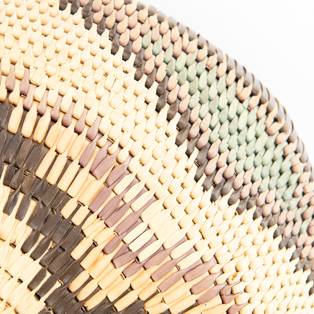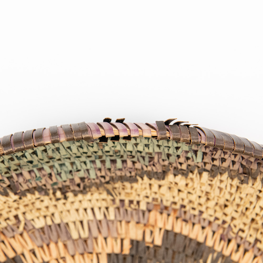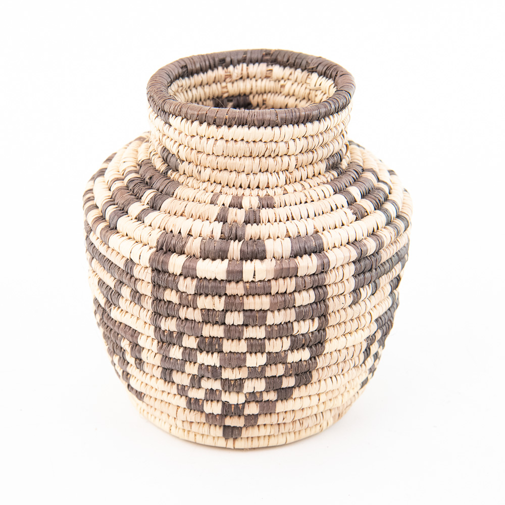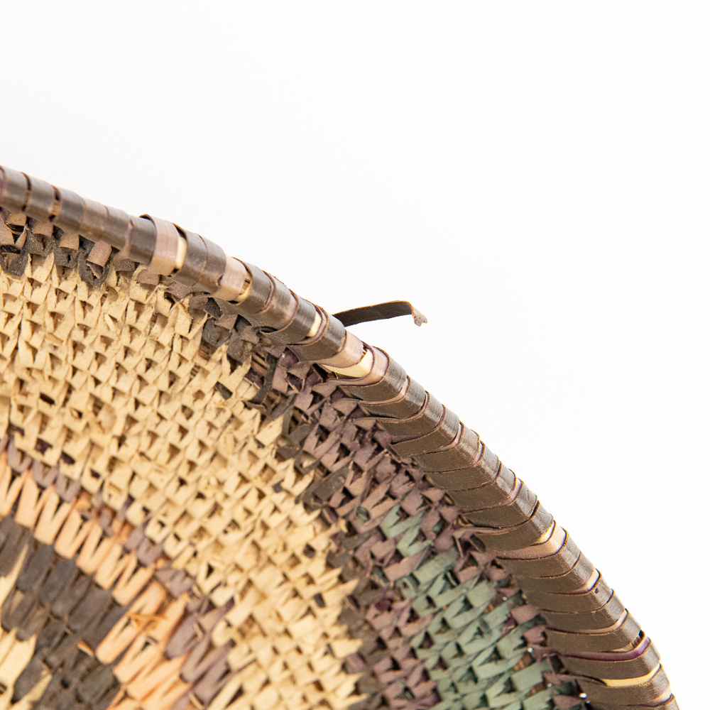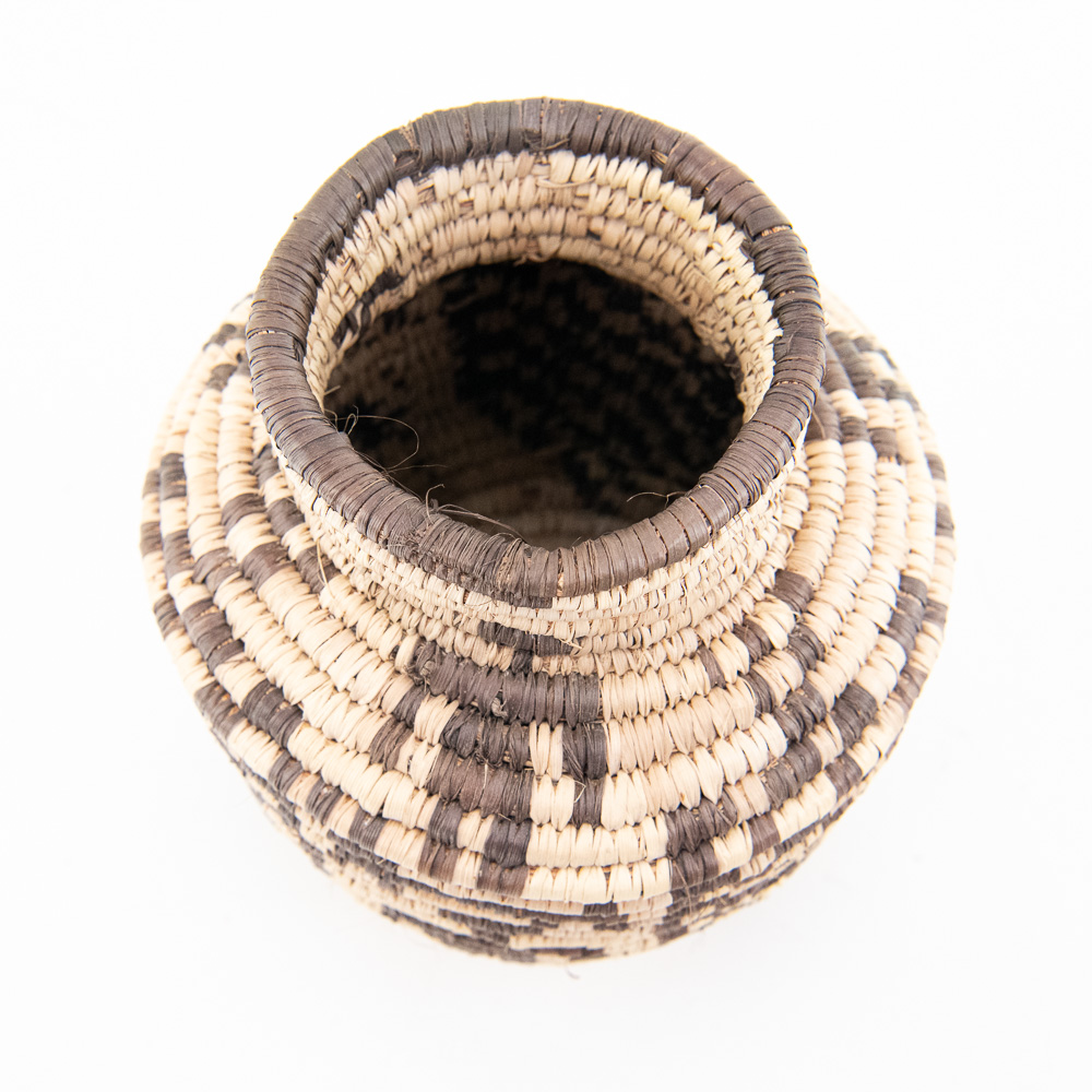 This is an attractive collection of five pieces of Native American art, including four woven baskets/trays and a beaded leather pouch, likely dating from mid to late-20th century. The woven items are crafted from natural plant fibers and grasses, exhibiting fine coiling and twining techniques with geometric and floral-inspired designs in natural tones of straw, dark brown, and terracotta. The shallow, round basket with the dark quatrefoil-like design and the two smaller trays show sophisticated pattern work, typical of tribes in the Southwest or Plateau regions. The smaller, taller basket features a distinctive stepped pattern. Complementing the woven pieces is a supple leather drawstring pouch with fringe, which is beautifully adorned with beadwork in a floral motif of red, black, and green on a sky-blue background, beaded on both sides. The condition of all pieces is generally very good, showing age-appropriate minor fading and some slight fraying of the fibers, particularly on the edges of the trays, which is consistent with use and age. The beadwork on the pouch appears intact and vibrant. H 6.5″, W 16.5″, D 16.5″. See photos. From the Native American display in Donley’s Wild West Town.