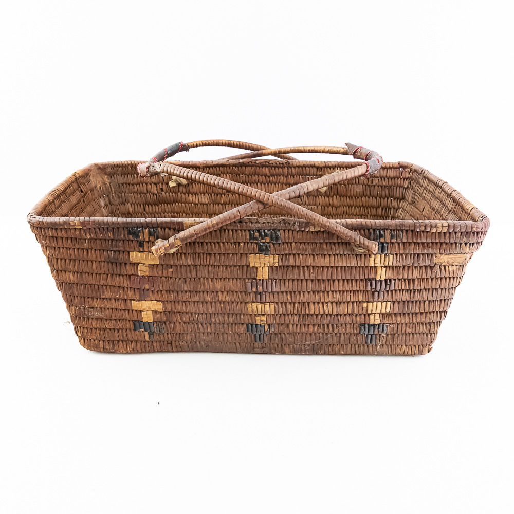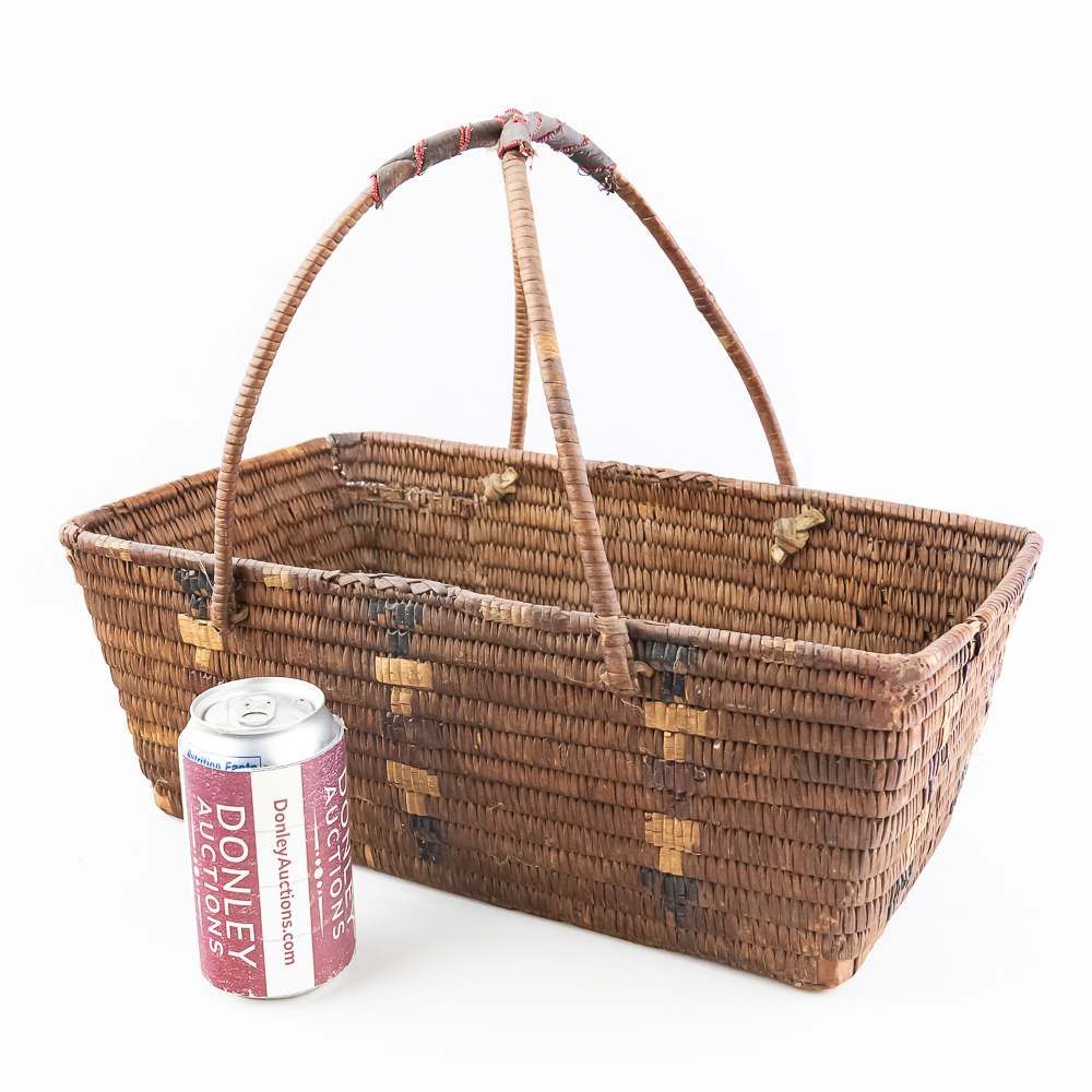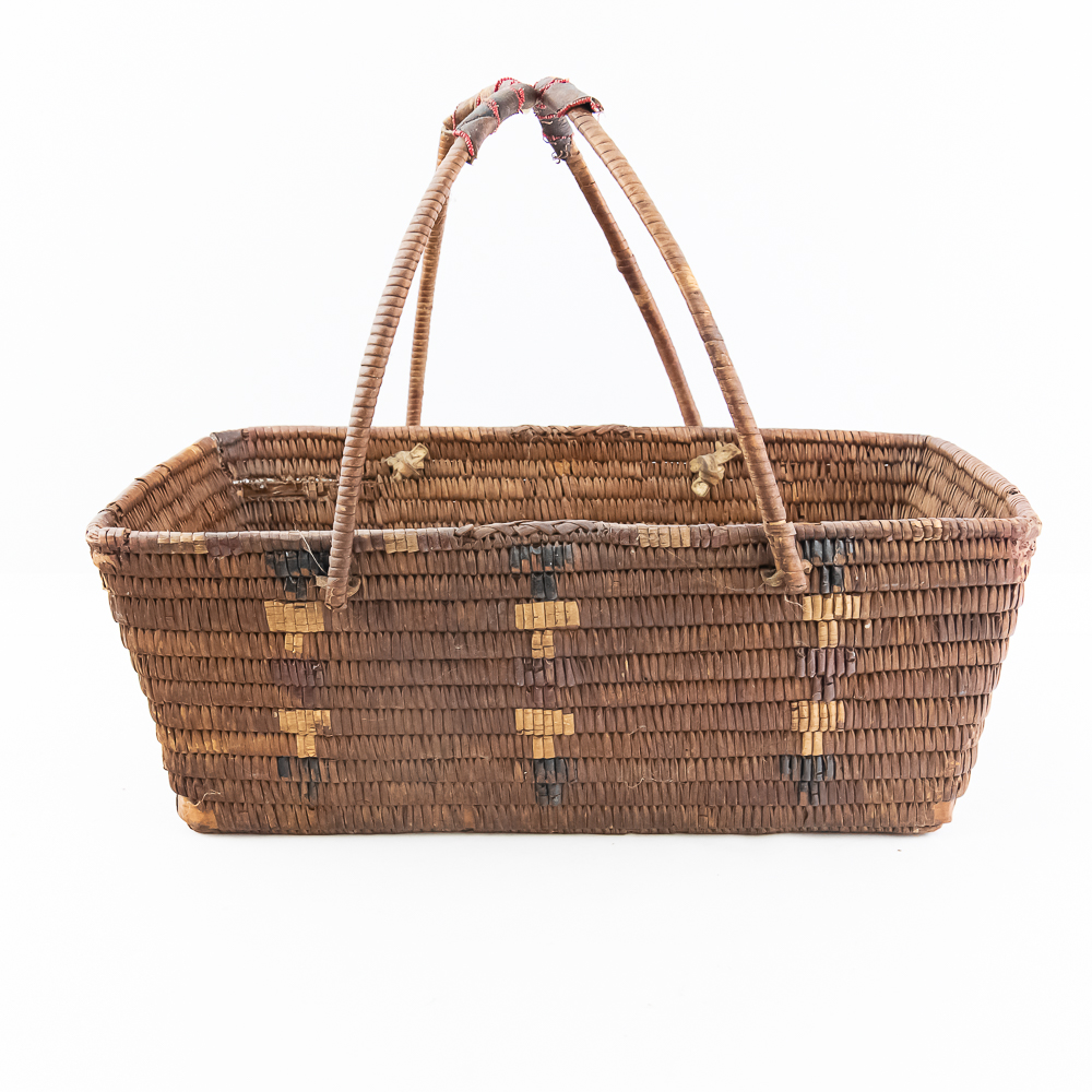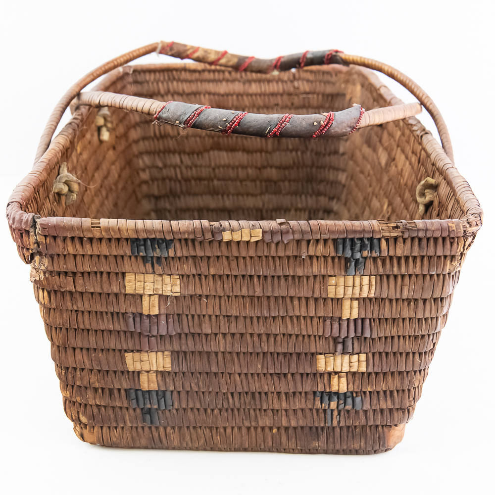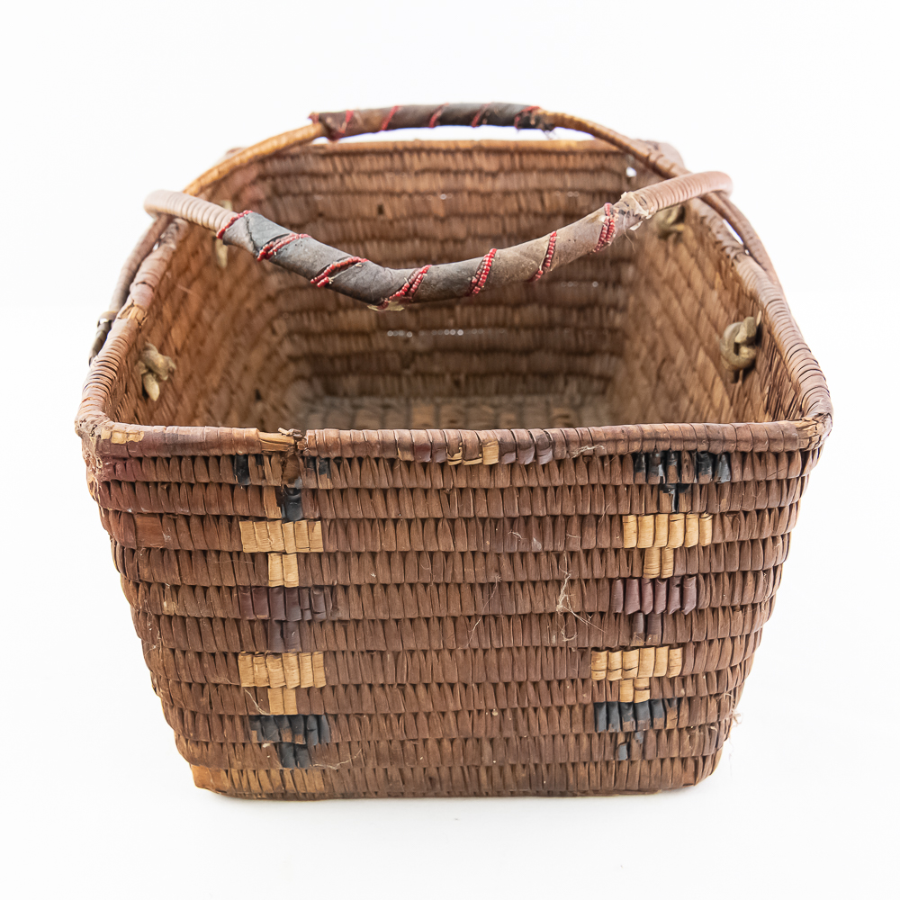 Salish burden basket circa 1920s. These baskets are traditionally crafted by the Salish people of the Pacific Northwest known for their sturdy construction and intricate weaving patterns. Burden baskets were historically used for carrying various items such as food, firewood and other material. This basket is rectangular in shape with handles for carrying. The handles are adorned with wrapped leather strips with read glass bead edging. The handles are affixed to the basket body with leather thongs inserted through the basket wall. The designs woven into the basket are characteristic of Salish weaving traditions often incorporating geometric patterns and symbolic motifs. In this case, there are two columns on the short ends and three columns on the sides of a repetitive design. The basket is well used and has handling damage along the upper rows of the rim. This basket has seen a fair amount of personal use. Dimensions: 17” long x 11” wide x 6.75” basket body tall x 14” with handles extended. Please see photos.