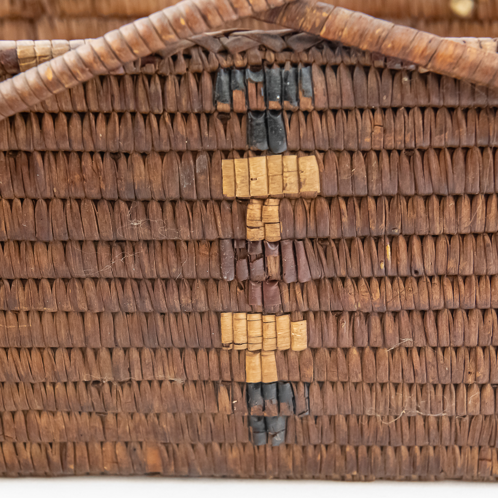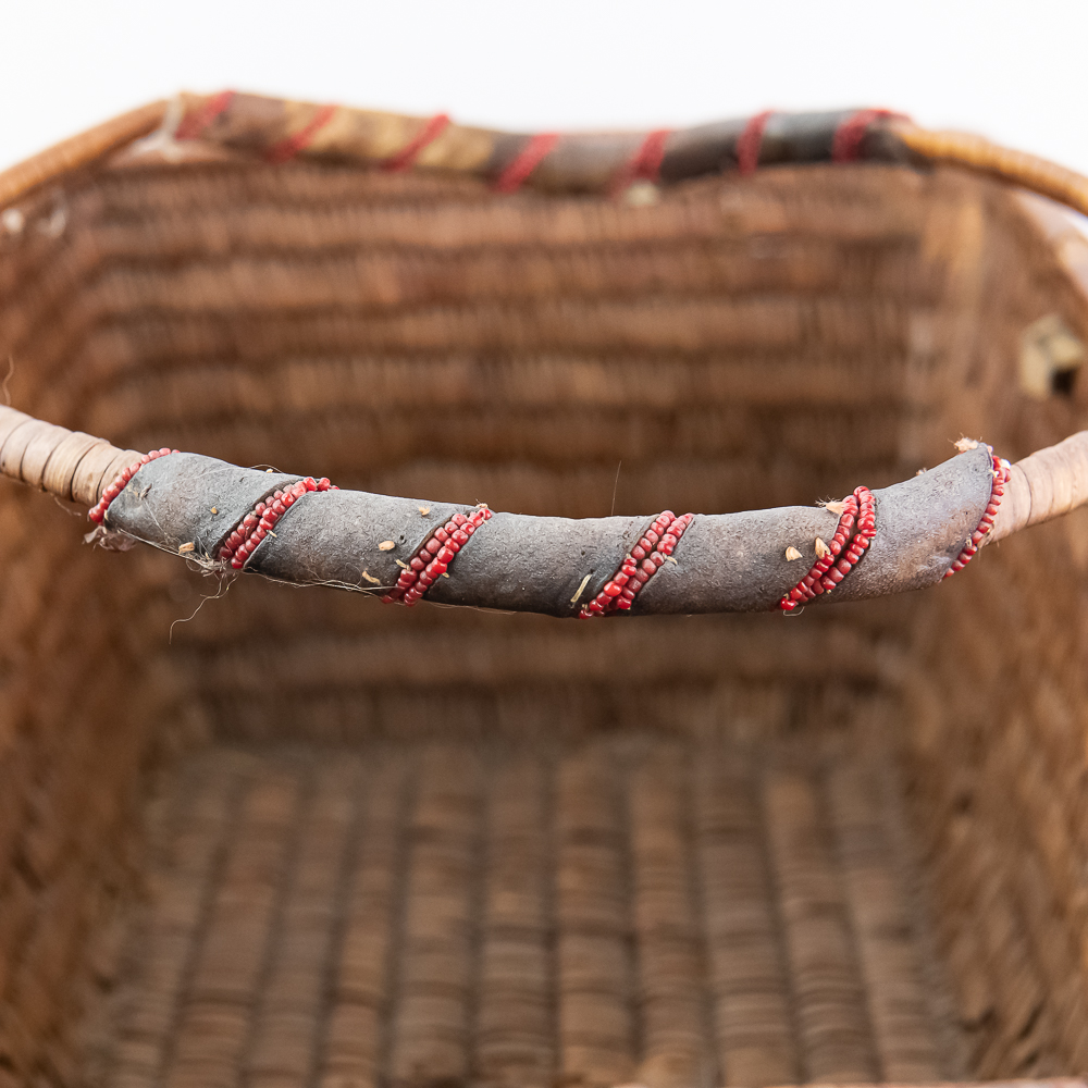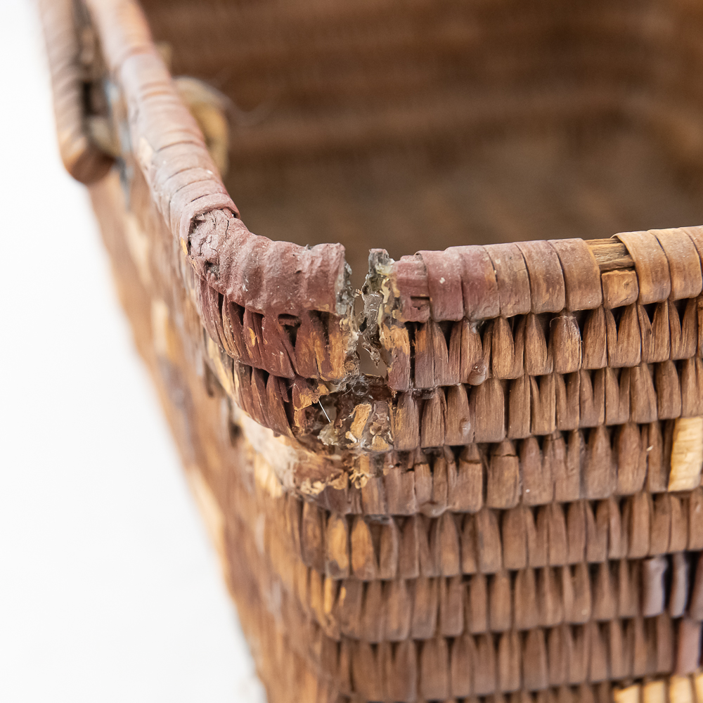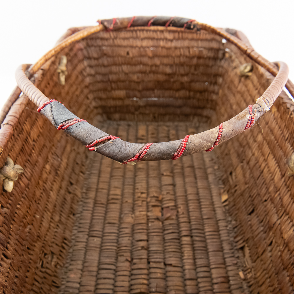 Salish burden basket circa 1920s. These baskets are traditionally crafted by the Salish people of the Pacific Northwest known for their sturdy construction and intricate weaving patterns. Burden baskets were historically used for carrying various items such as food, firewood and other material. This basket is rectangular in shape with handles for carrying. The handles are adorned with wrapped leather strips with read glass bead edging. The handles are affixed to the basket body with leather thongs inserted through the basket wall. The designs woven into the basket are characteristic of Salish weaving traditions often incorporating geometric patterns and symbolic motifs. In this case, there are two columns on the short ends and three columns on the sides of a repetitive design. The basket is well used and has handling damage along the upper rows of the rim. This basket has seen a fair amount of personal use. Dimensions: 17” long x 11” wide x 6.75” basket body tall x 14” with handles extended. Please see photos.