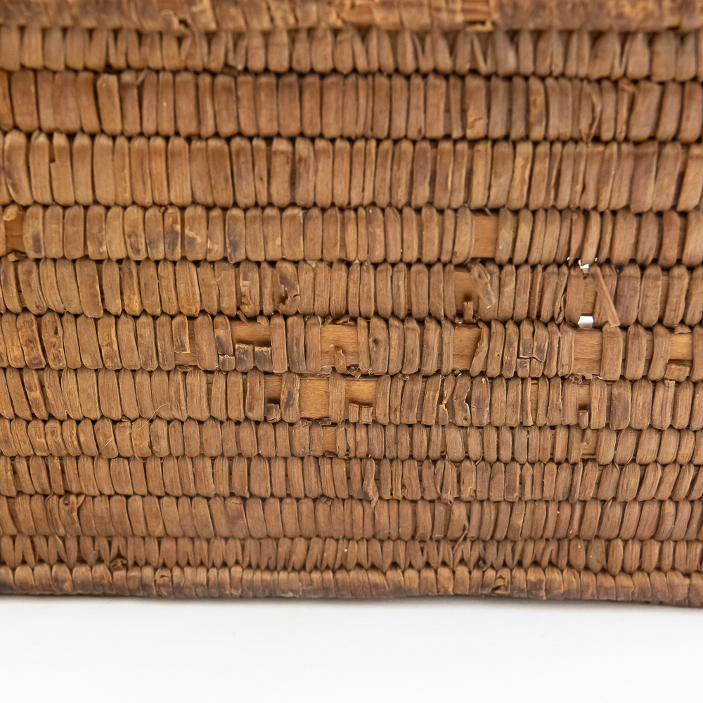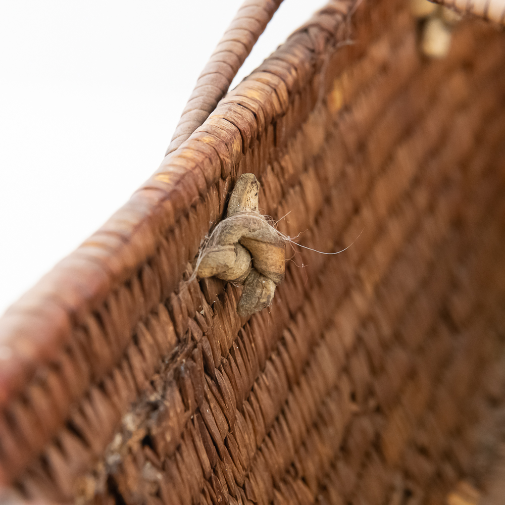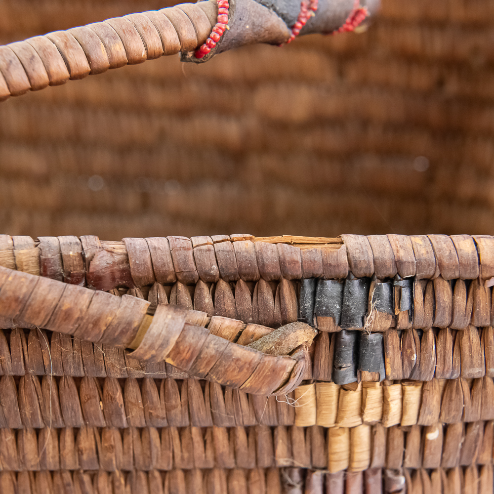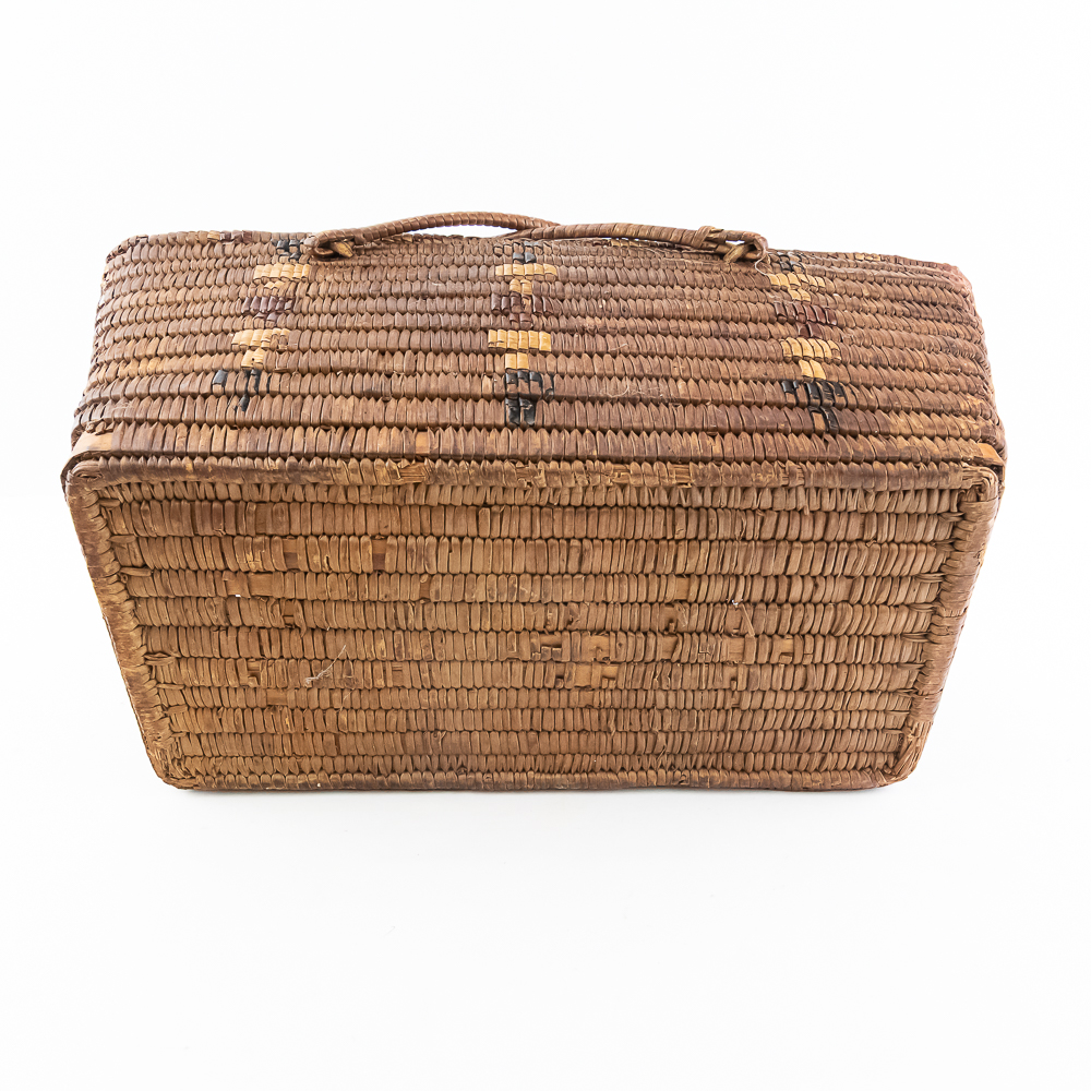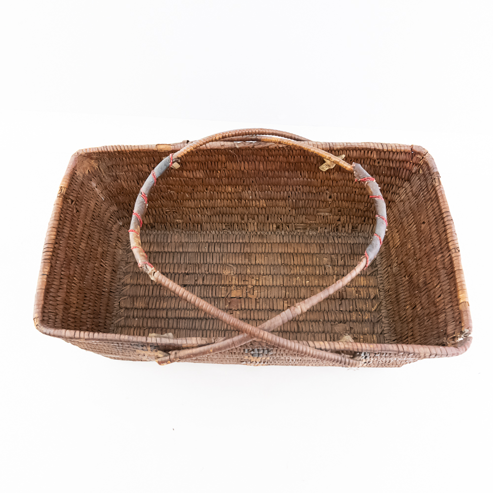 Salish burden basket circa 1920s. These baskets are traditionally crafted by the Salish people of the Pacific Northwest known for their sturdy construction and intricate weaving patterns. Burden baskets were historically used for carrying various items such as food, firewood and other material. This basket is rectangular in shape with handles for carrying. The handles are adorned with wrapped leather strips with read glass bead edging. The handles are affixed to the basket body with leather thongs inserted through the basket wall. The designs woven into the basket are characteristic of Salish weaving traditions often incorporating geometric patterns and symbolic motifs. In this case, there are two columns on the short ends and three columns on the sides of a repetitive design. The basket is well used and has handling damage along the upper rows of the rim. This basket has seen a fair amount of personal use. Dimensions: 17” long x 11” wide x 6.75” basket body tall x 14” with handles extended. Please see photos.