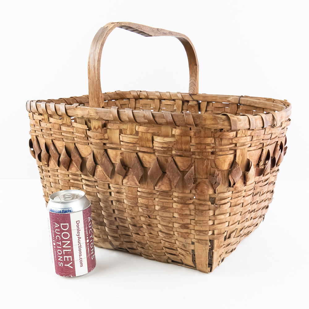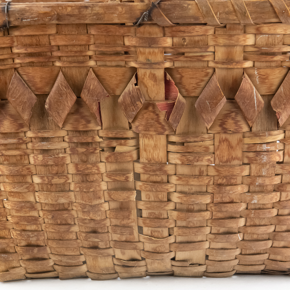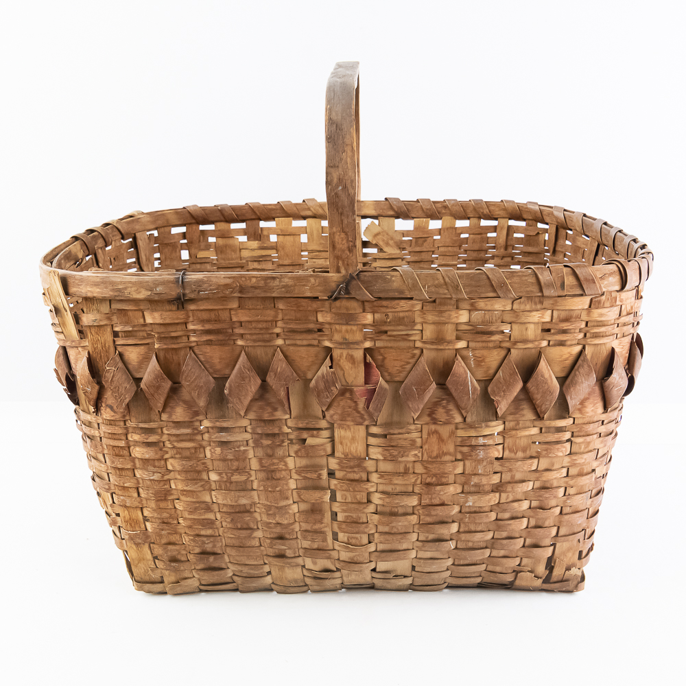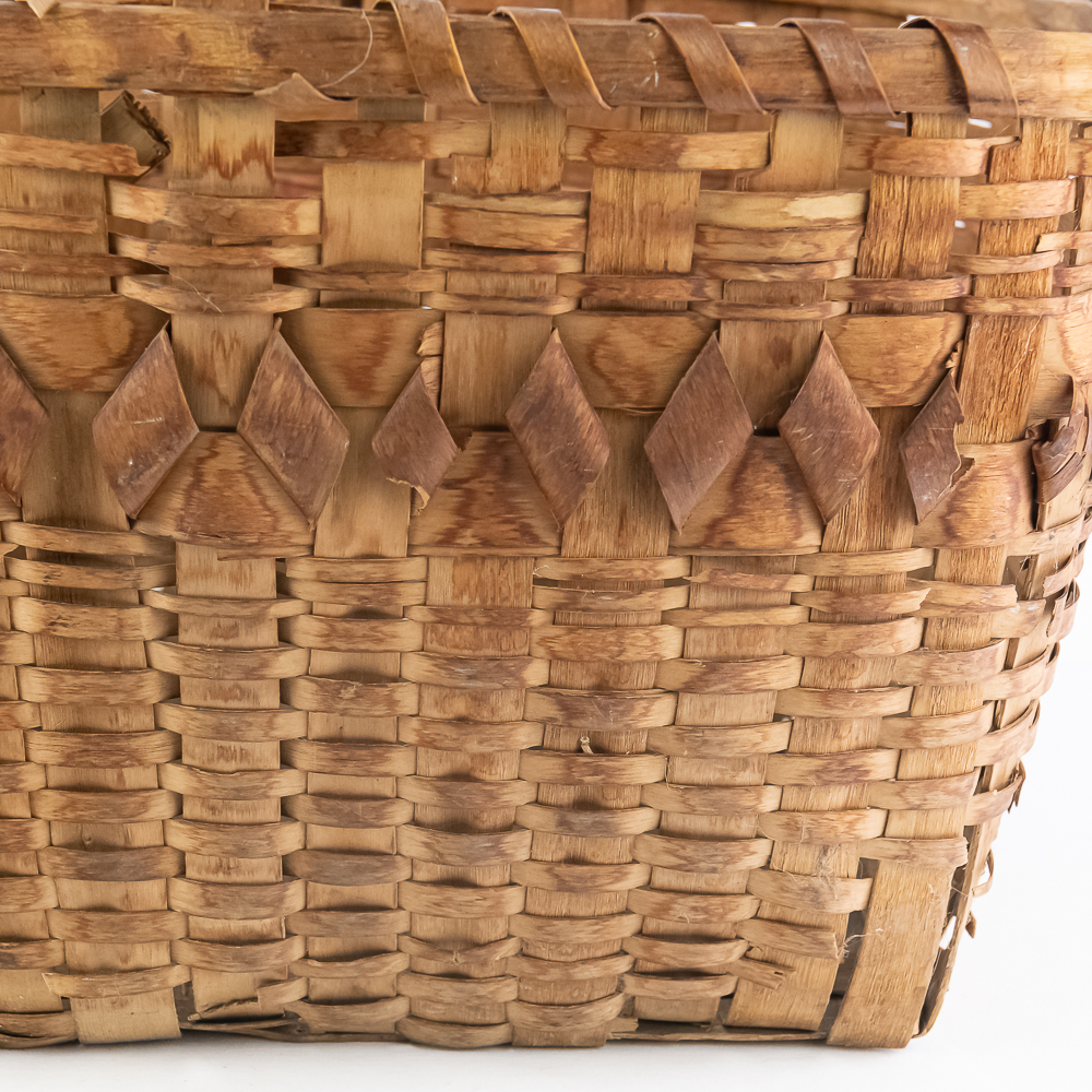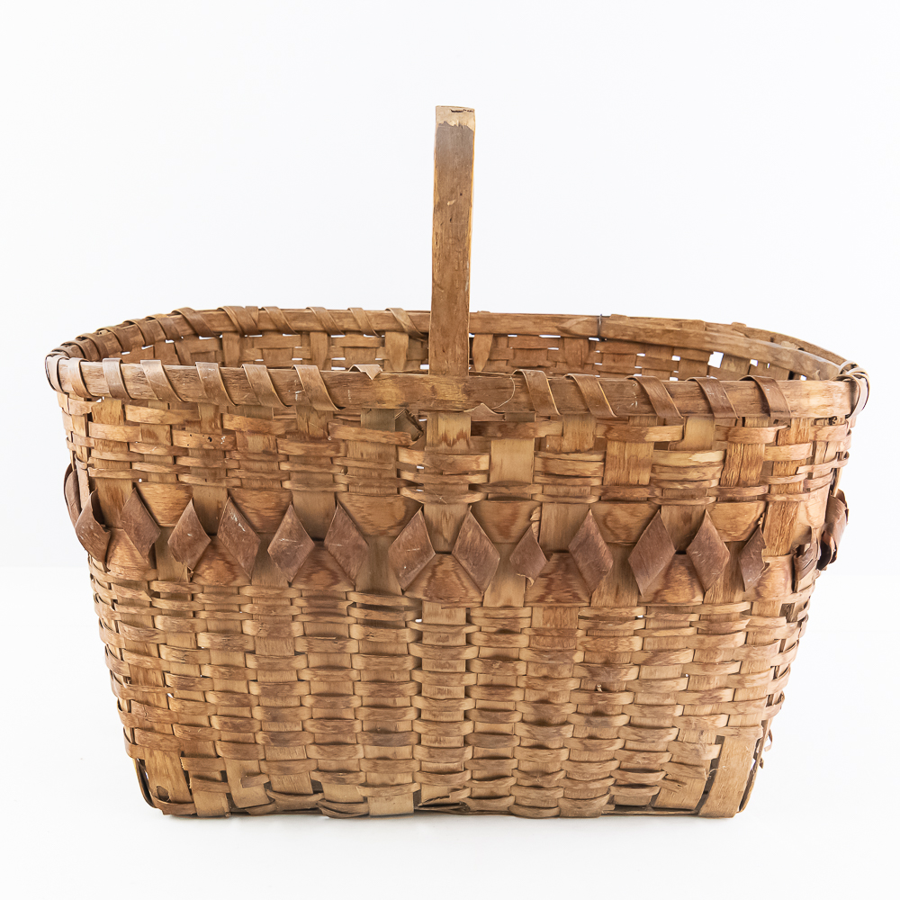 Traditional Winnebago or Ho-Chunk split oak basket these baskets are known for their distinctive woven pattern and sturdy construction featuring a handle for carrying. This basket features a rich patina from age, and there are many elements of the weave that are fragile. The bark is woven with a beautiful diamond pattern in a band around the upper portion of the basket. Dimensions are 13” wide x 17.75” long x 10” tall. Height with handle is approximately 15”.