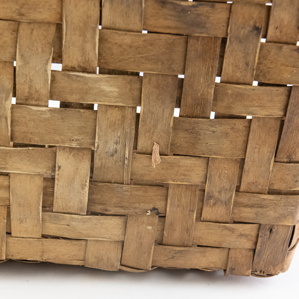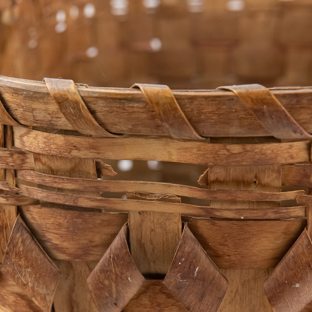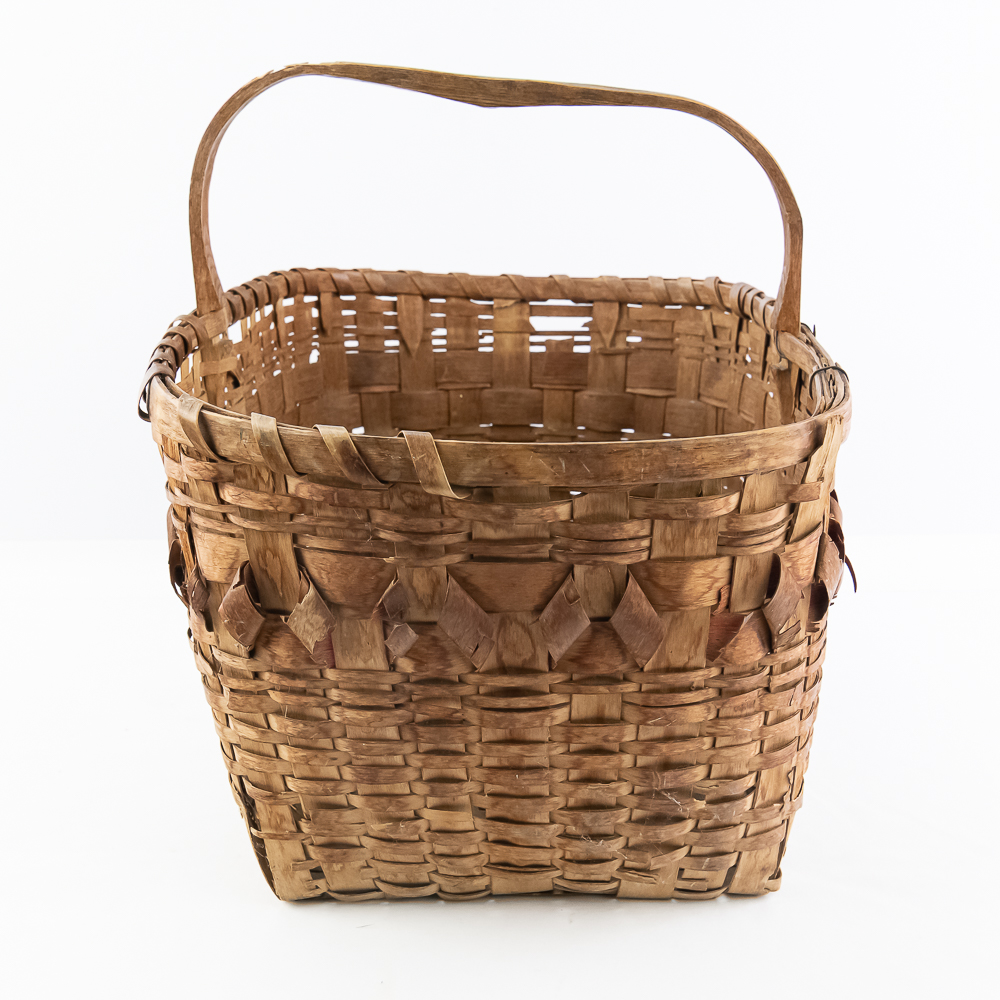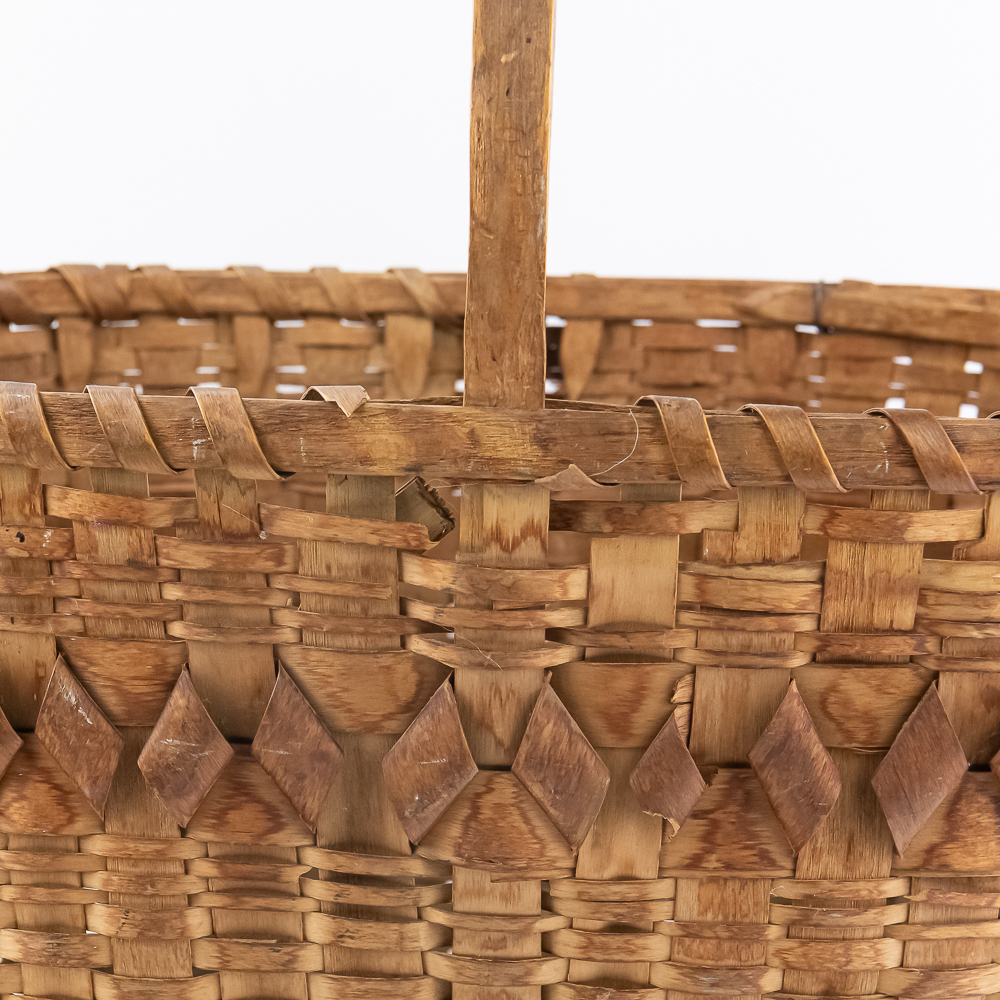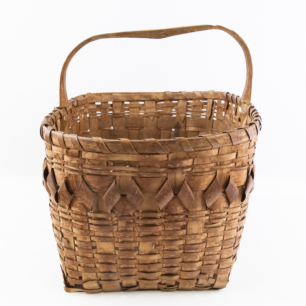 Traditional Winnebago or Ho-Chunk split oak basket these baskets are known for their distinctive woven pattern and sturdy construction featuring a handle for carrying. This basket features a rich patina from age, and there are many elements of the weave that are fragile. The bark is woven with a beautiful diamond pattern in a band around the upper portion of the basket. Dimensions are 13” wide x 17.75” long x 10” tall. Height with handle is approximately 15”.