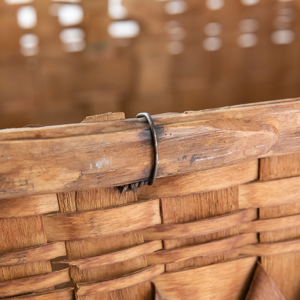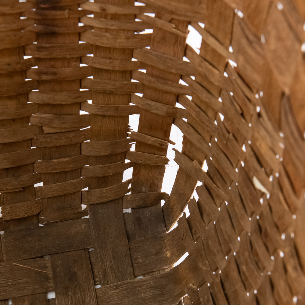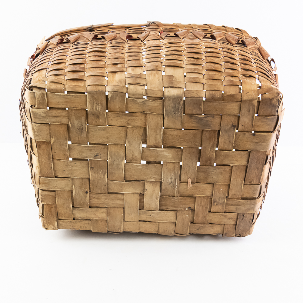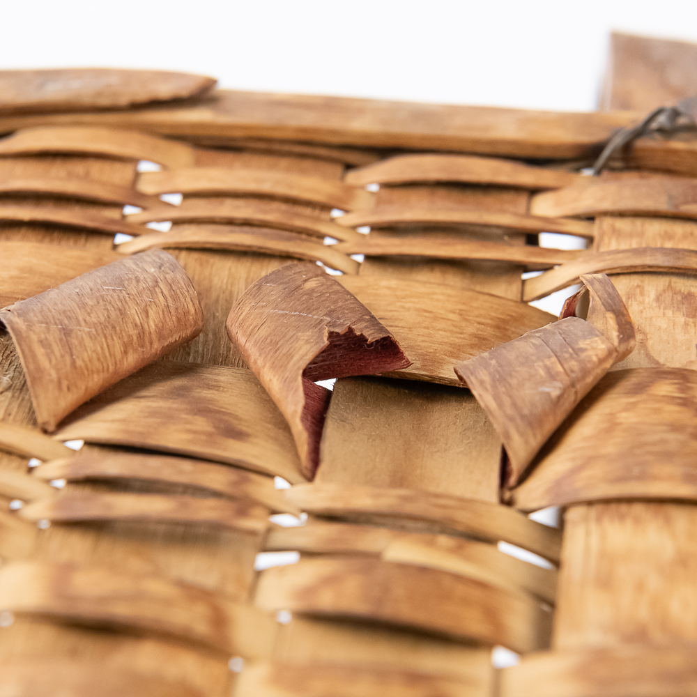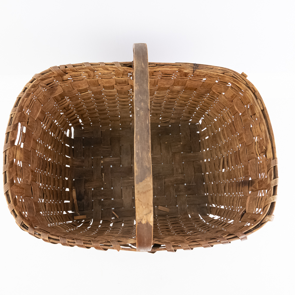 Traditional Winnebago or Ho-Chunk split oak basket these baskets are known for their distinctive woven pattern and sturdy construction featuring a handle for carrying. This basket features a rich patina from age, and there are many elements of the weave that are fragile. The bark is woven with a beautiful diamond pattern in a band around the upper portion of the basket. Dimensions are 13” wide x 17.75” long x 10” tall. Height with handle is approximately 15”.