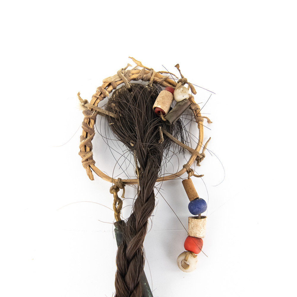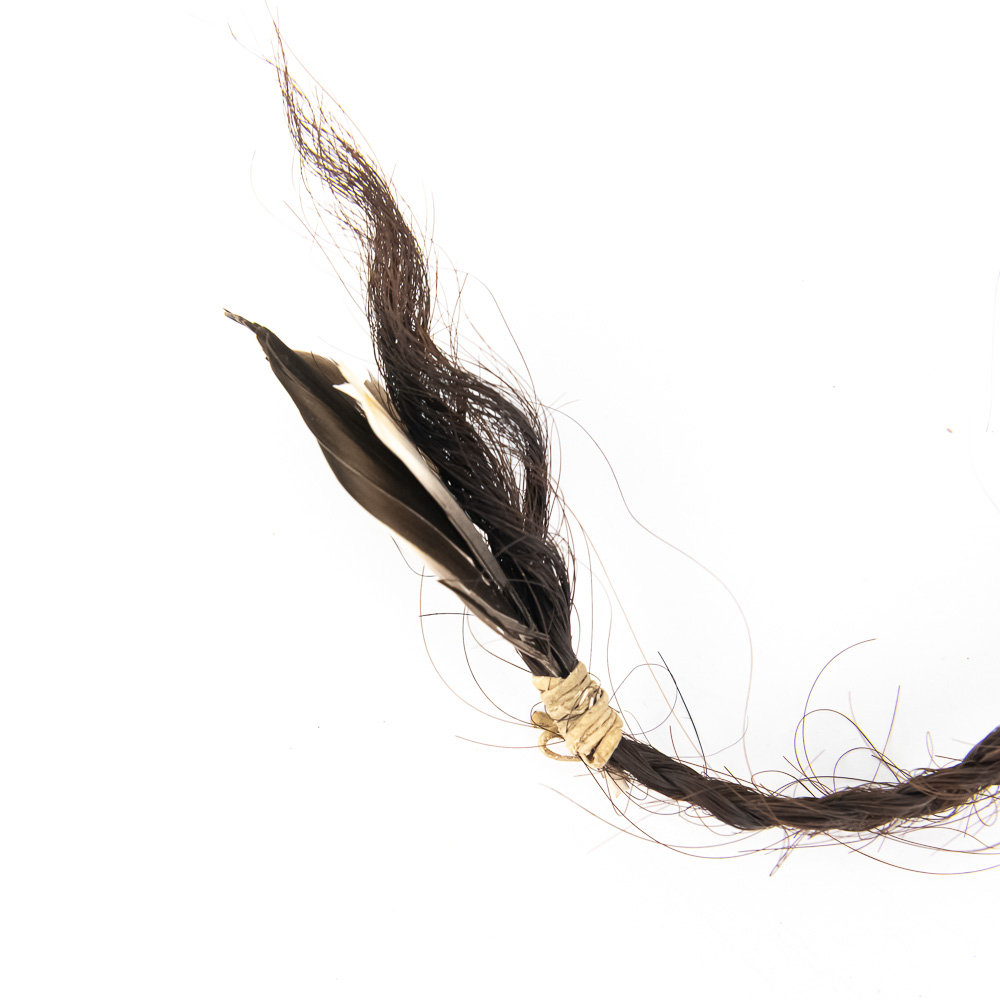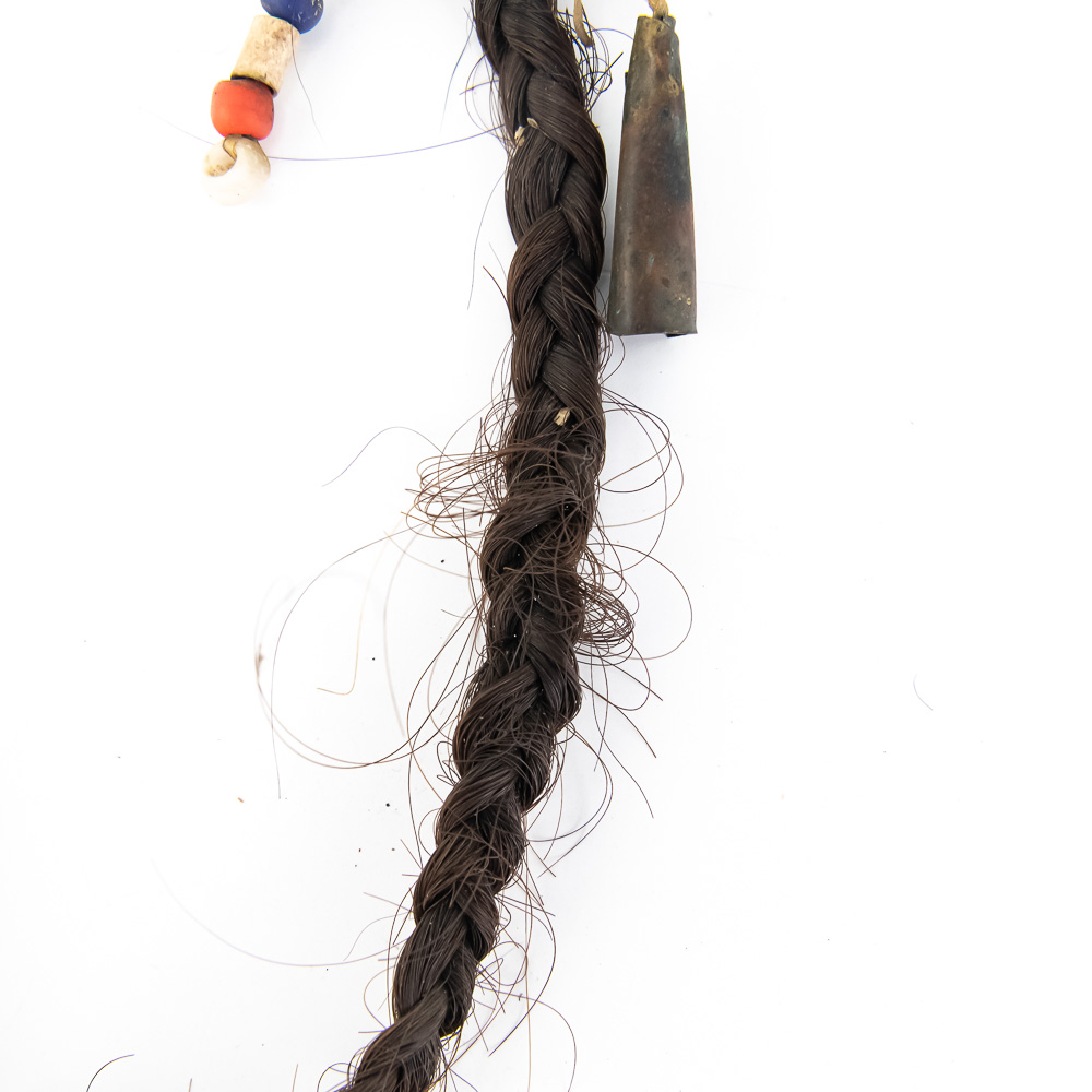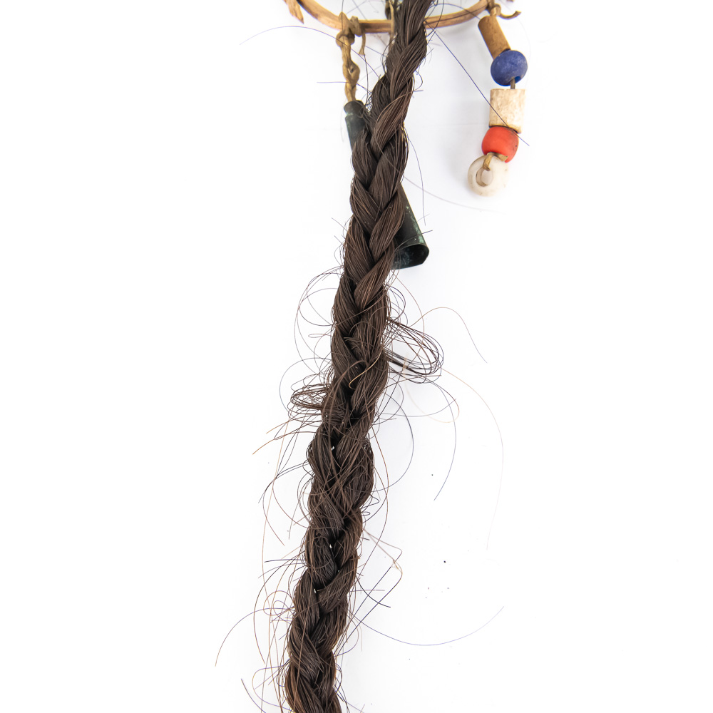 This intriguing piece appears to be a contemporary or vintage interpretation of a Native American style hair roach drop or dance ornament, sometimes also called a scalplock drop. These items are often attached to a dance roach or worn as an accessory, featuring a long braid of hair, traditionally horse or human, adorned with various materials. The piece is constructed around a small, wrapped organic hoop, from which dark, braided hair (likely horse or human) extends down. It is further embellished with a cluster of beads and bone or pipe-like hairpipe segments attached to the hoop, including pieces colored white, red, and blue, as well as a small, conical metal jingle or cone tassel. The long braid terminates with a tuft of hair and some small feathers secured with a simple wrapping. The aesthetic suggests a mid to late 20th-century souvenir or modern regalia item. The condition is generally fair, showing expected signs of age and handling, including loose fibers, wear on the braiding, some minor losses to the wrapping materials on the hoop, and some surface patina on the metal cone. Based on the provided user text, the total length is approximately: H 16″, W 3″, D 0.5″. From the Native American display in Donley’s Wild West Town.
