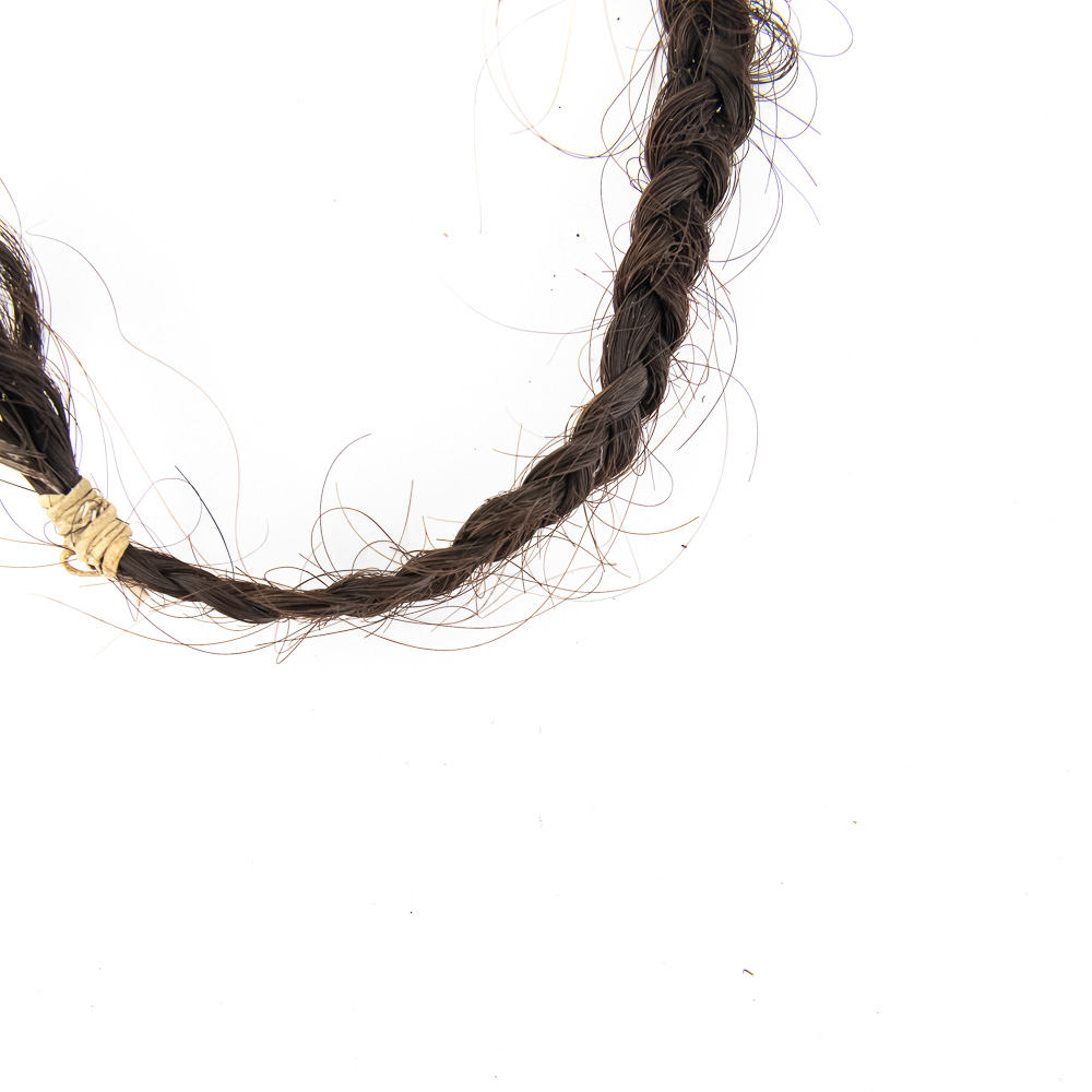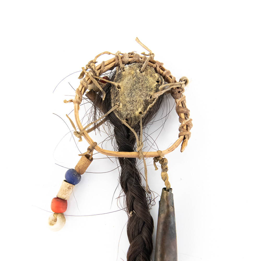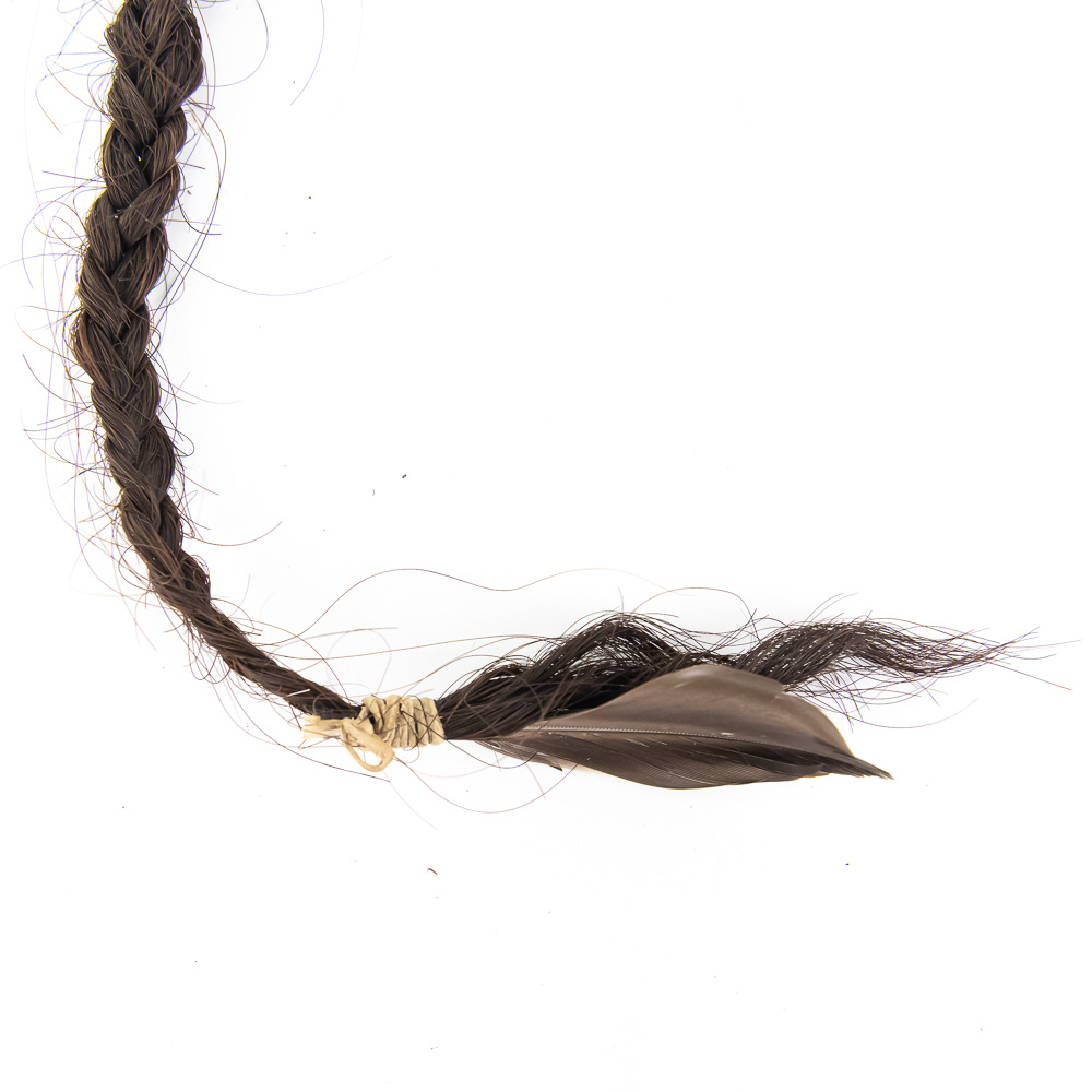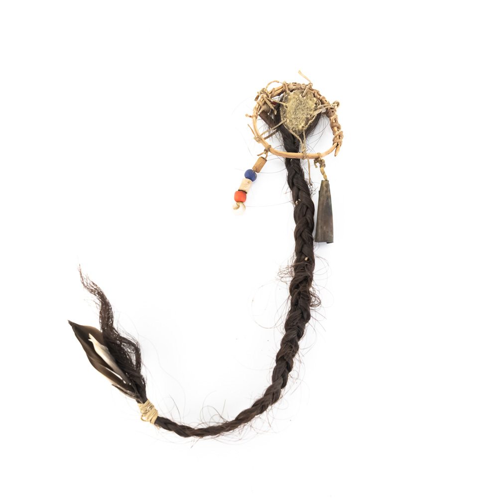 This intriguing piece appears to be a contemporary or vintage interpretation of a Native American style hair roach drop or dance ornament, sometimes also called a scalplock drop. These items are often attached to a dance roach or worn as an accessory, featuring a long braid of hair, traditionally horse or human, adorned with various materials. The piece is constructed around a small, wrapped organic hoop, from which dark, braided hair (likely horse or human) extends down. It is further embellished with a cluster of beads and bone or pipe-like hairpipe segments attached to the hoop, including pieces colored white, red, and blue, as well as a small, conical metal jingle or cone tassel. The long braid terminates with a tuft of hair and some small feathers secured with a simple wrapping. The aesthetic suggests a mid to late 20th-century souvenir or modern regalia item. The condition is generally fair, showing expected signs of age and handling, including loose fibers, wear on the braiding, some minor losses to the wrapping materials on the hoop, and some surface patina on the metal cone. Based on the provided user text, the total length is approximately: H 16″, W 3″, D 0.5″. From the Native American display in Donley’s Wild West Town.