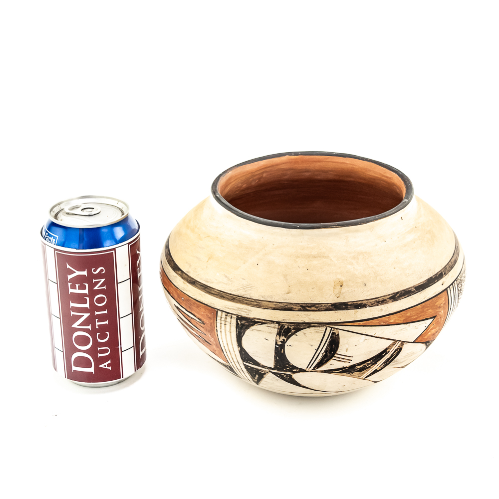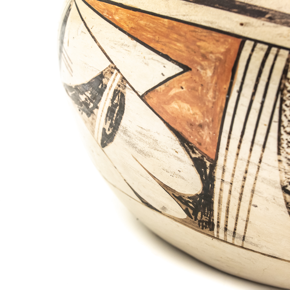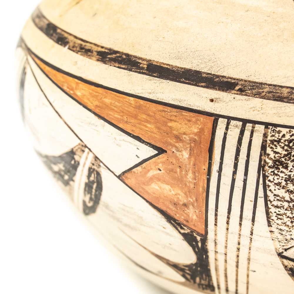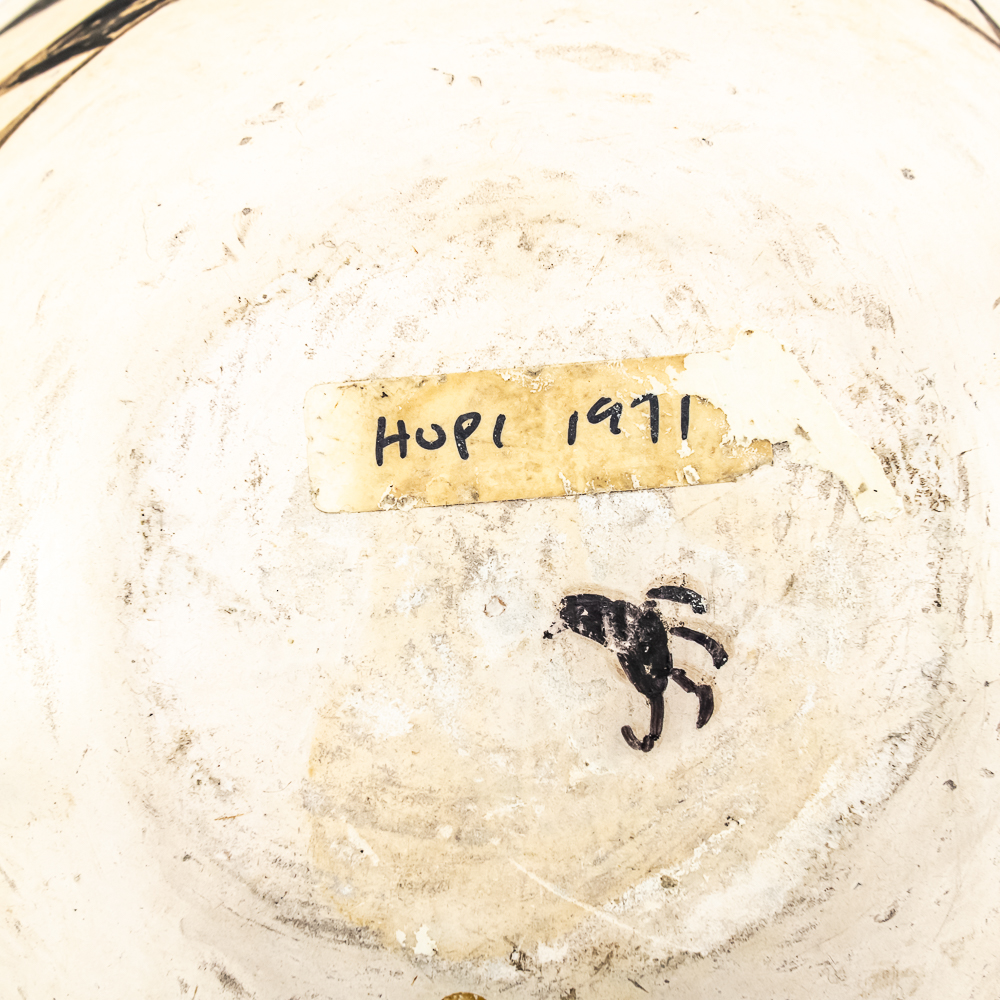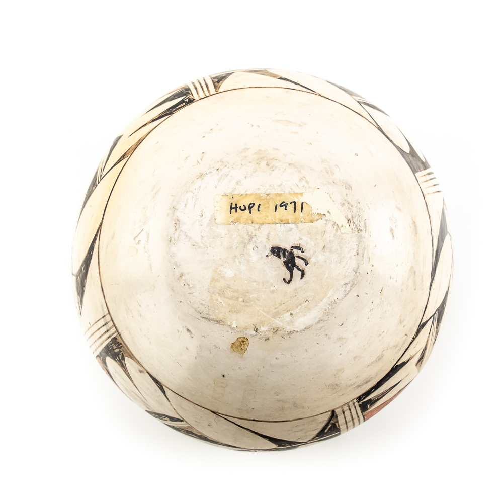 Vintage Hopi hand coiled, polychrome pot. Decorated with red and black designs typical of Hopi pottery. Decoration, specifically the dark features exhibit varying levels of either completion or touch up. There are no cracks present in the pot. Base of pot has pictogram in black and affixed label that reads “Hopi 1971” as well as dried residue from display putty. Dimensions: 8.5” widest point. Rim diameter 5”. Height: 5.25”. See photos.