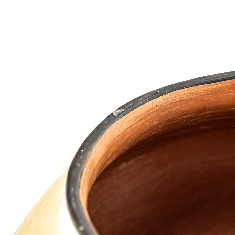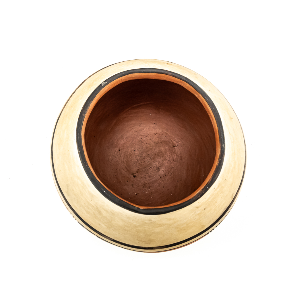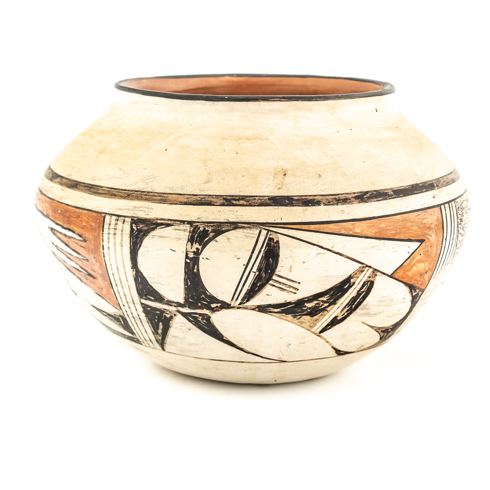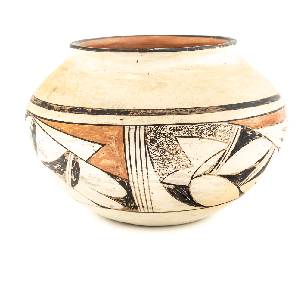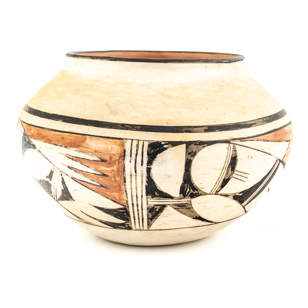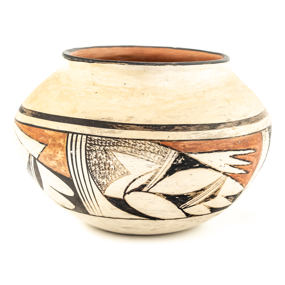 Vintage Hopi hand coiled, polychrome pot. Decorated with red and black designs typical of Hopi pottery. Decoration, specifically the dark features exhibit varying levels of either completion or touch up. There are no cracks present in the pot. Base of pot has pictogram in black and affixed label that reads “Hopi 1971” as well as dried residue from display putty. Dimensions: 8.5” widest point. Rim diameter 5”. Height: 5.25”. See photos.