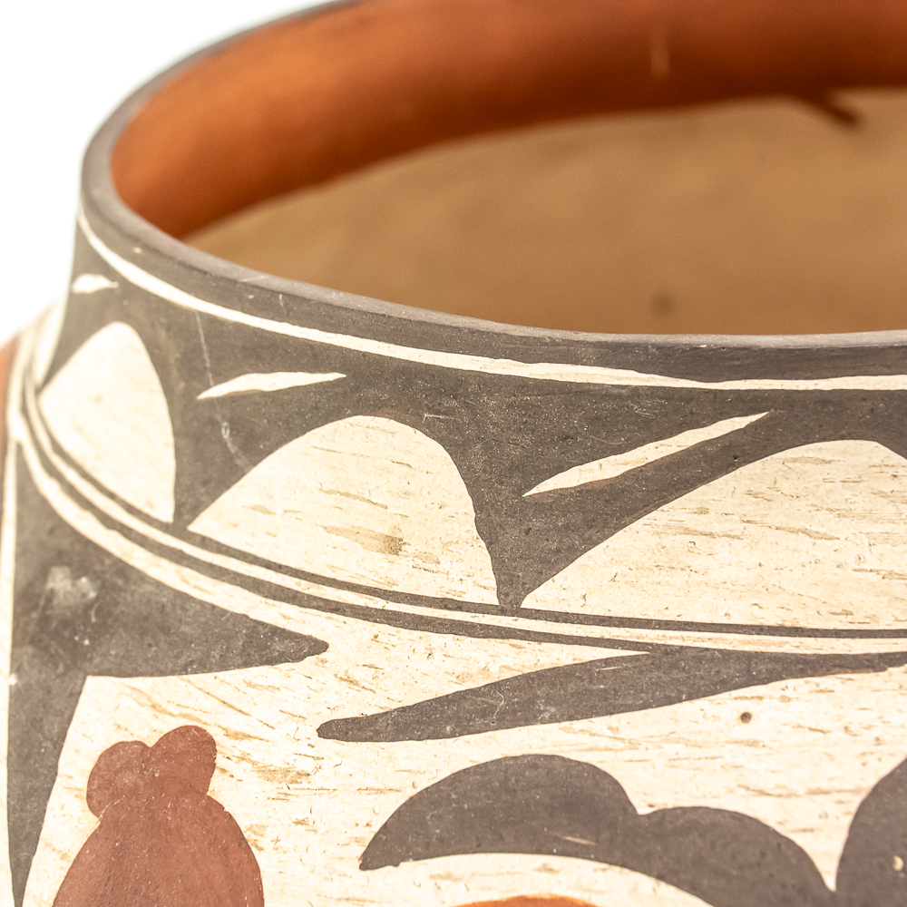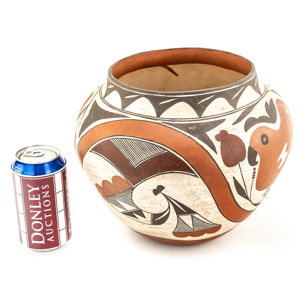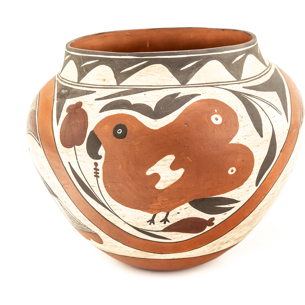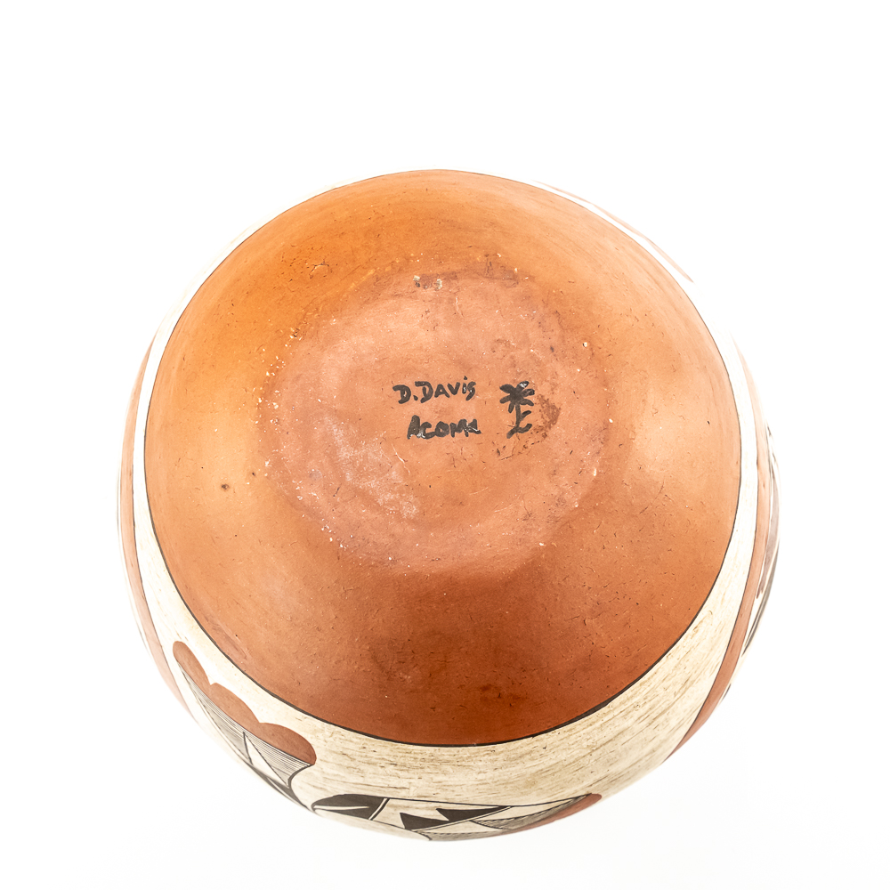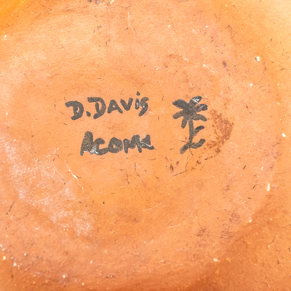 This four-color polychrome pot was made at Acoma Pueblo, NM, and attributed to the 1950s. It is a two parrot design with colors and imagery typical of pottery from Acoma. The colors featured are orange, black, dark red, and white background. At the base it is signed “D. Davis Acoma” with a pictogram beside it. Condition is very good, with no damage visible. Dimensions: 11” at widest, 6.5” diameter rim, 8.25” tall and base diameter approximately 3.5”. Please see photos.