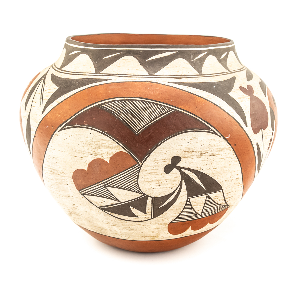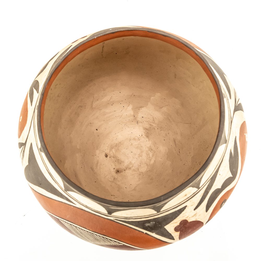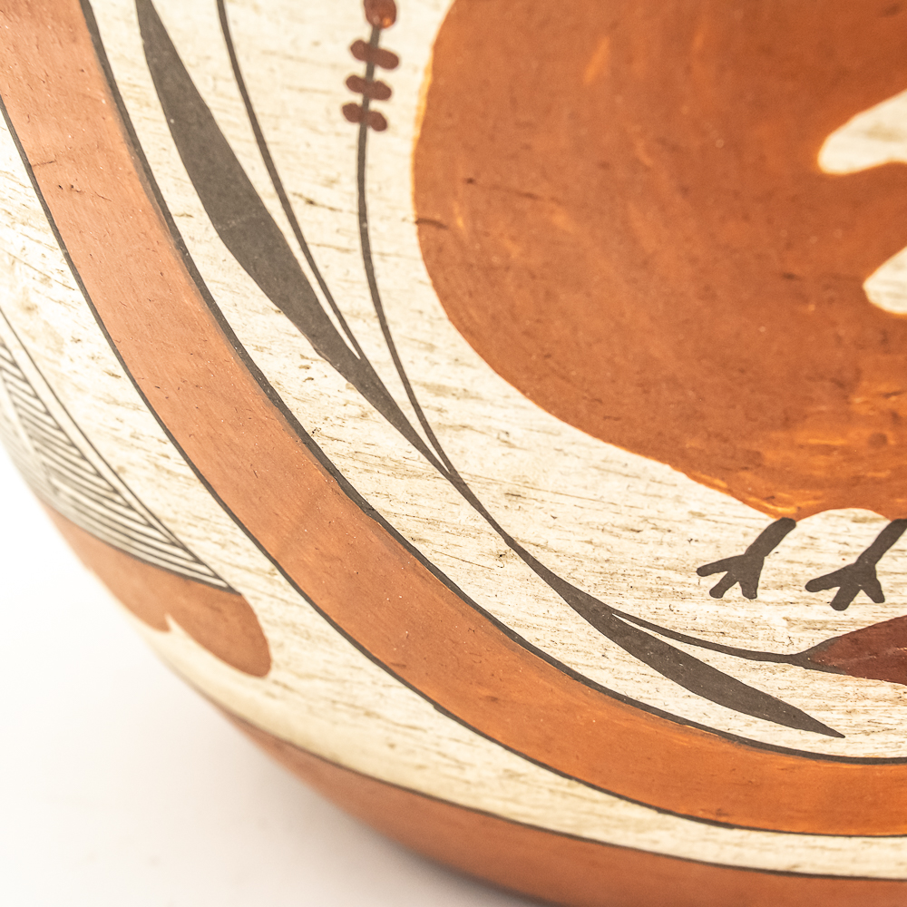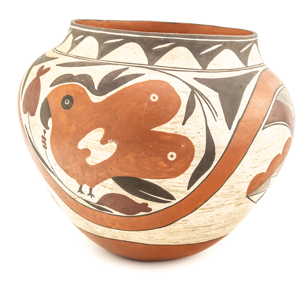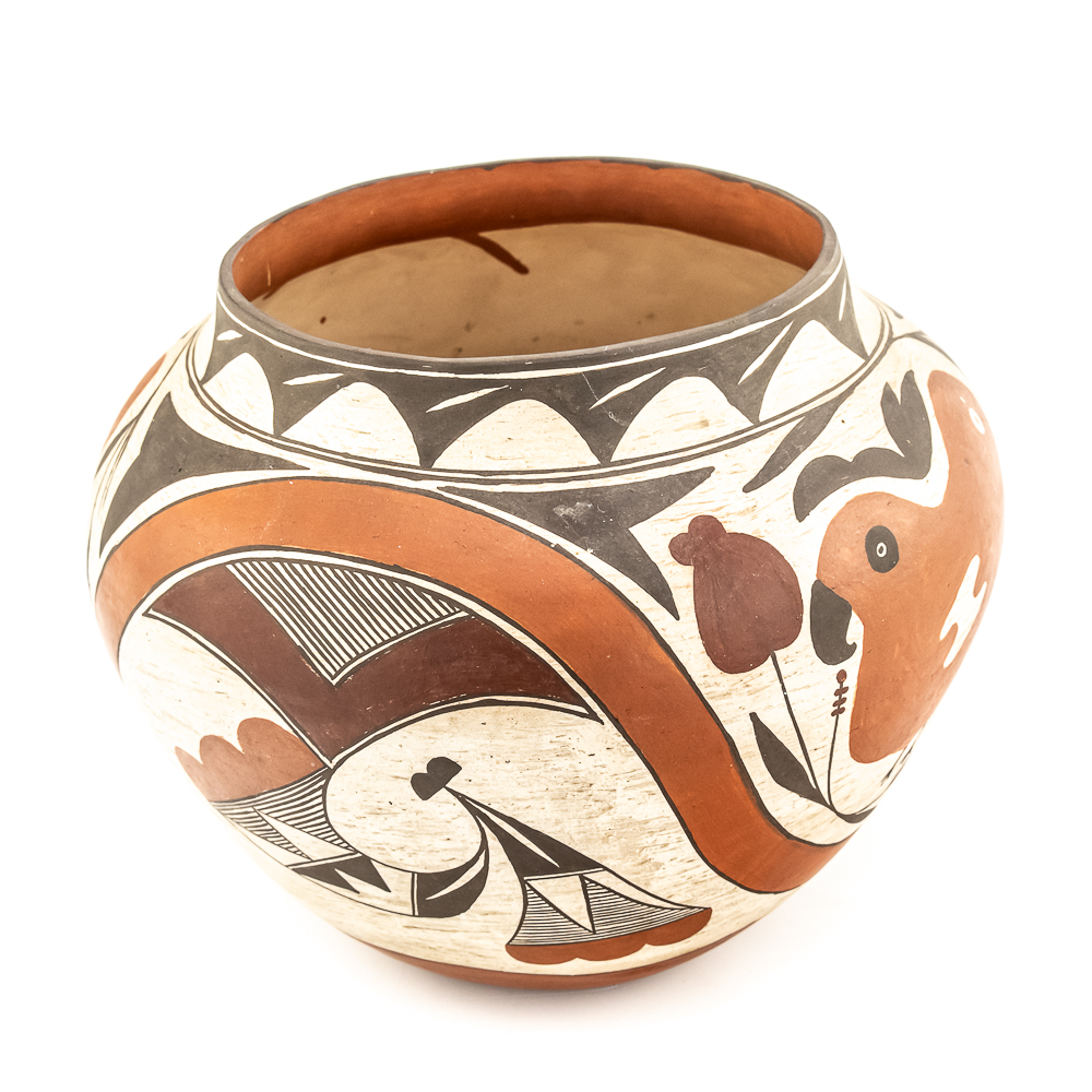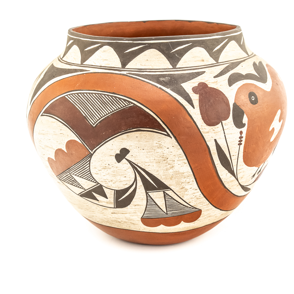 This four-color polychrome pot was made at Acoma Pueblo, NM, and attributed to the 1950s. It is a two parrot design with colors and imagery typical of pottery from Acoma. The colors featured are orange, black, dark red, and white background. At the base it is signed “D. Davis Acoma” with a pictogram beside it. Condition is very good, with no damage visible. Dimensions: 11” at widest, 6.5” diameter rim, 8.25” tall and base diameter approximately 3.5”. Please see photos.