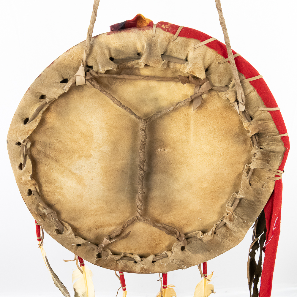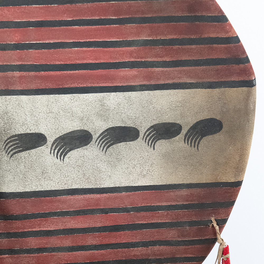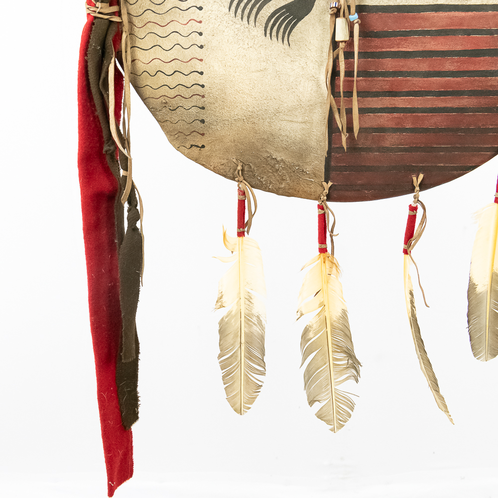 This is a Blackfeet Indian painted war shield, circa 1920s. The shield is constructed from brain-tanned leather stretched over a hoop measuring 21” in diameter. It features original paint depicting horizontal red stripes on the right half and central design of stylized animal on the left. A small medicine pouch attached to the center. Feather drops suspended from the bottom edge and trade cloth drop attached to the side. Such shields held practical and spiritual significance used for protection in battle and as a canvas for personal and tribal symbolism. The Blackfeet were known as fierce warriors and their shields were important expressions of their identity and beliefs. Dimensions overall: 35” x23” x2”. Please see photos.