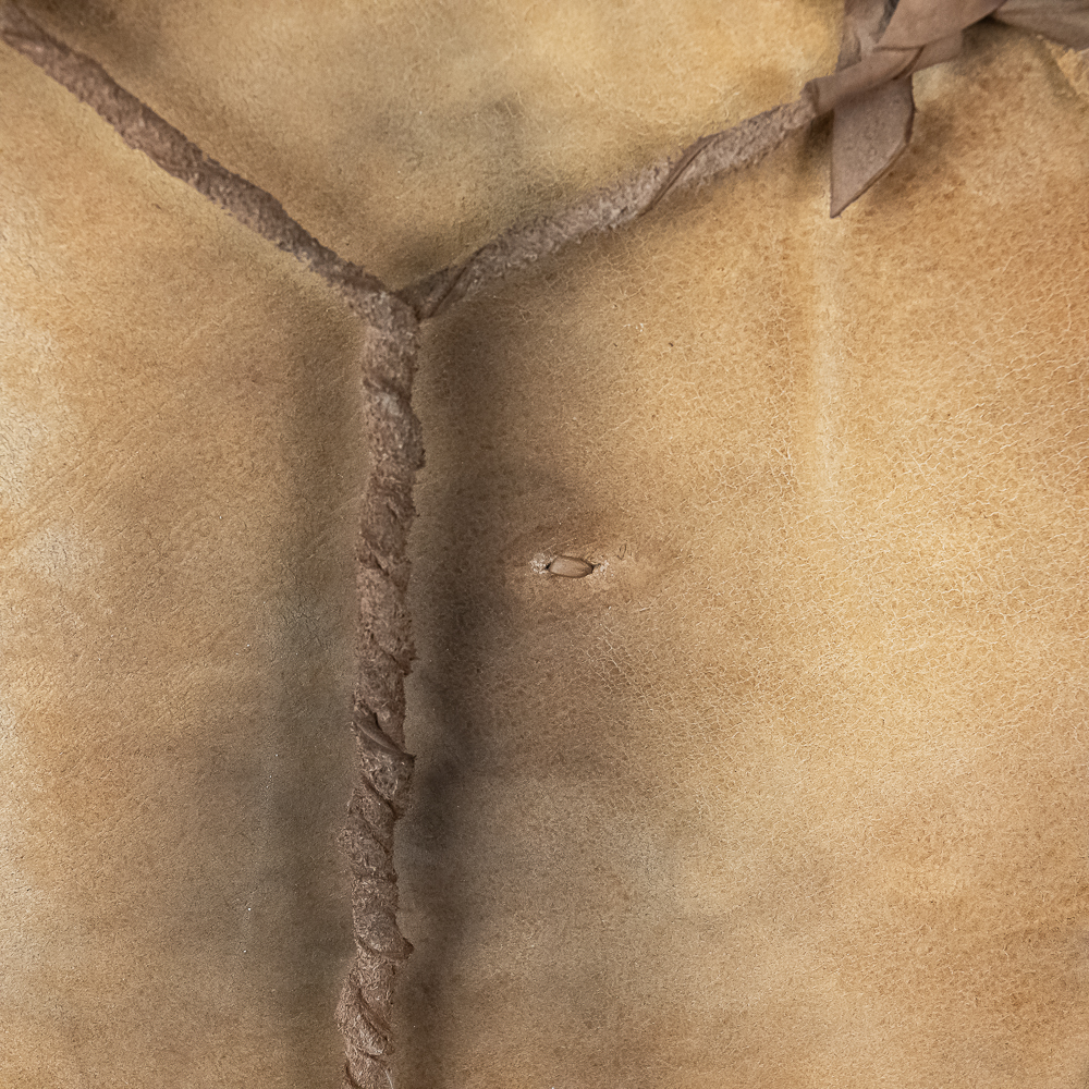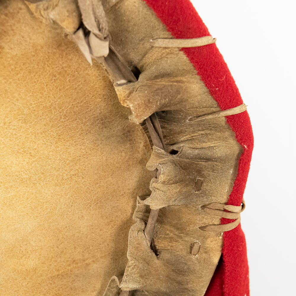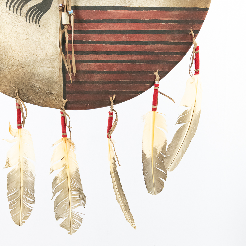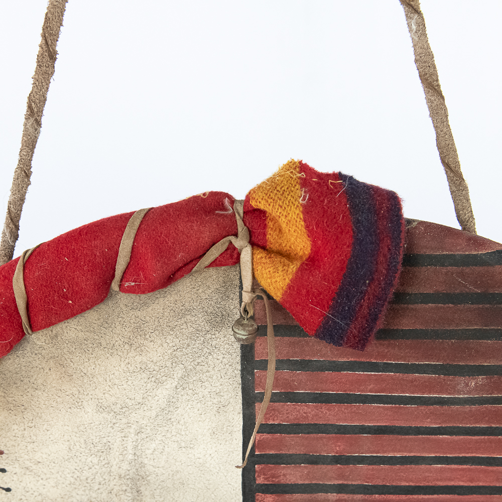 This is a Blackfeet Indian painted war shield, circa 1920s. The shield is constructed from brain-tanned leather stretched over a hoop measuring 21” in diameter. It features original paint depicting horizontal red stripes on the right half and central design of stylized animal on the left. A small medicine pouch attached to the center. Feather drops suspended from the bottom edge and trade cloth drop attached to the side. Such shields held practical and spiritual significance used for protection in battle and as a canvas for personal and tribal symbolism. The Blackfeet were known as fierce warriors and their shields were important expressions of their identity and beliefs. Dimensions overall: 35” x23” x2”. Please see photos.