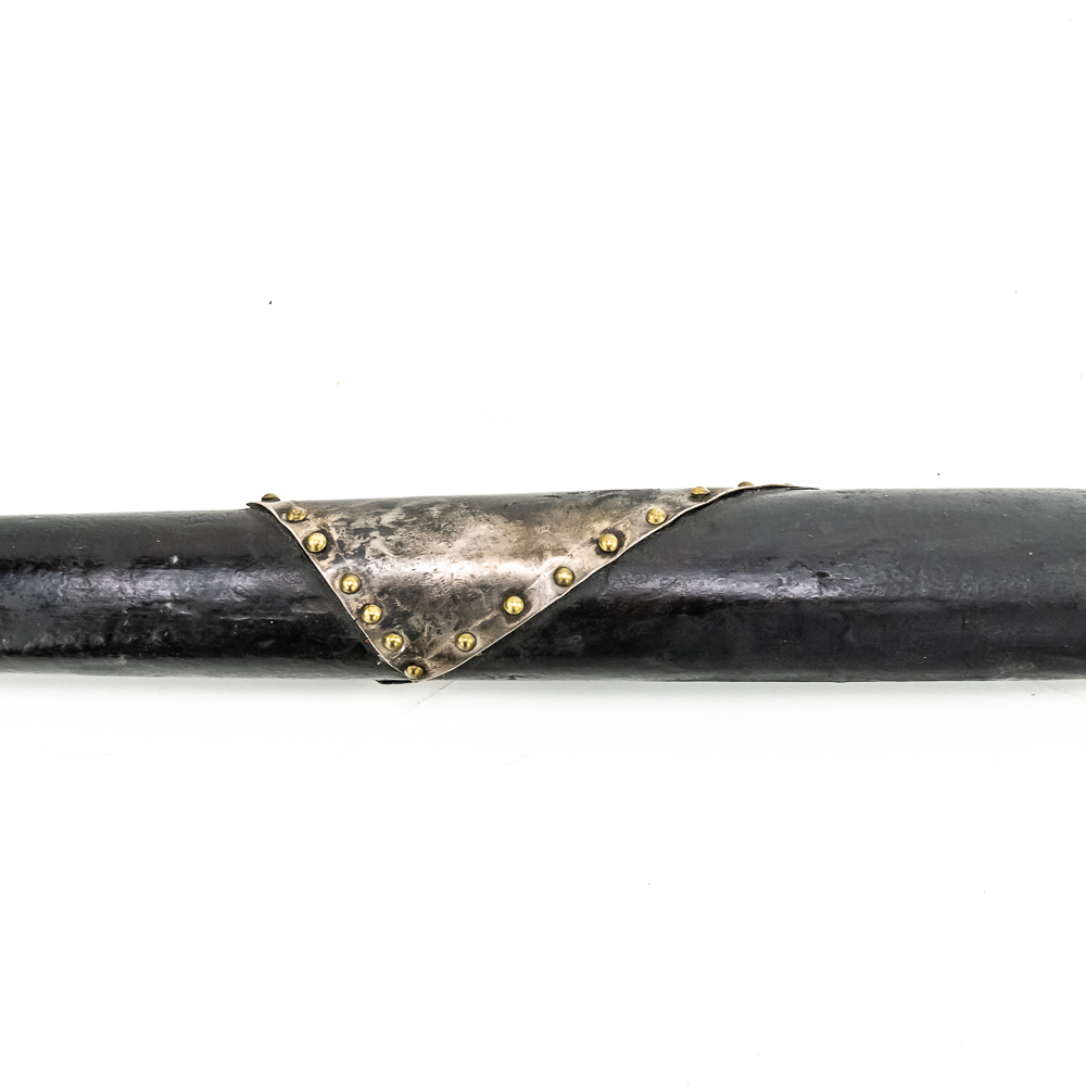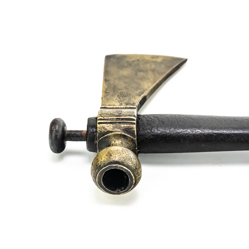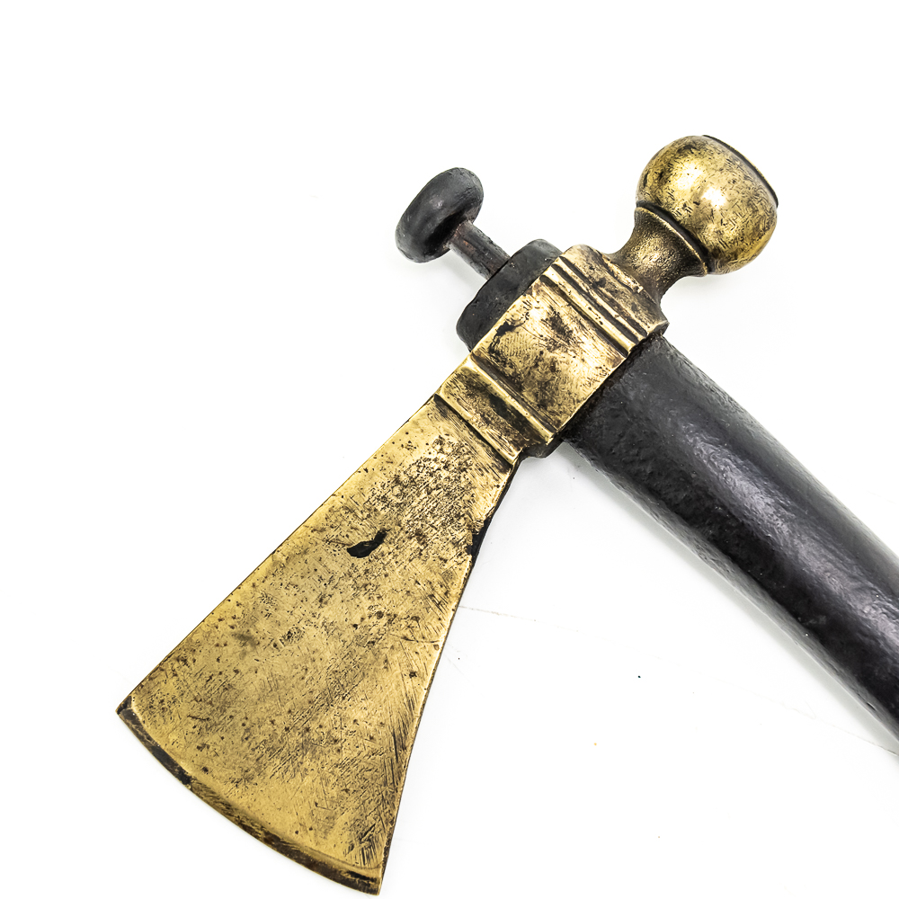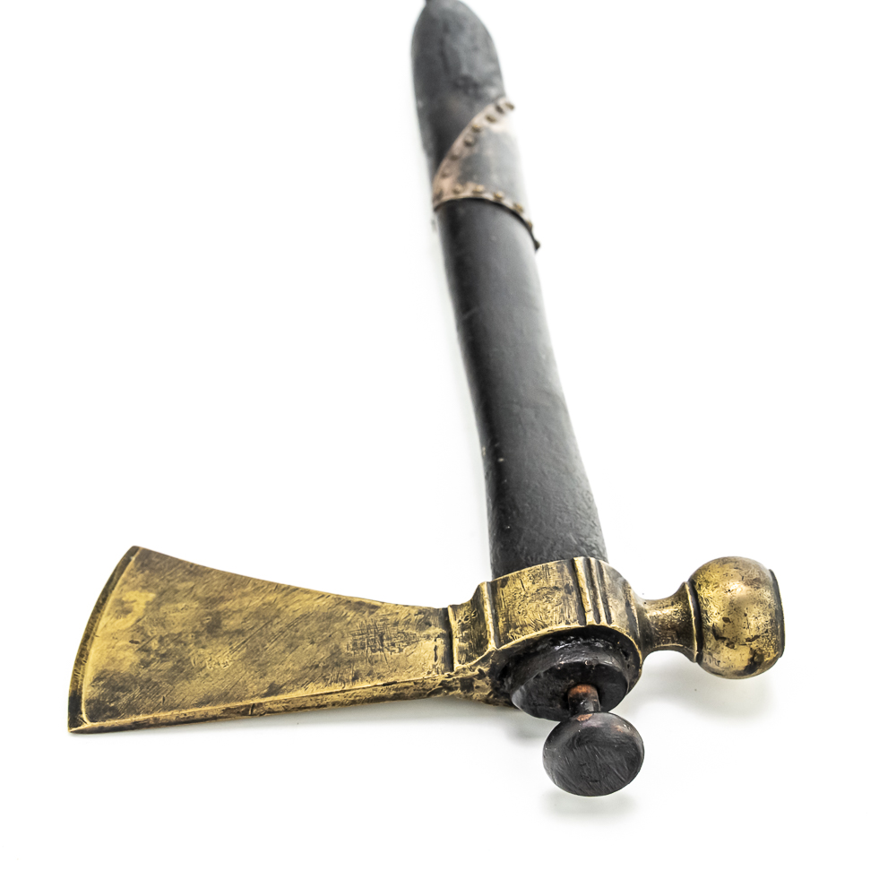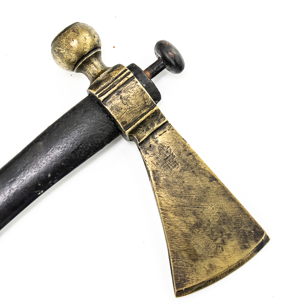 Brass head tomahawk circa 1860s. The head features pronounced ridges where it is hafted to the handle. The bowl is beautifully turned and has a nice appealing shape. The original leather gasket is still present where the axe head is halted to the handle. A wooden plug is inserted into the top of the handle and can be removed. The handle itself is a dark hardwood. On the grip is a 4 sided piece of metal wrapped around the handle and tacked onto it with small brass tacks. The base of the handle has a mouthpiece that is long and looks to have been repaired at some point. Good condition. Dimensions: 17” long (including removable plug). Axe head length: 6.5”. Blade height: 2.5”. Please see photos.