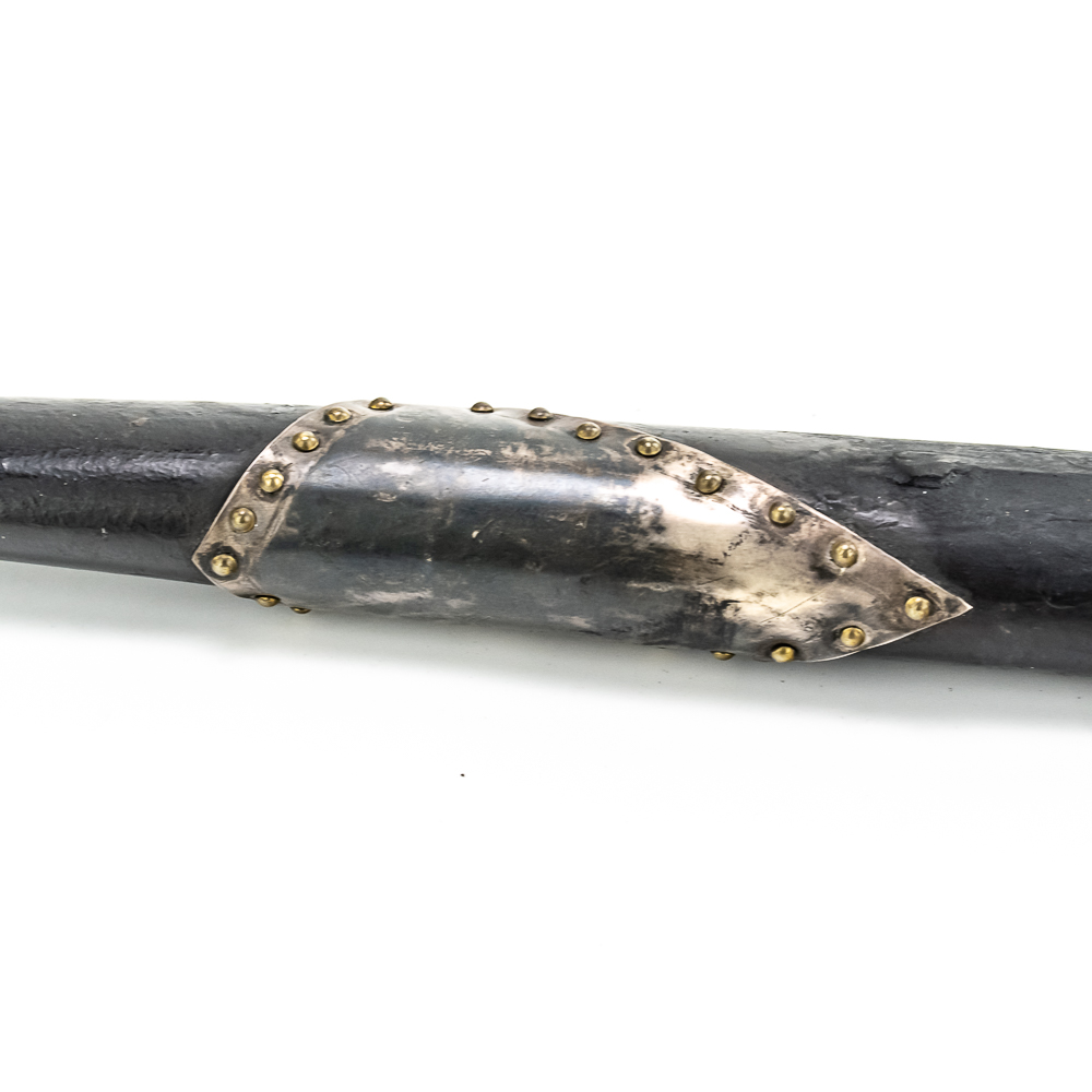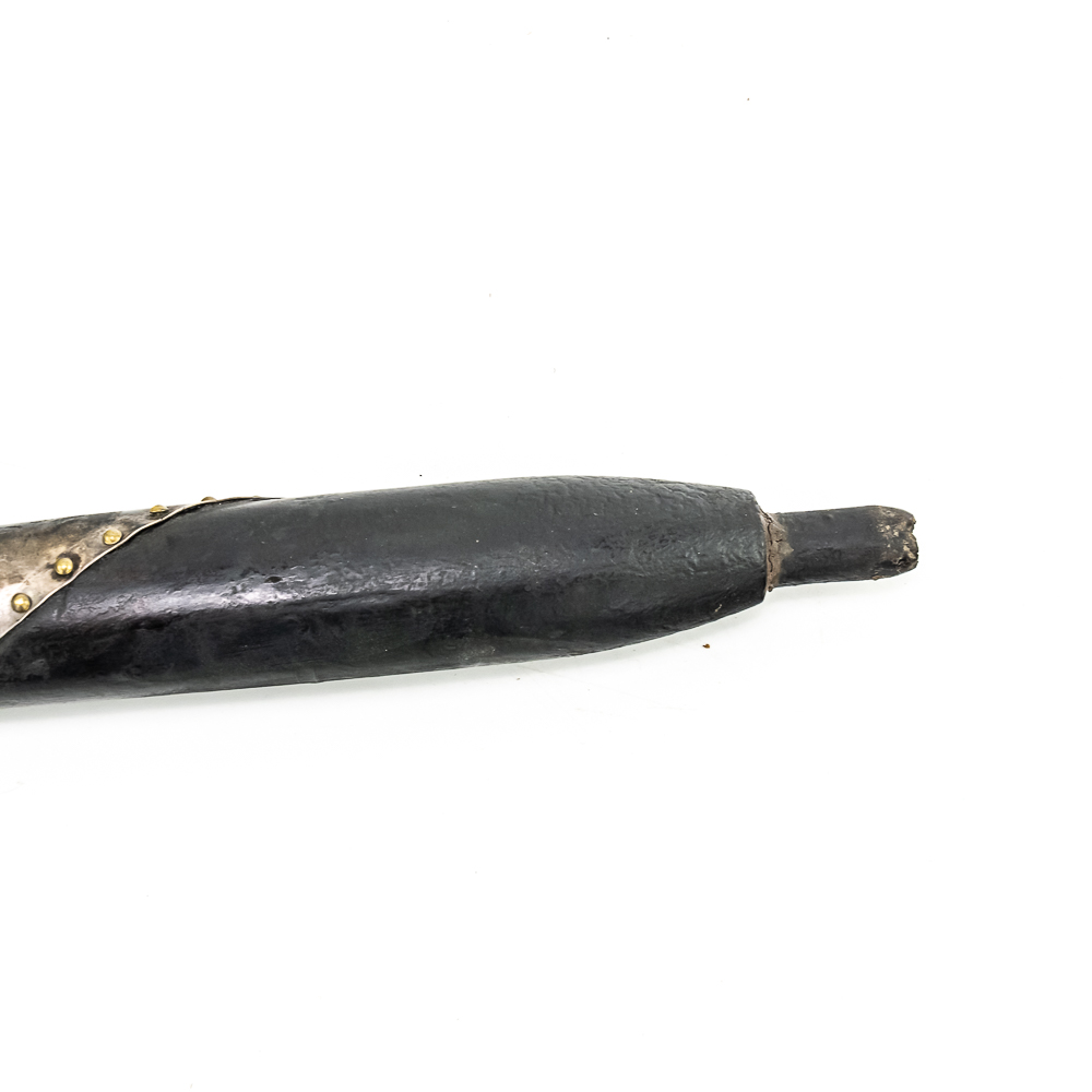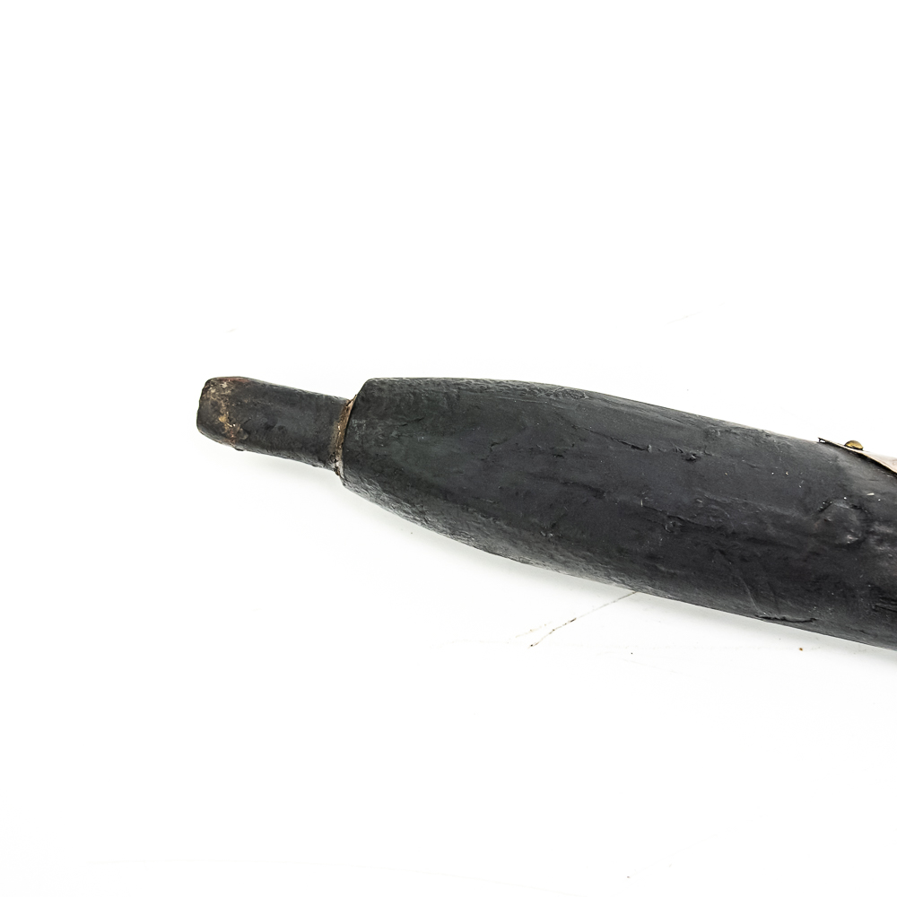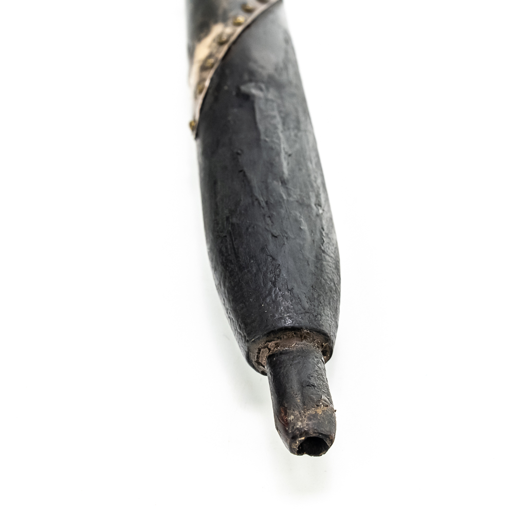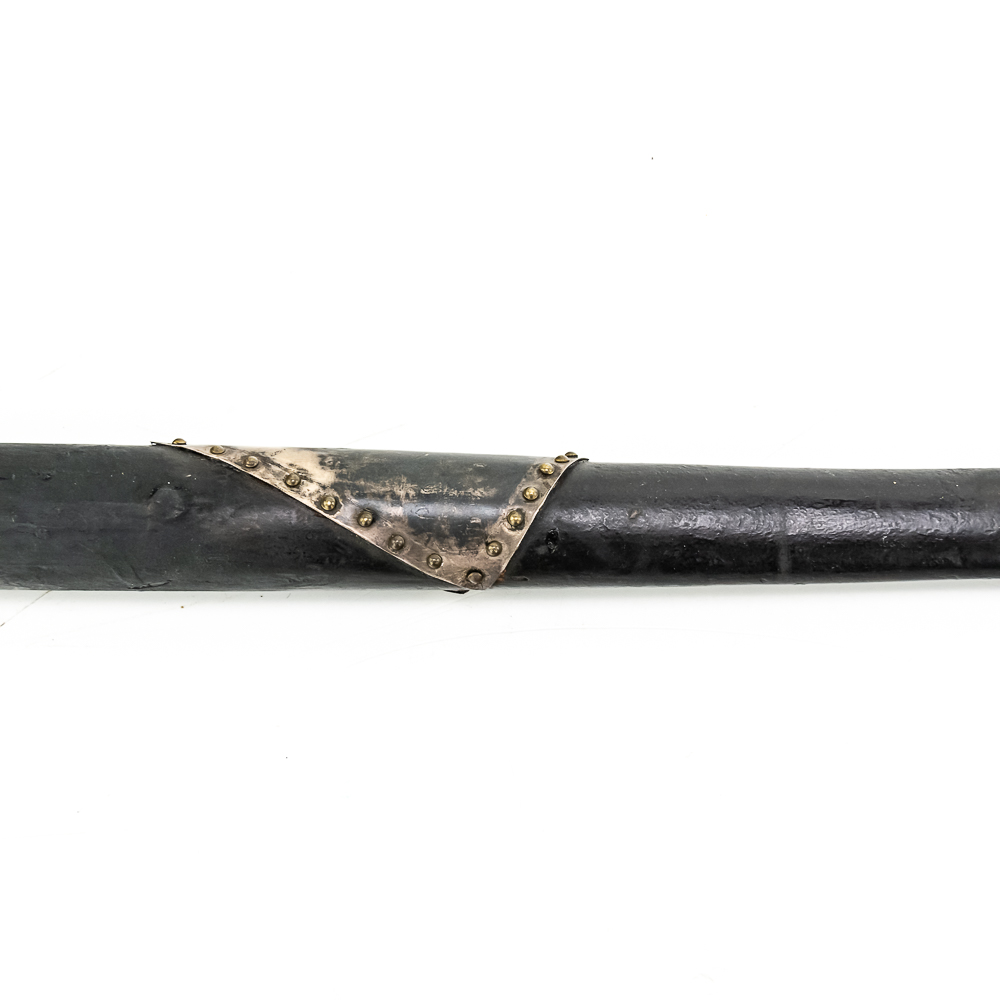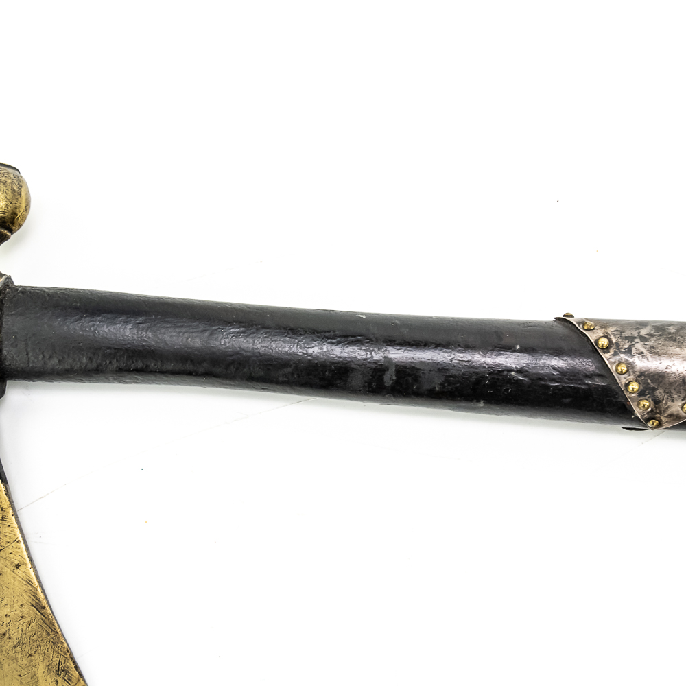 Brass head tomahawk circa 1860s. The head features pronounced ridges where it is hafted to the handle. The bowl is beautifully turned and has a nice appealing shape. The original leather gasket is still present where the axe head is halted to the handle. A wooden plug is inserted into the top of the handle and can be removed. The handle itself is a dark hardwood. On the grip is a 4 sided piece of metal wrapped around the handle and tacked onto it with small brass tacks. The base of the handle has a mouthpiece that is long and looks to have been repaired at some point. Good condition. Dimensions: 17” long (including removable plug). Axe head length: 6.5”. Blade height: 2.5”. Please see photos.