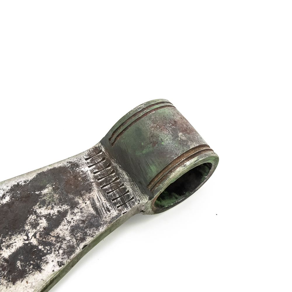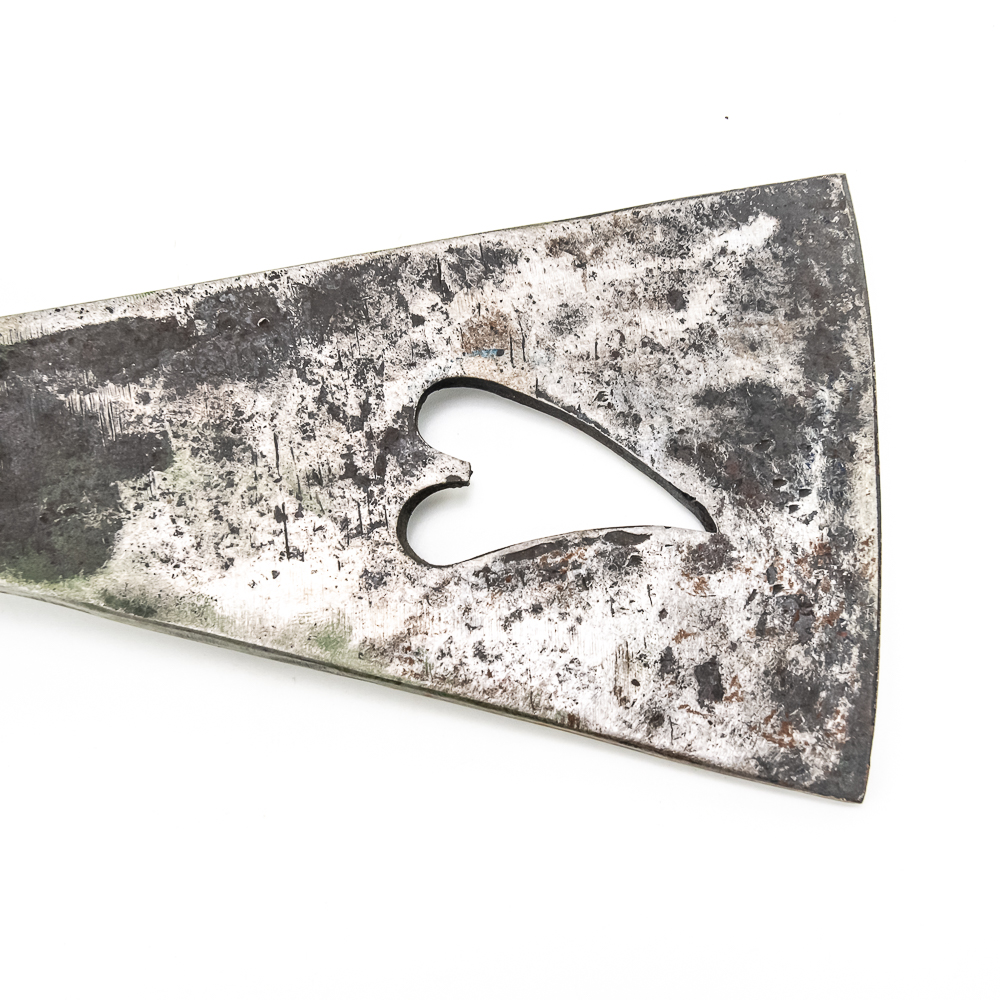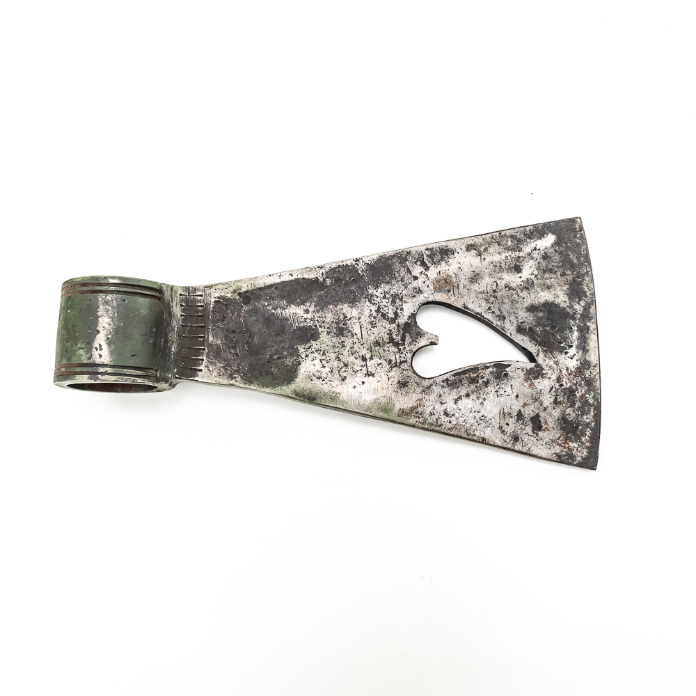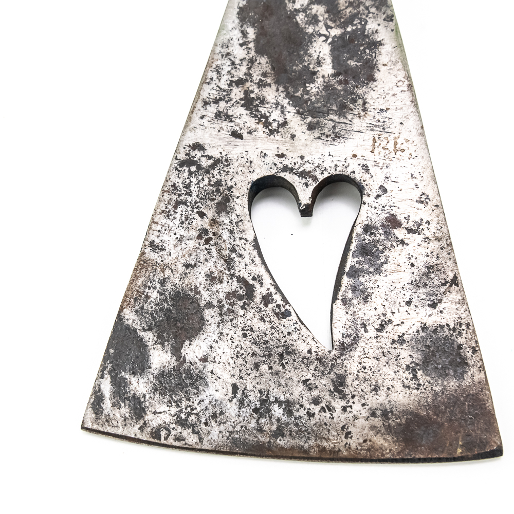Iron axe head circa late 19th early 20th century period heart-shaped cut out in center of blade. Line decoration near shaft and around shaft ring. Dimensions: 8.25” long, 4” height, Shaft diameter for handle:1.25” Good condition. See photos.