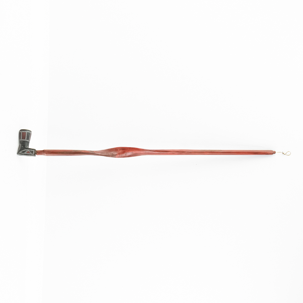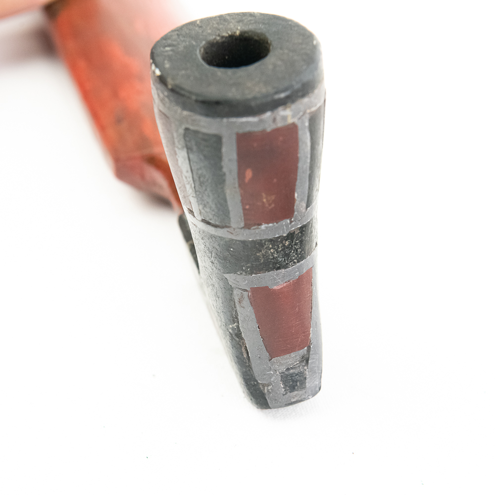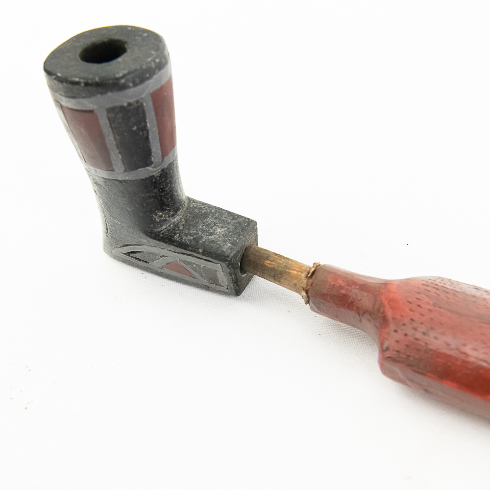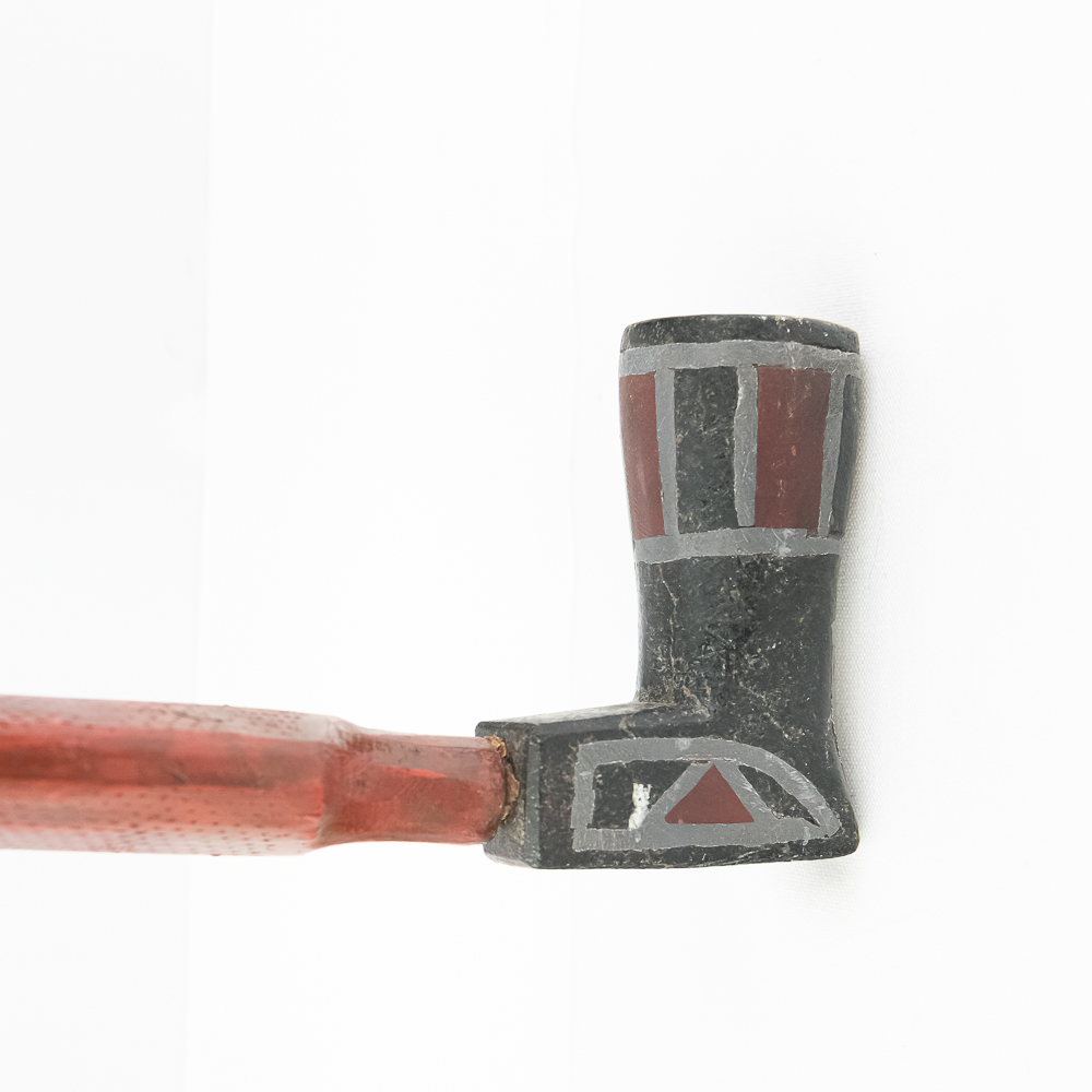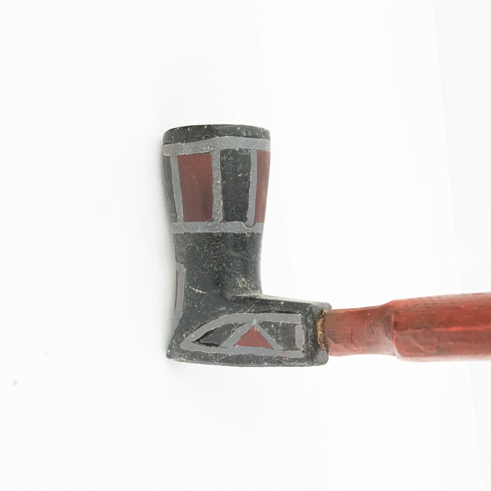 Northern Plains Indian pipe carved from black Steatite stone with Catlinite and lead geometric inlay. The pipe bowl is predominately vertical, with the horizontal base being shorter than it is tall. The bowl has Catlinite and lead inlay decoration throughout. The stem is wooden and is predominately flat with two spiral twists. The wood hue is red and has pressed file and stippled accents throughout. Good condition. Scuffs on bowl commensurate with age and use. Dimensions: 31.5” long x 1.75” wide overall. Pipe effigy: 3.25” tall x 2.25” long. Stem 29” long. A brass wire runs through the pipe from mouthpiece to the bowl for mounting vertical on a wall. See photos.