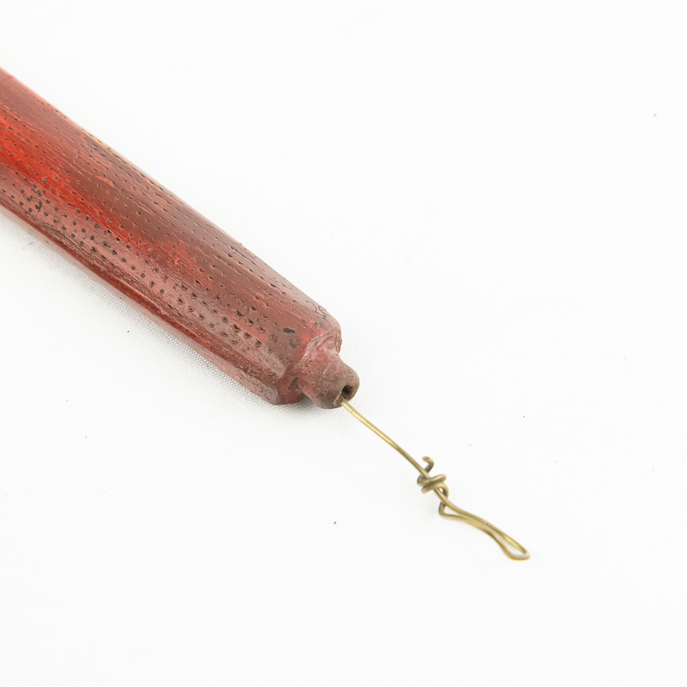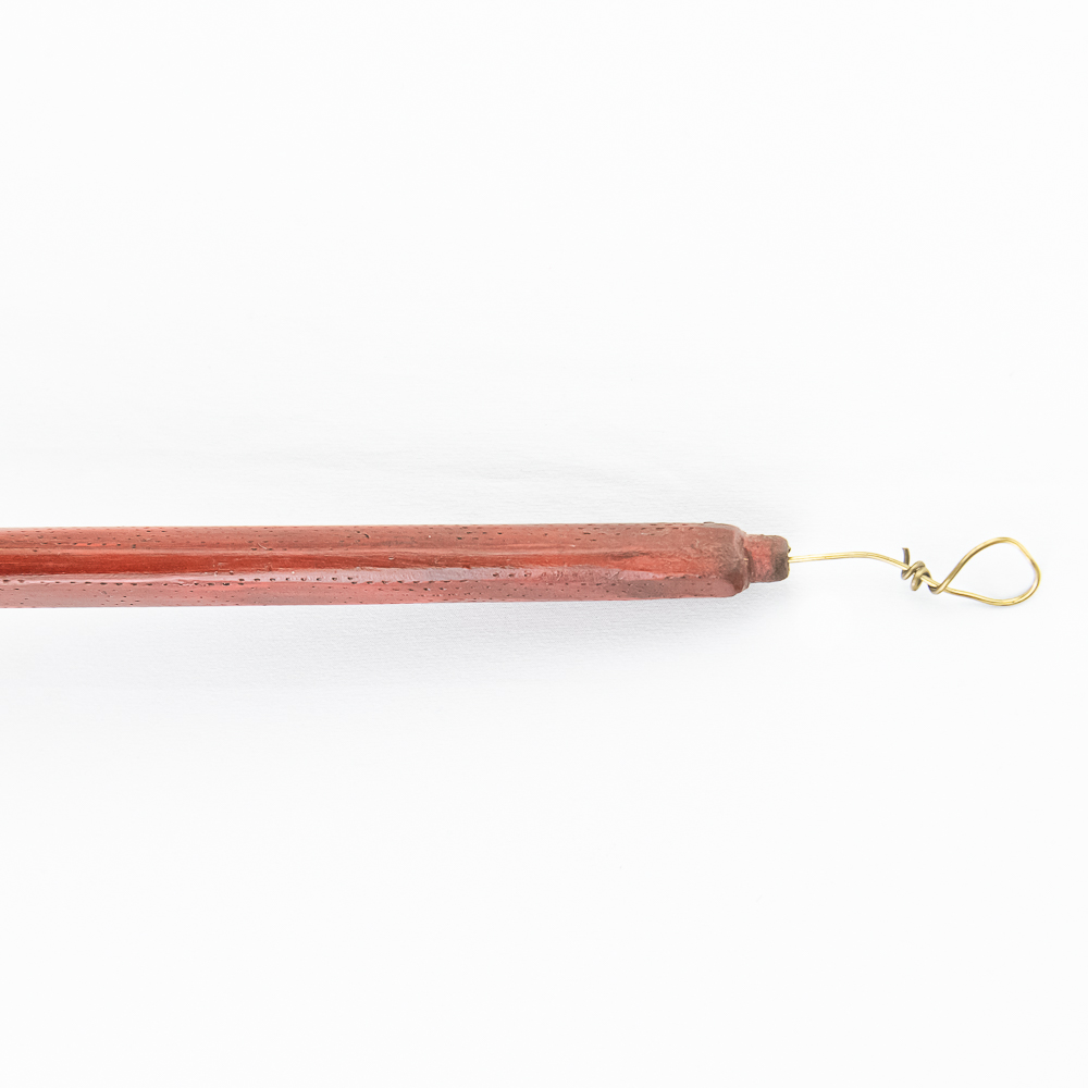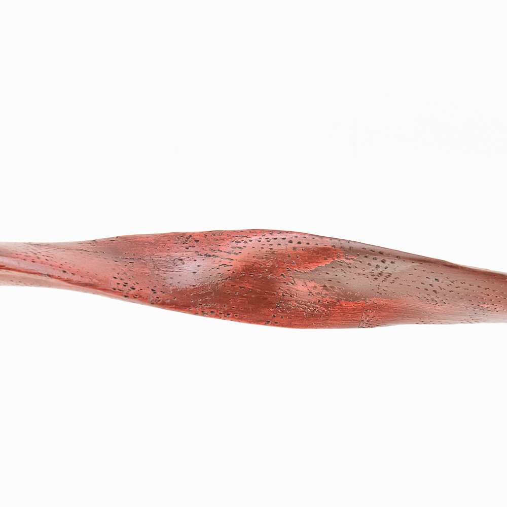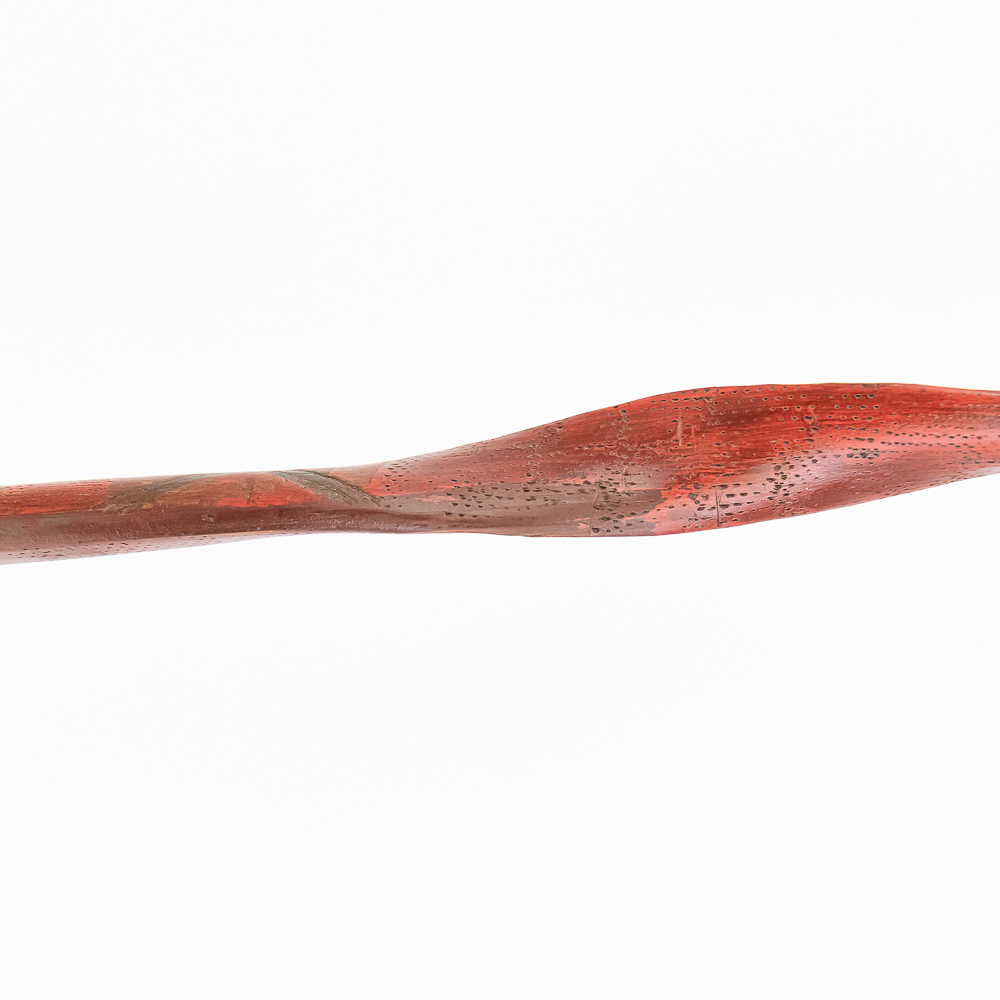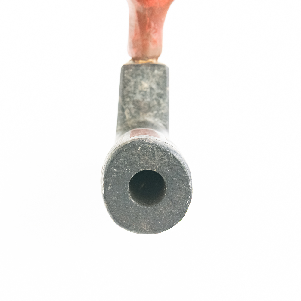 Northern Plains Indian pipe carved from black Steatite stone with Catlinite and lead geometric inlay. The pipe bowl is predominately vertical, with the horizontal base being shorter than it is tall. The bowl has Catlinite and lead inlay decoration throughout. The stem is wooden and is predominately flat with two spiral twists. The wood hue is red and has pressed file and stippled accents throughout. Good condition. Scuffs on bowl commensurate with age and use. Dimensions: 31.5” long x 1.75” wide overall. Pipe effigy: 3.25” tall x 2.25” long. Stem 29” long. A brass wire runs through the pipe from mouthpiece to the bowl for mounting vertical on a wall. See photos.