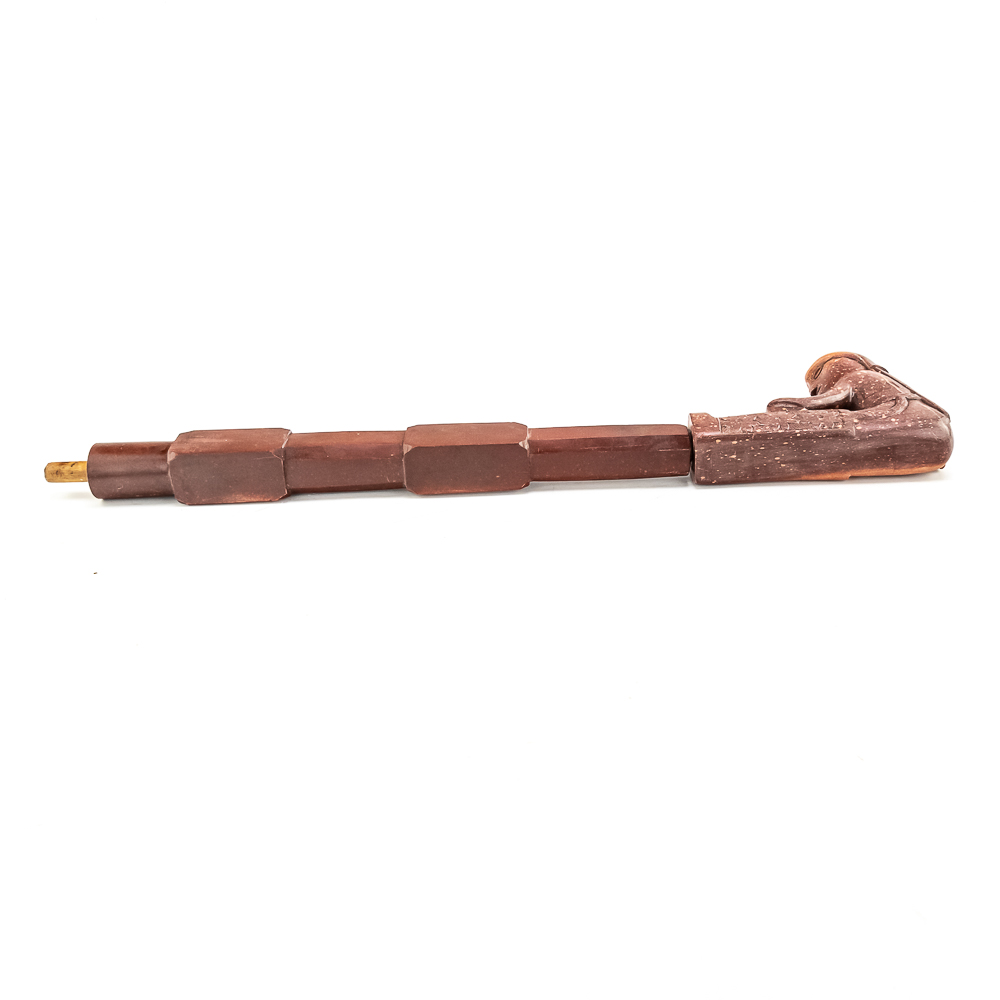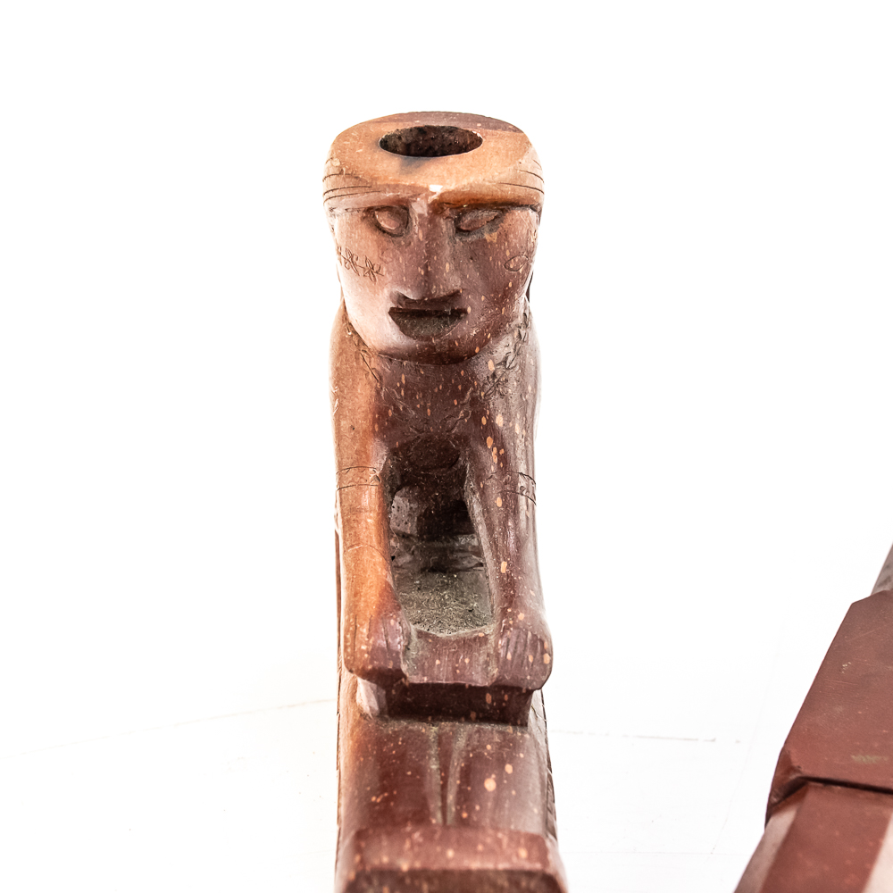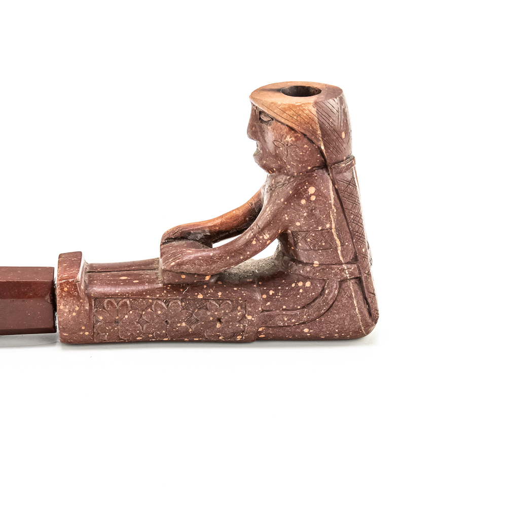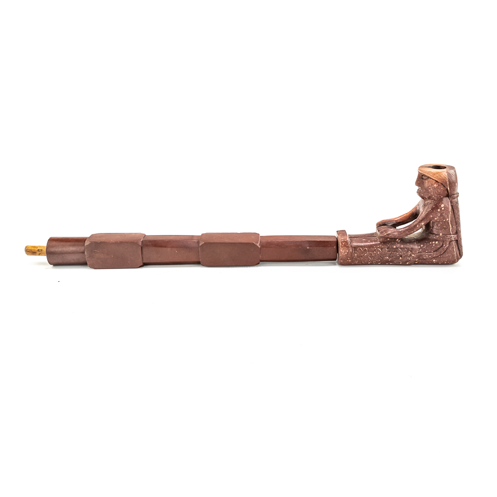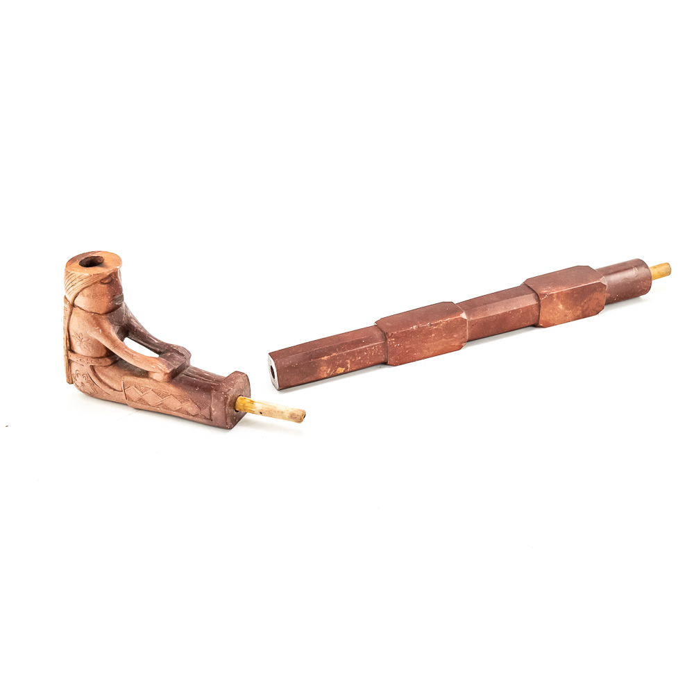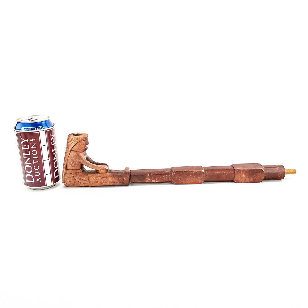 This beautiful Northern Plains pipe, carved from sacred red Catlinite revered by the plains and woodland tribes alike, features an effigy bowl depicting a woman seated with her legs outstretched while she works an object on her lap. Her long hair is braided down her back reaching to the ground. The decoration on her person is different on either side of the pipe. The coloration of the piece is also variable possibly suggesting handling over years of use. The stem itself is free of decoration, save the alternating block elements, giving it depth. The pipe stem can be separated for storage and the connecting piece and mouthpiece are both made of wood. Overall in good condition, commensurate with age. Dimensions: 17” long x 1.25” wide overall. Pipe effigy: 3.75” tall x 4.75” long, 6.5” w/wood stem insert. Stem11.25” long. 12.25” w/mouthpiece. See photos.