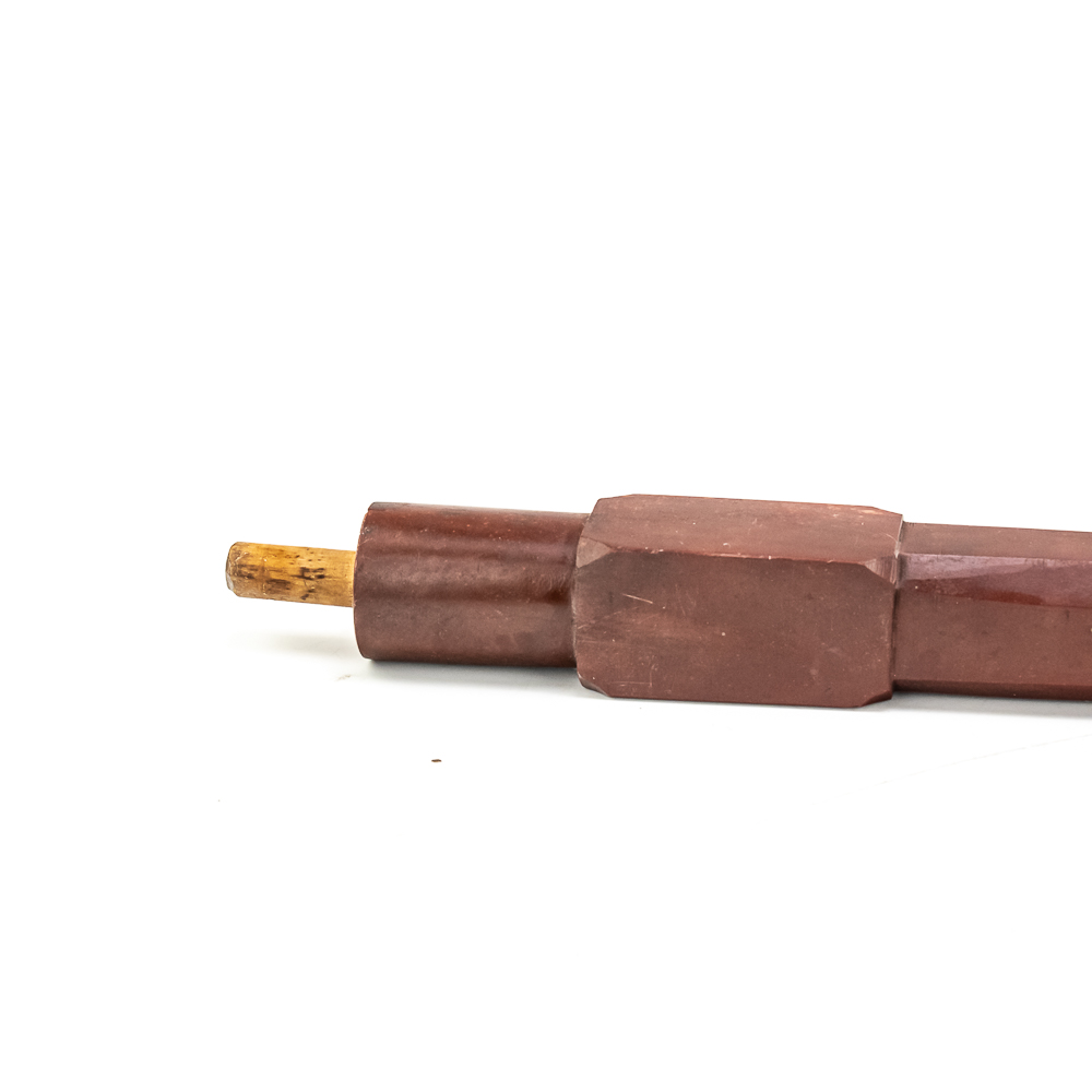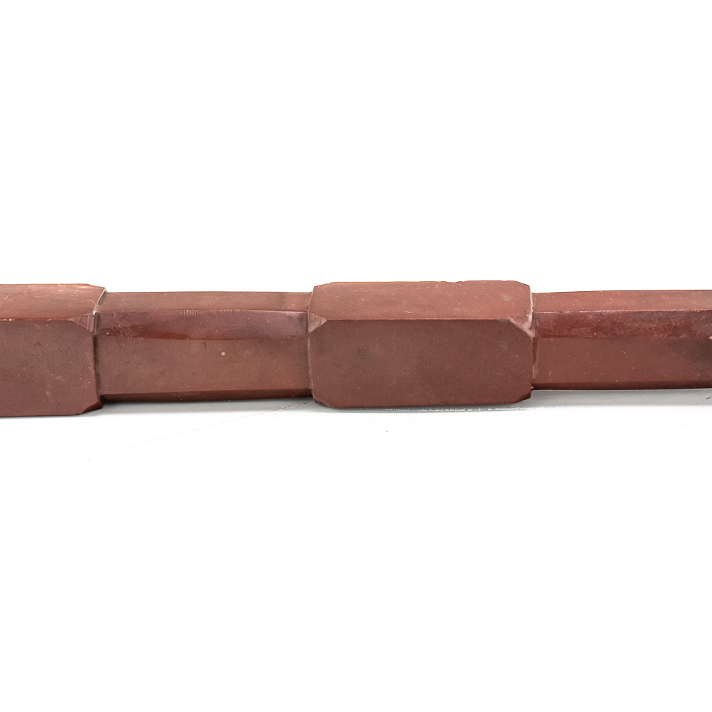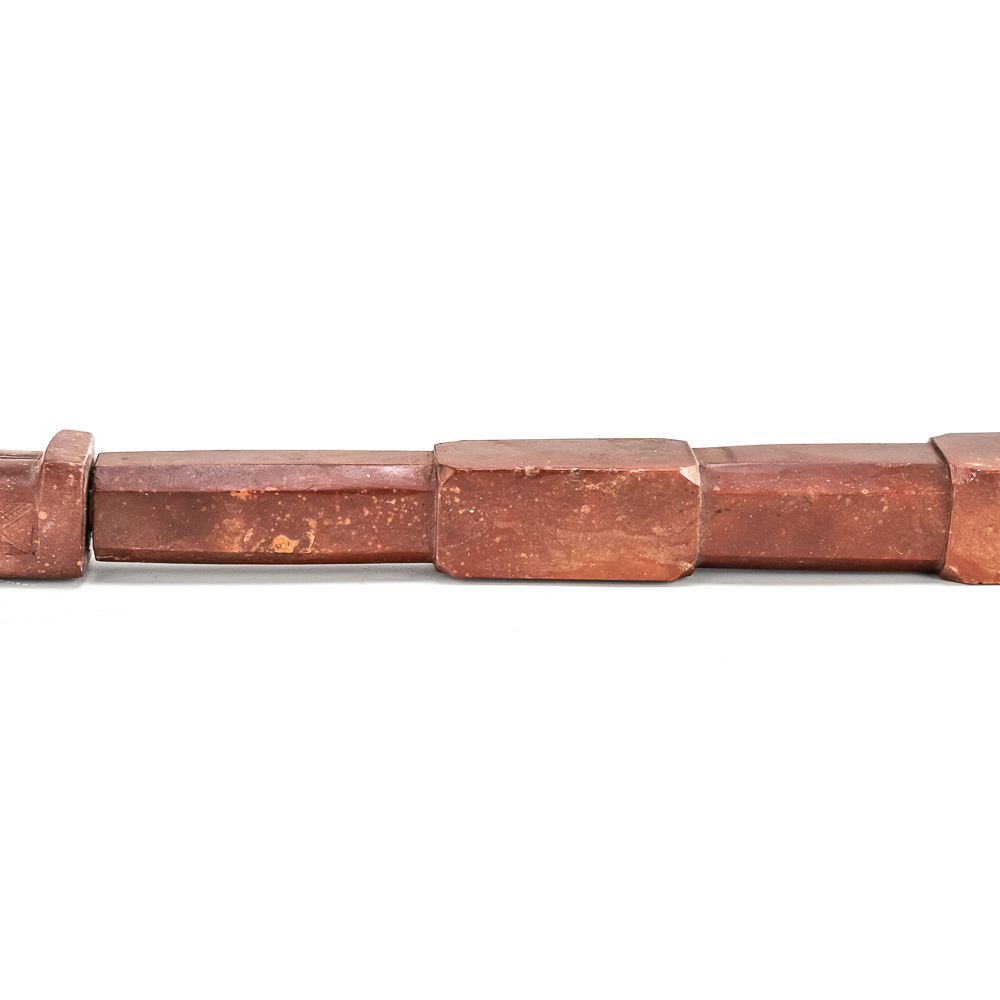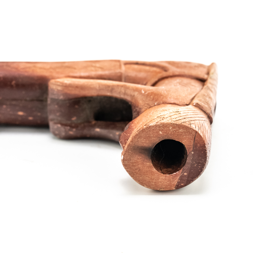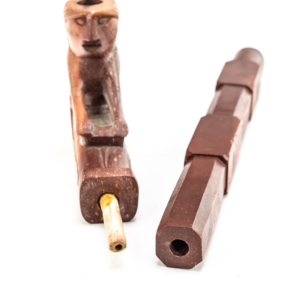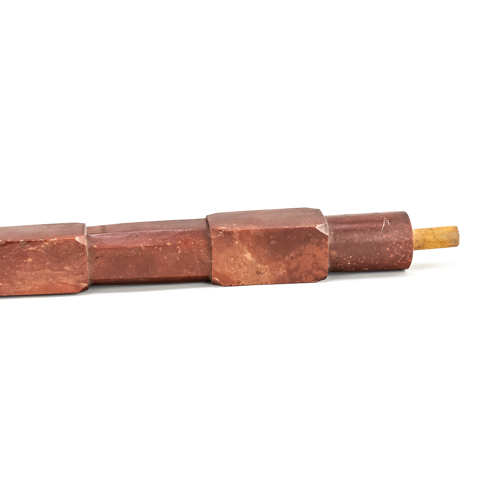This beautiful Northern Plains pipe, carved from sacred red Catlinite revered by the plains and woodland tribes alike, features an effigy bowl depicting a woman seated with her legs outstretched while she works an object on her lap. Her long hair is braided down her back reaching to the ground. The decoration on her person is different on either side of the pipe. The coloration of the piece is also variable possibly suggesting handling over years of use. The stem itself is free of decoration, save the alternating block elements, giving it depth. The pipe stem can be separated for storage and the connecting piece and mouthpiece are both made of wood. Overall in good condition, commensurate with age. Dimensions: 17” long x 1.25” wide overall. Pipe effigy: 3.75” tall x 4.75” long, 6.5” w/wood stem insert. Stem11.25” long. 12.25” w/mouthpiece. See photos.