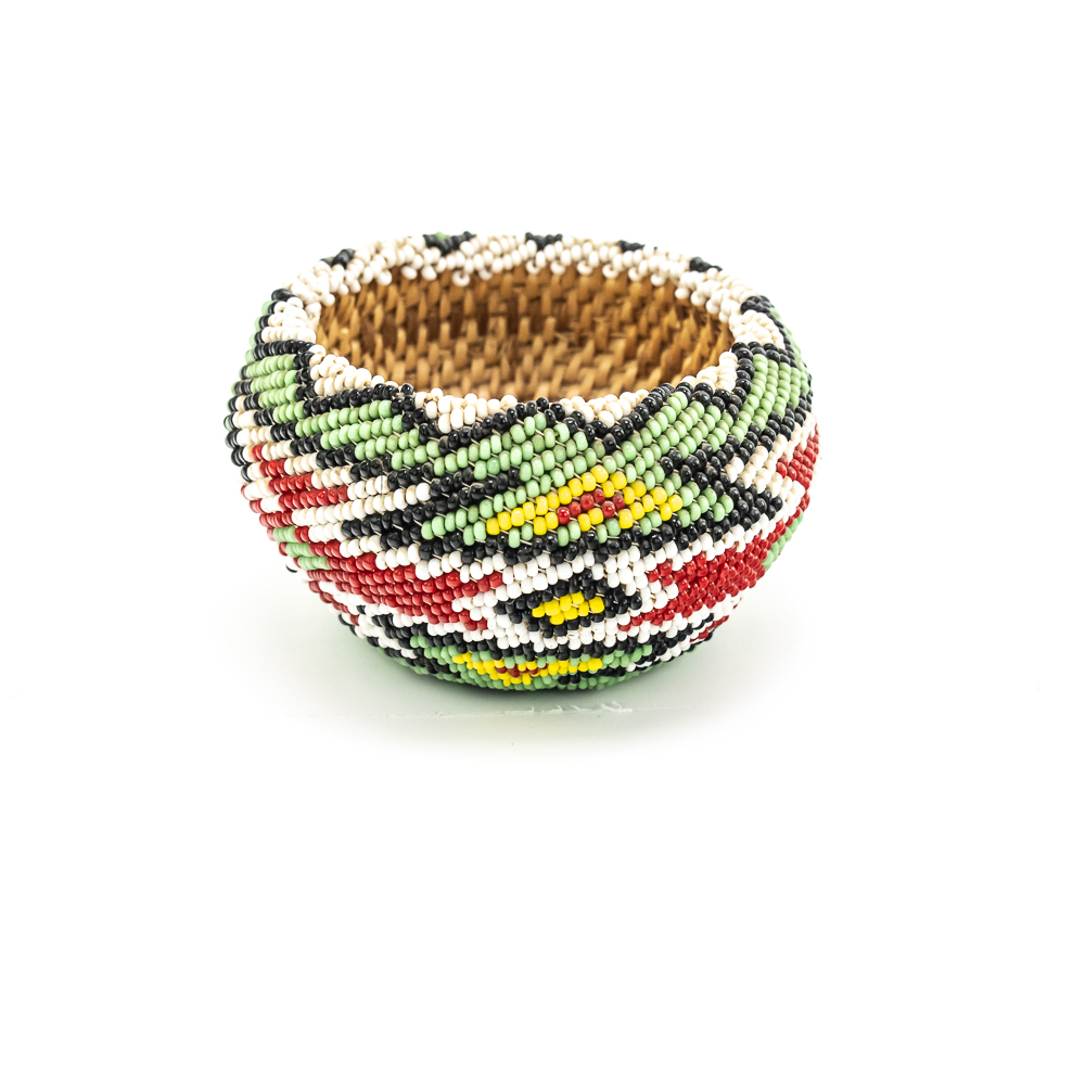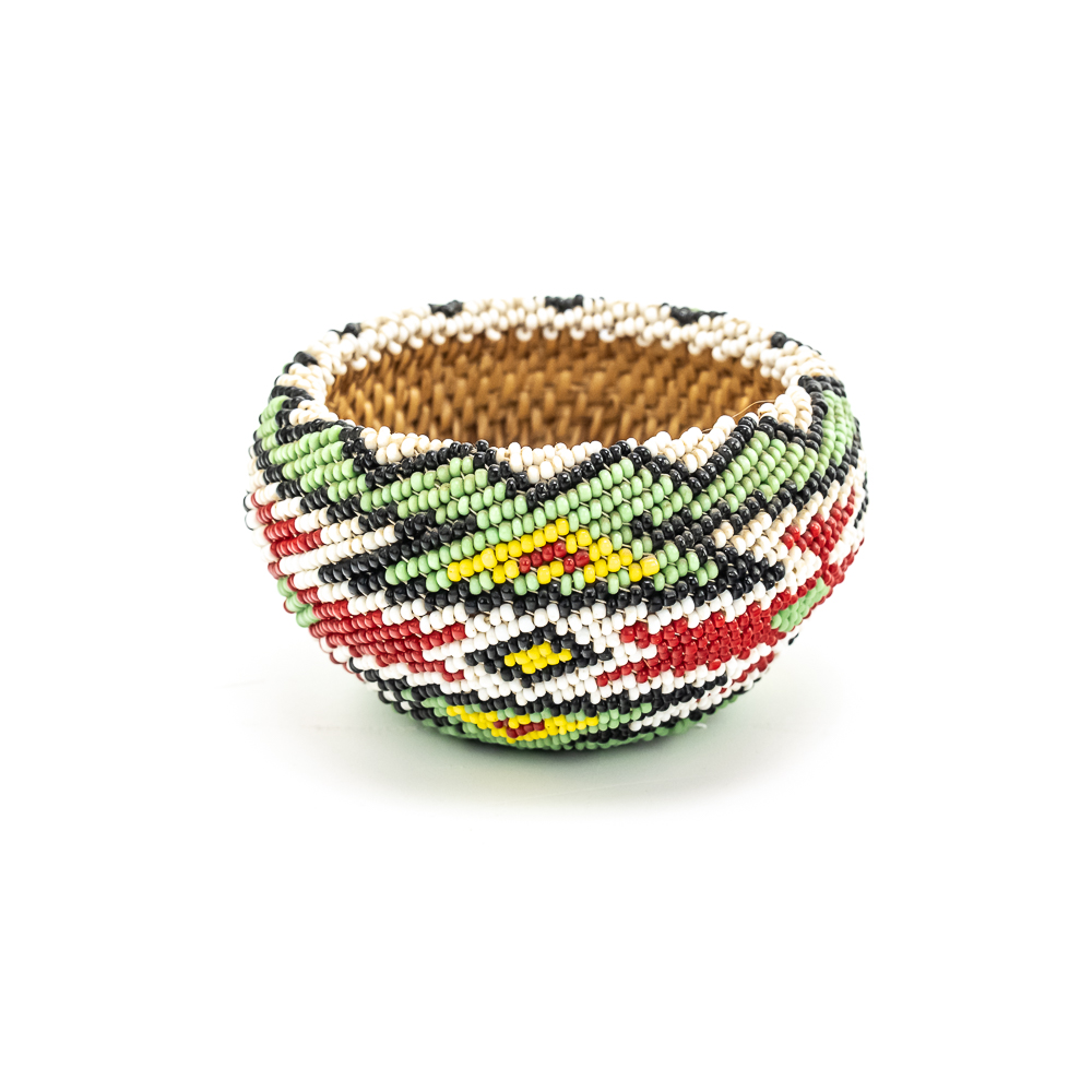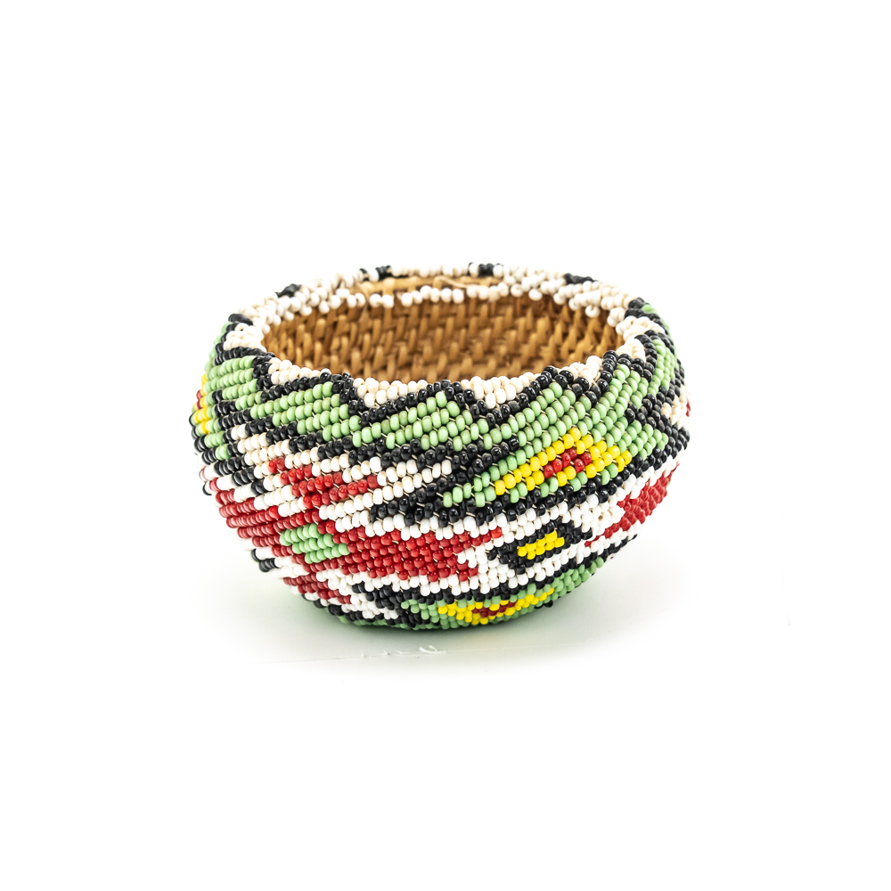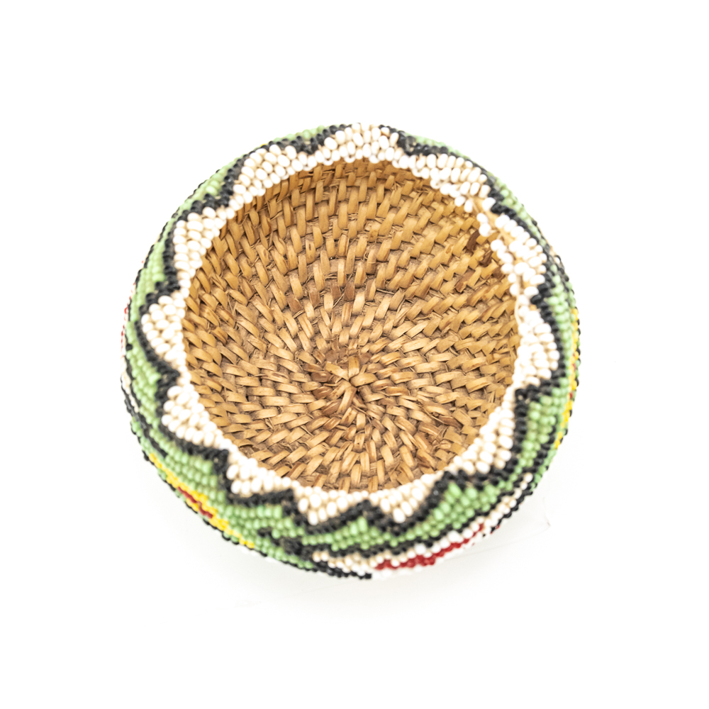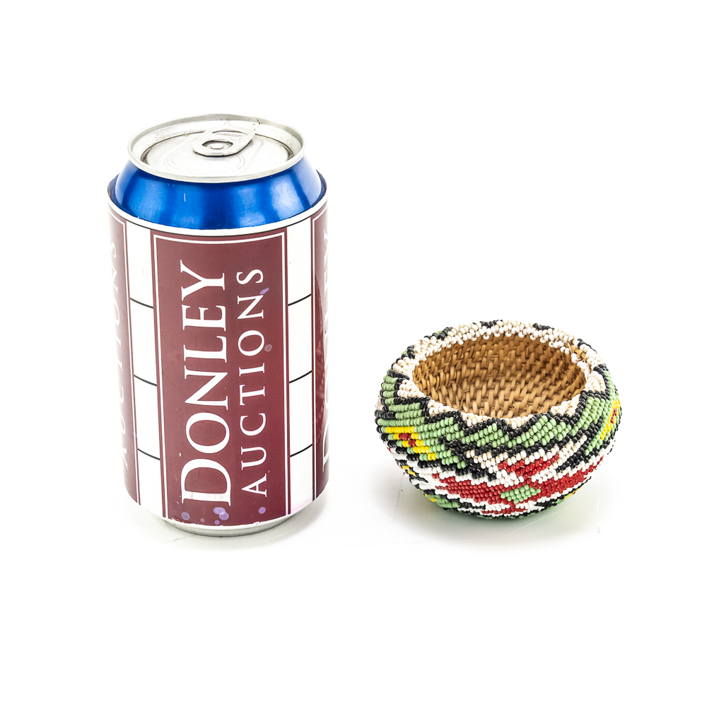 Paiute beaded basket likely dates to early to mid-20th century. These baskets are distinctive for their tight weave and sheath of seed glass beads covering the exterior. The basket features a polychrome design with geometric patterns including what appears to be stylized geometric/floral motifs of red white and black along with a significant presence of blue and green. These baskets were often made for sale or as gifts and are considered a relatively newer form of basket weaving. The base of the basket is a coiled weave common amongst Paiute basket makers. Overall condition is excellent with no loss of beads or fibers. Dimensions: 3.25” x 1.75”. Please see photos.