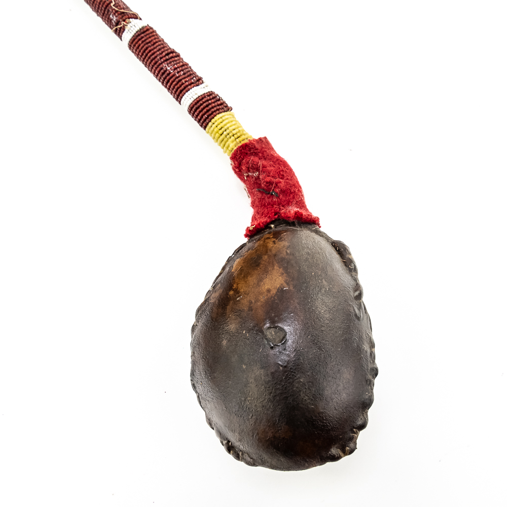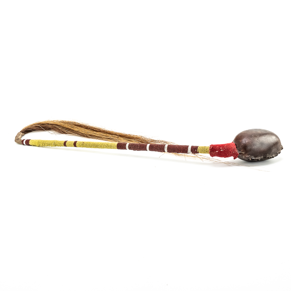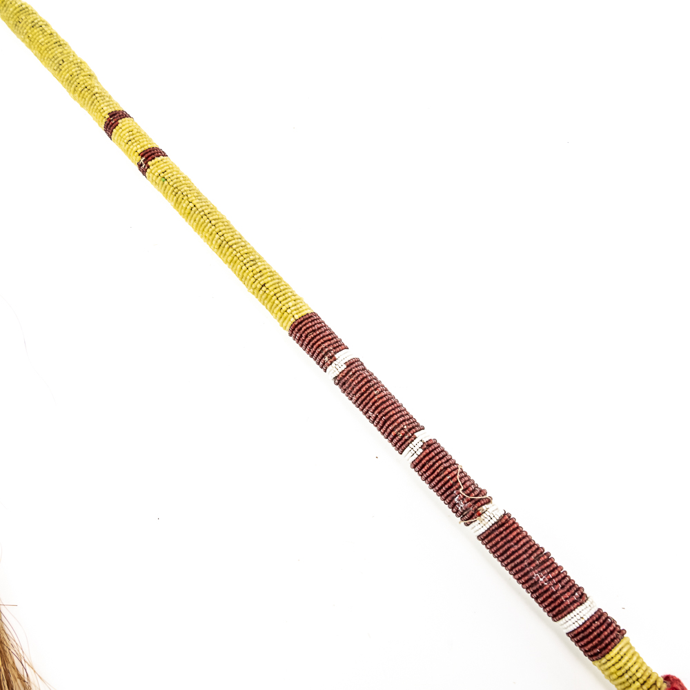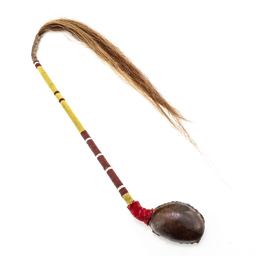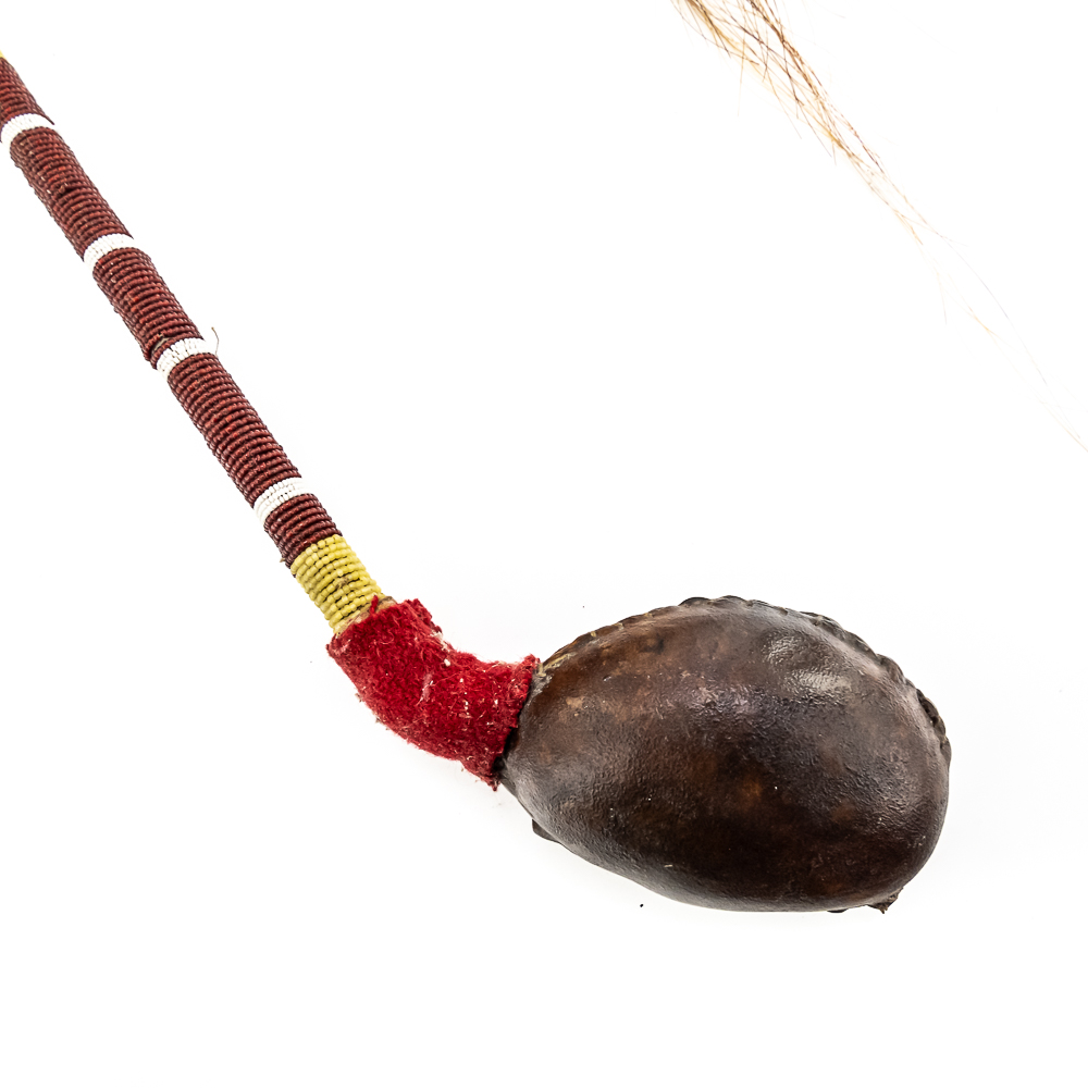 This “Floppy Head” Plains Indian war club also referred to as a skull cracker. It features a stone head wrapped in hide attached to a rigid handle. Adorned with red wool felt, and yellow, white and red glass seed beads the entire length of the handle. Finished off with a horsehair tail at the end. Object is in good, stable condition, with no loss of beads. Dimensions: Approximately 43”in length with horse tail. Leather wrapped head: 2”x3”. See photos.