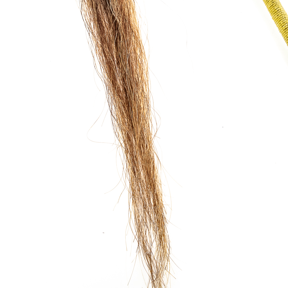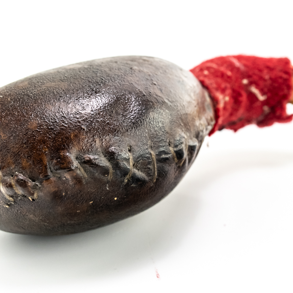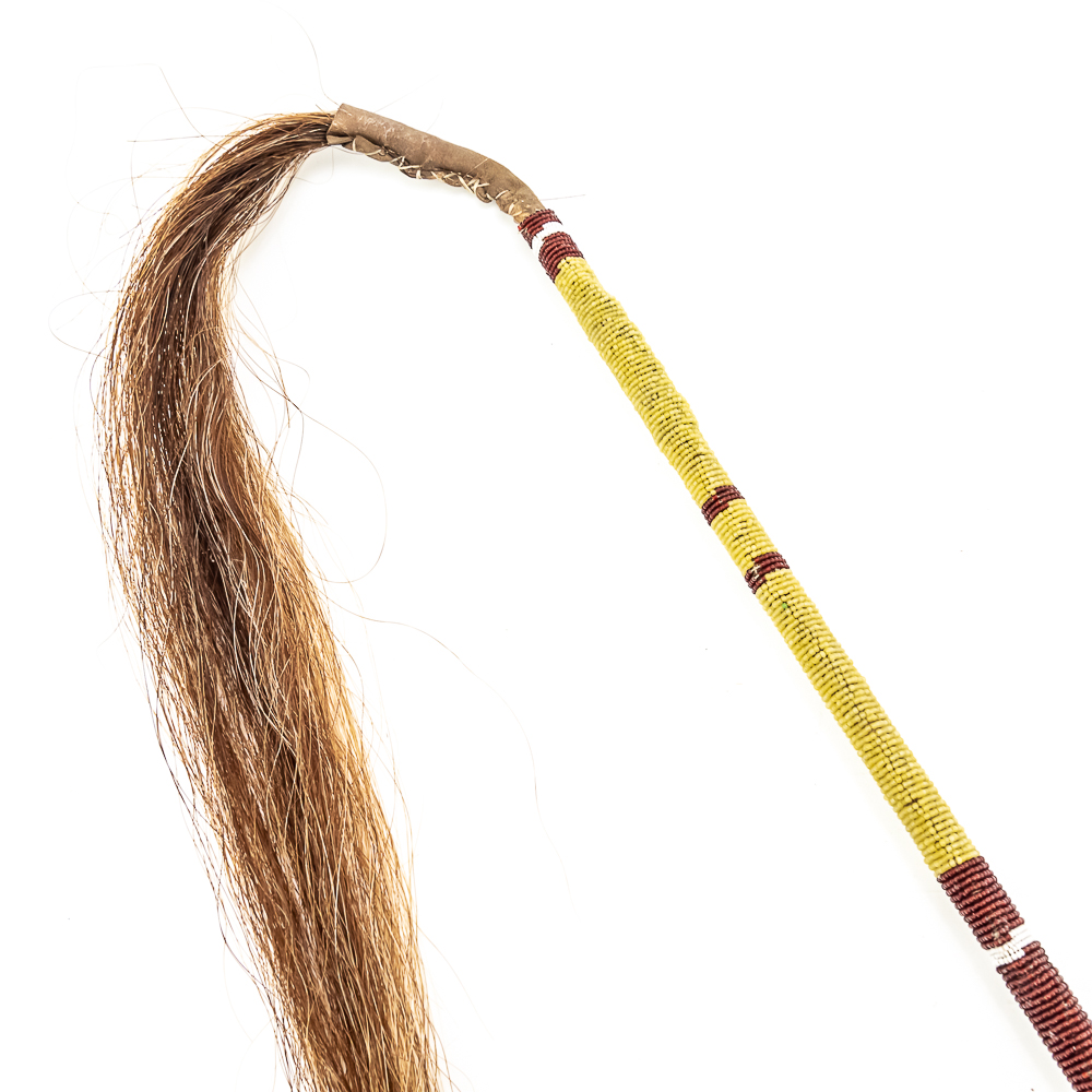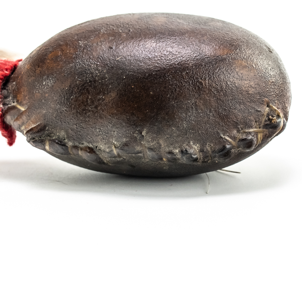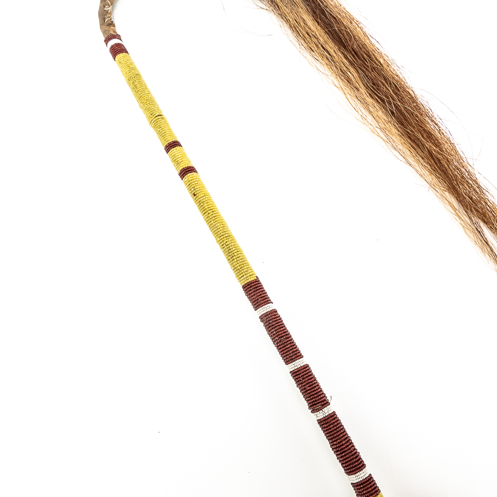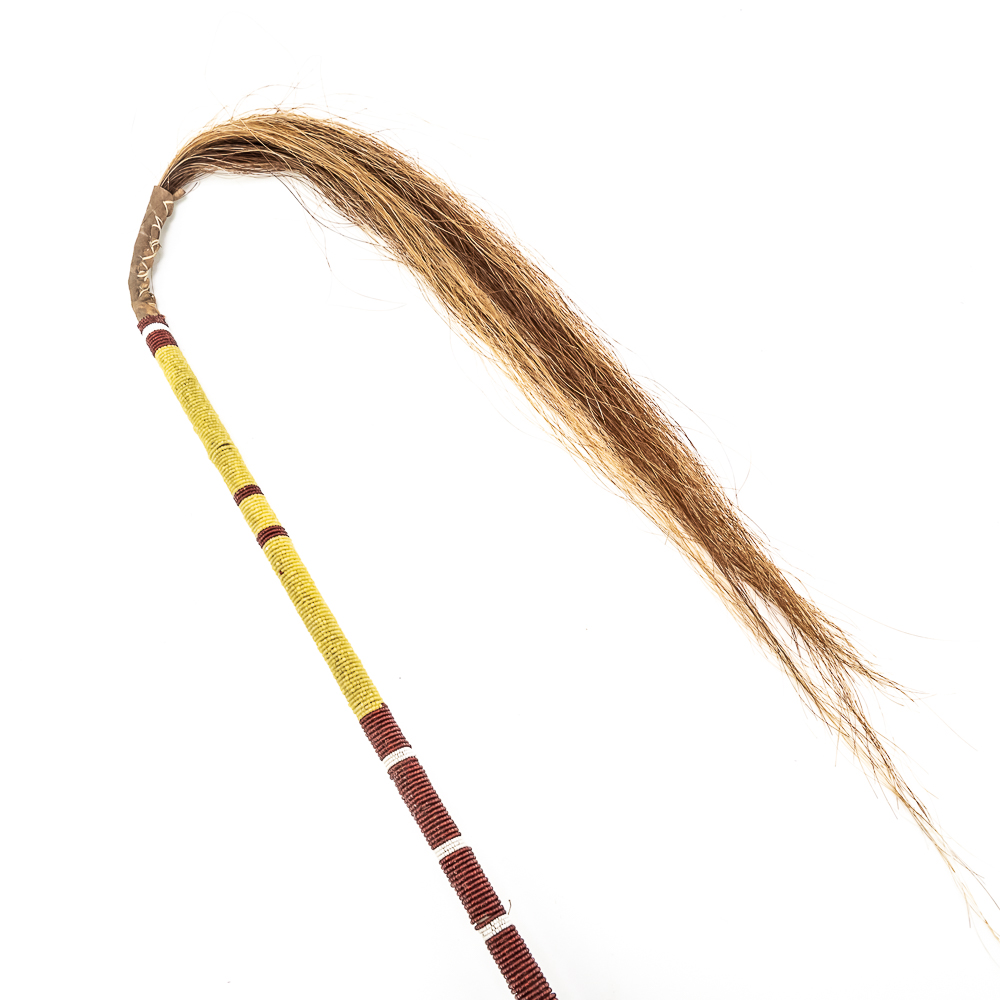 This “Floppy Head” Plains Indian war club also referred to as a skull cracker. It features a stone head wrapped in hide attached to a rigid handle. Adorned with red wool felt, and yellow, white and red glass seed beads the entire length of the handle. Finished off with a horsehair tail at the end. Object is in good, stable condition, with no loss of beads. Dimensions: Approximately 43”in length with horse tail. Leather wrapped head: 2”x3”. See photos.