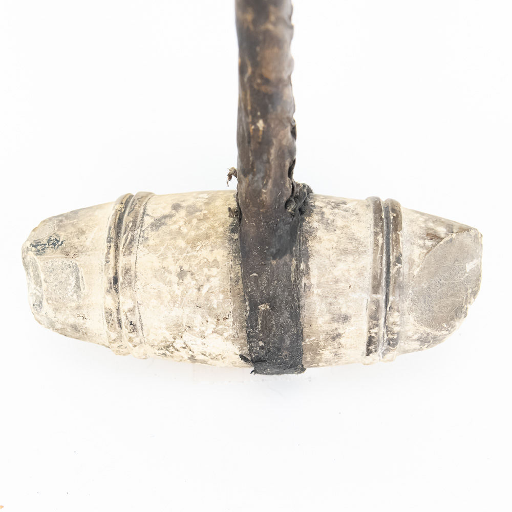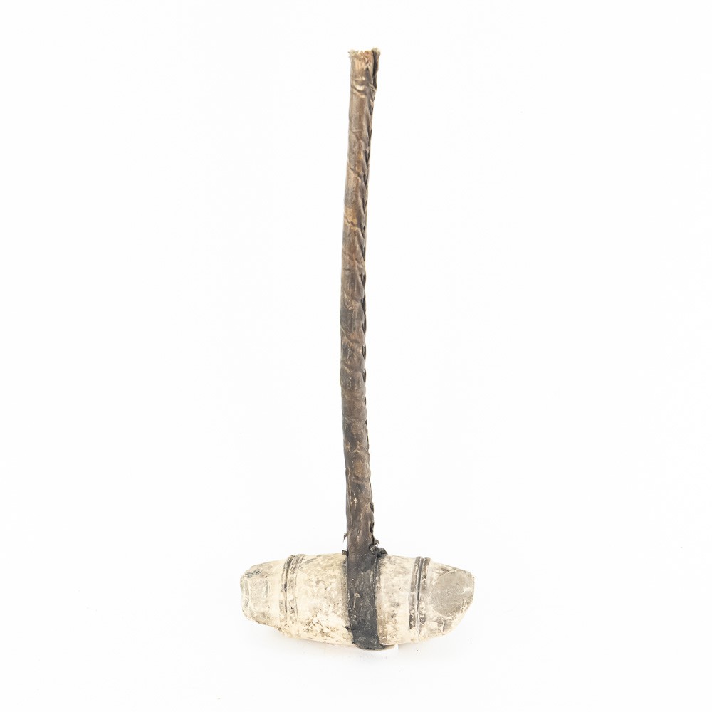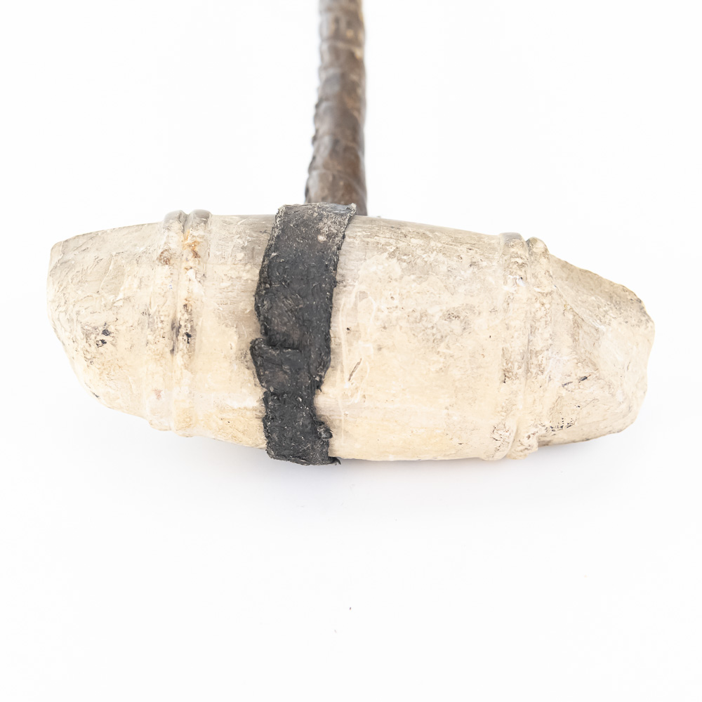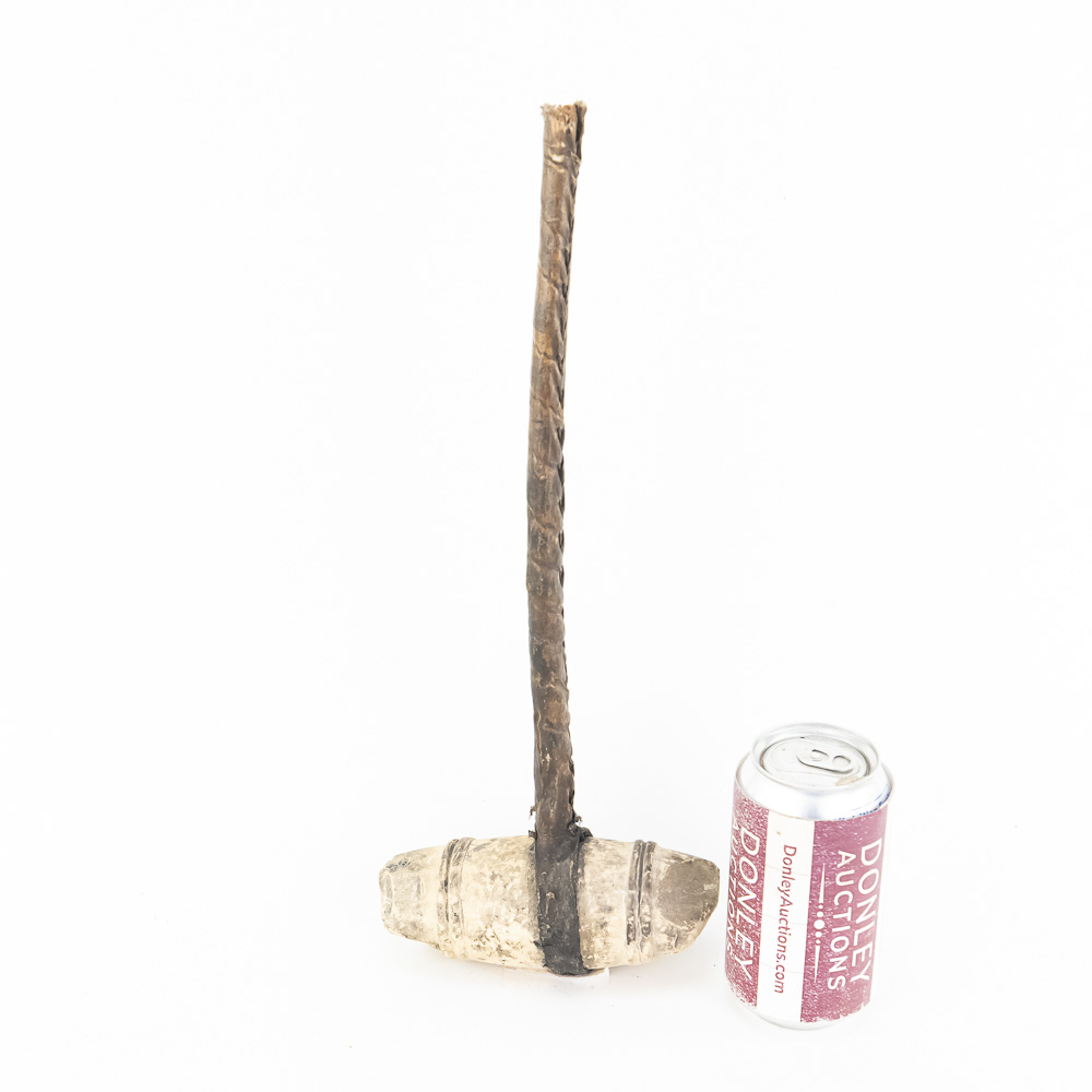 This is a fascinating example of a primitive stone-headed club likely modeled after traditional Native American or frontier implements. The style is classic and rustic, emphasizing simple, effective construction, suggesting it could be a 20th-century replica, commemorative piece, or craft item. The head appears to be a natural, smoothed stone, with bands on either end carved into it and fitted to a wooden handle. The stone is secured to the handle by what looks like a leather thong or strip of rawhide, which has dried and stiffened over time. The handle itself is dark, possibly stained wood, wrapped entirely in a spiraled material that gives it a textured, hand-grip surface. A closer look at the end of the handle suggests it is composed of an inner core wrapped in a thick, leather-like or hide material, with the very end showing a fibrous, reddish-brown filling or core material. The item is in generally Good condition for a piece of its type. The stone head shows natural wear and some discoloration, possibly from the original materials used for the binding. The leather/hide binding on the head and handle is intact but dry and stiff, exhibiting cracking and surface wear consistent with age and handling. H 15.5″, W 5″, D 2″. Used in the Native American display in Donley’s Wild West Town.