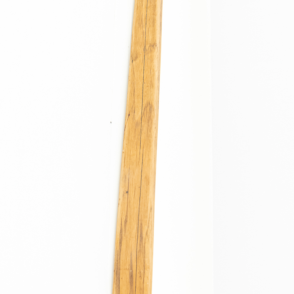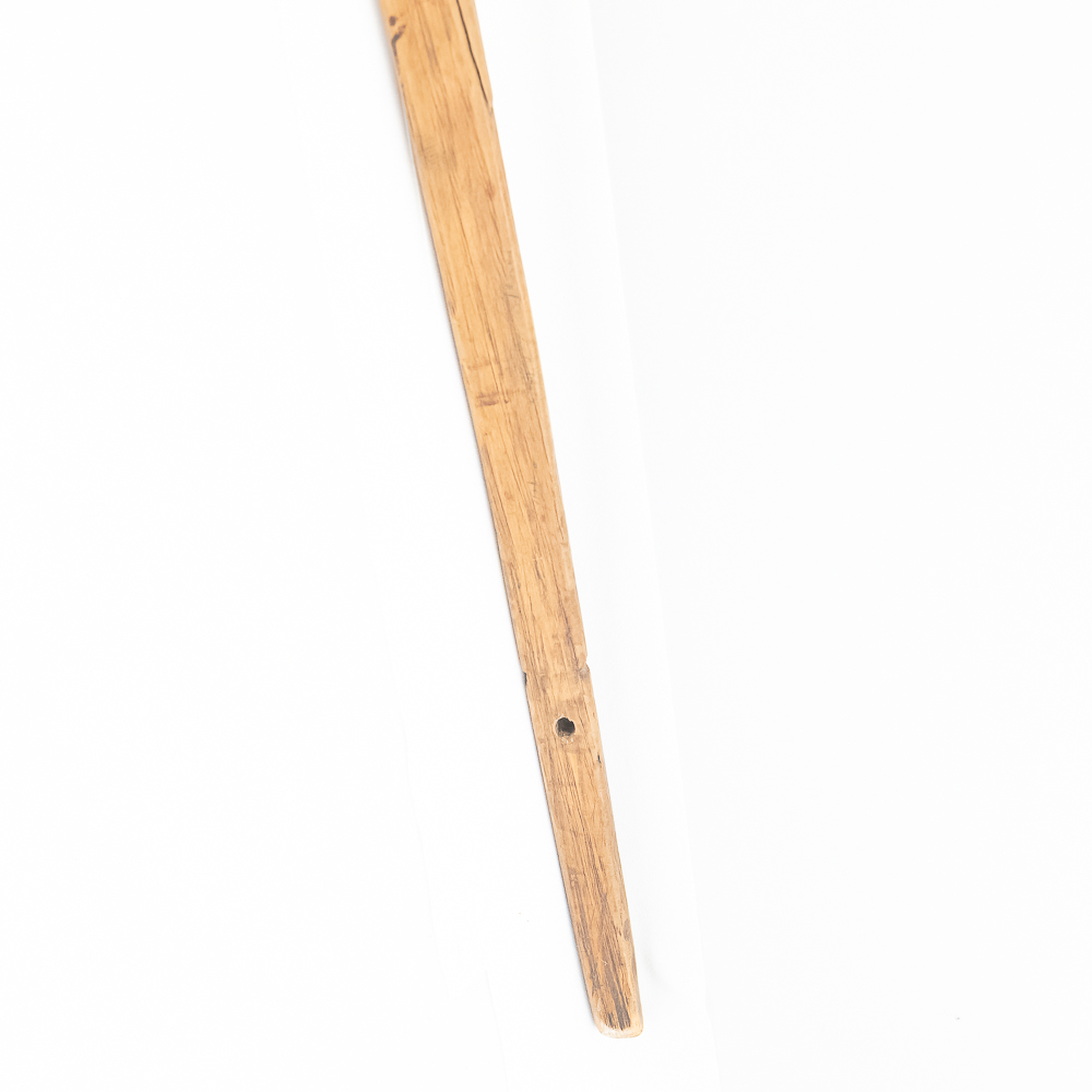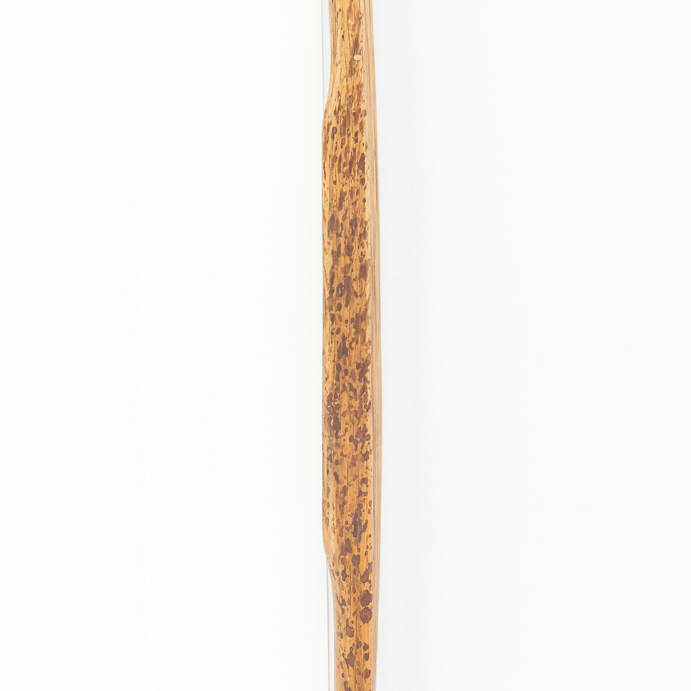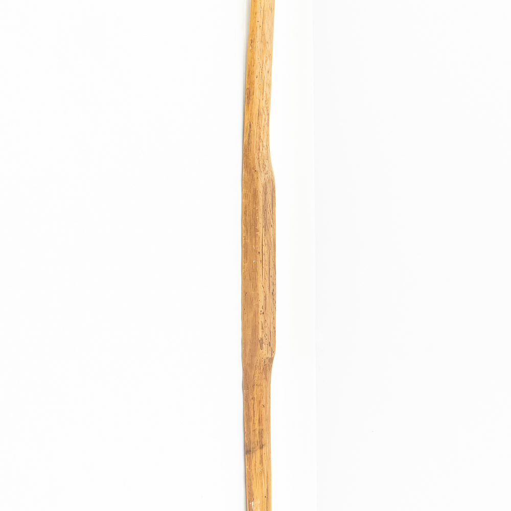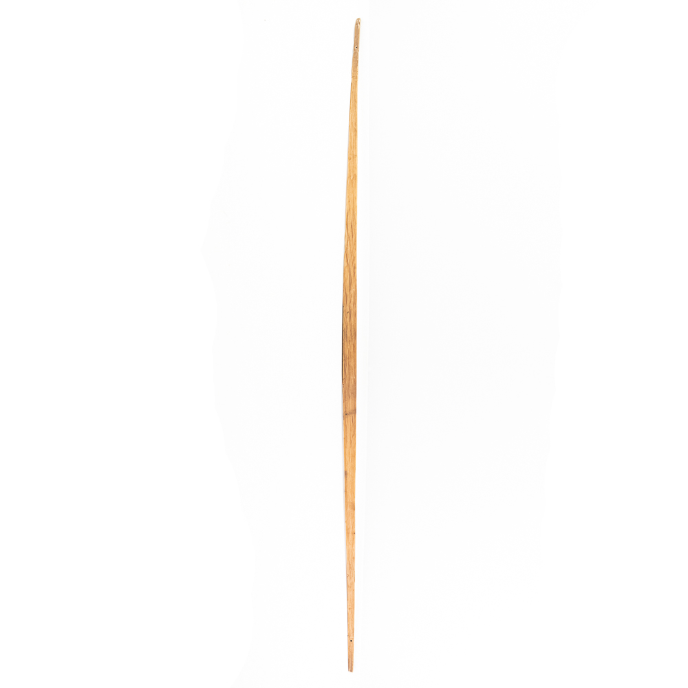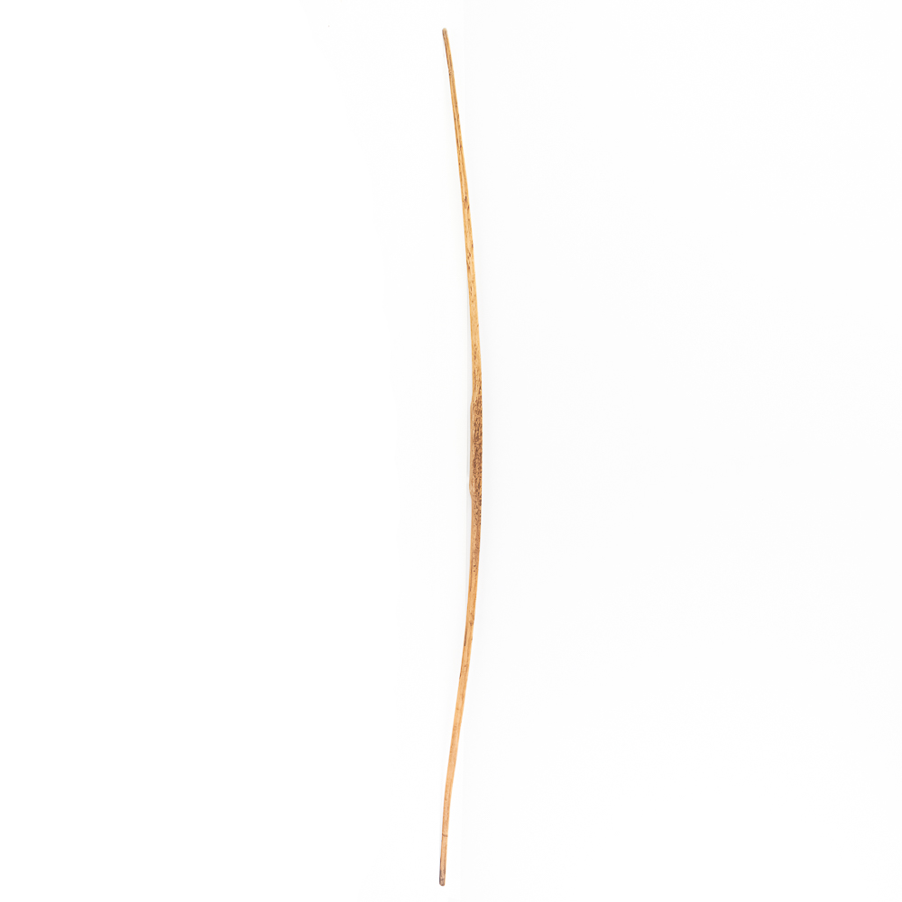 This Native American Northern Plains bow measures approximately 60” length. Constructed from a single piece of wood, possibly Osage or Hickory- materials traditionally favored for their strength and flexibility. The bow is simple and unadorned, characteristic of utilitarian bows from the Plains region. The bow profile is slightly curved, indicating it is a self-bow, meaning made from a single piece of wood without additional reinforcement. There are several longitudinal cracks in the bow structure. Please see photos.