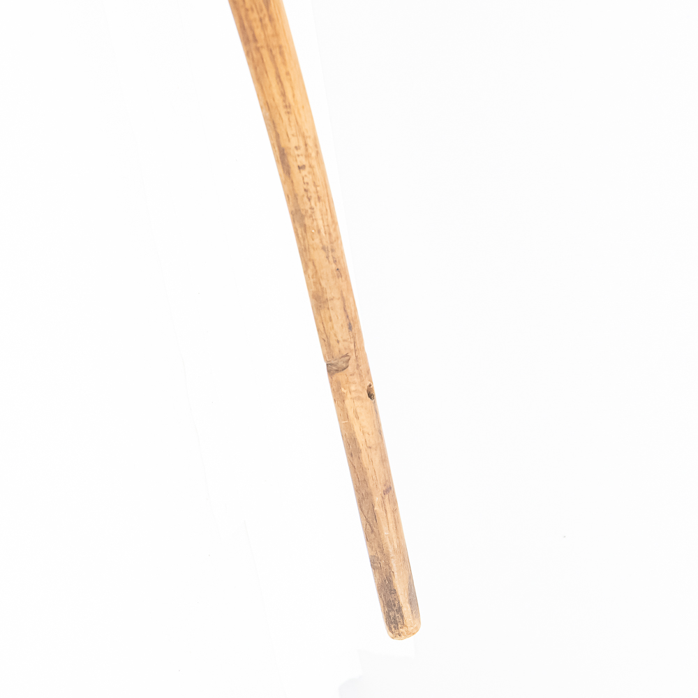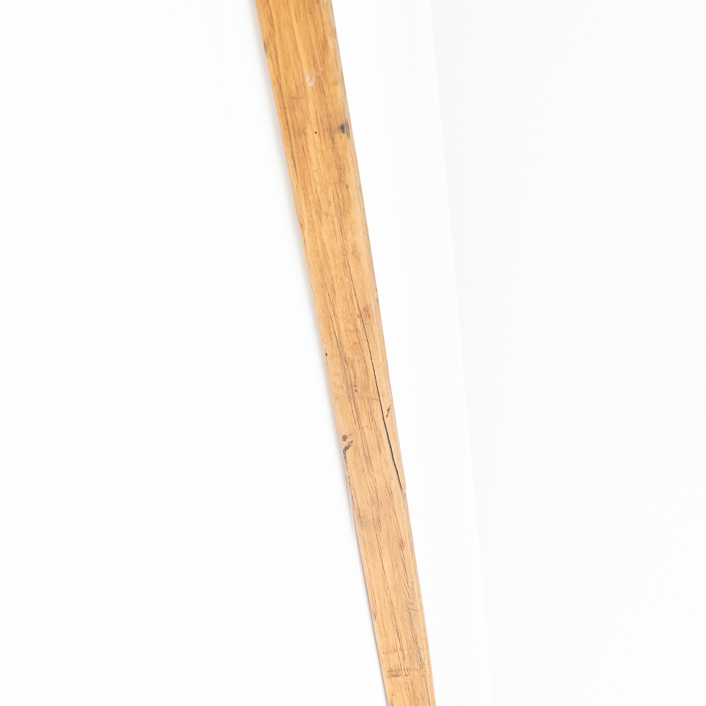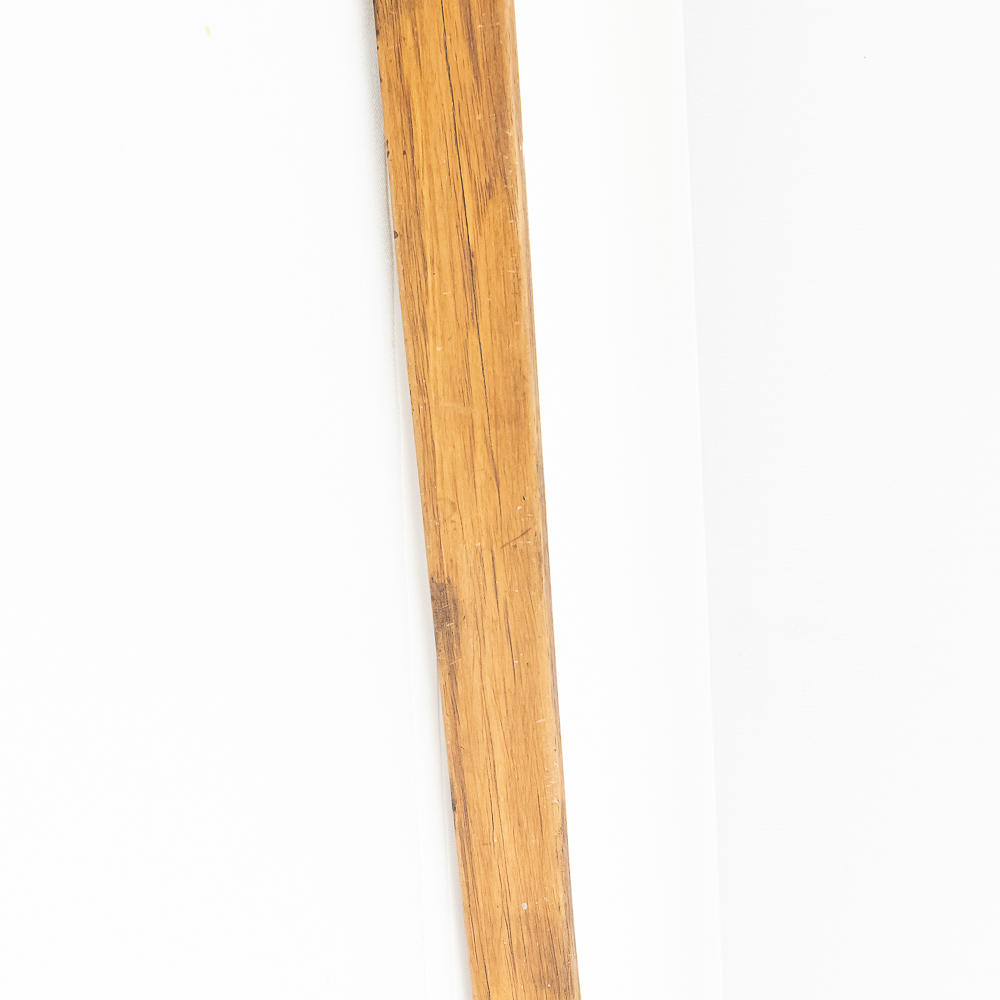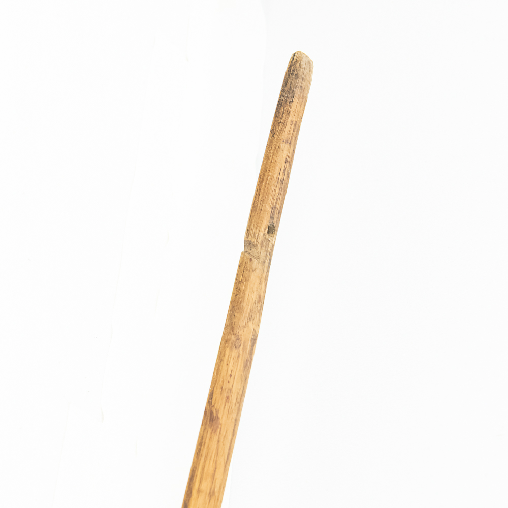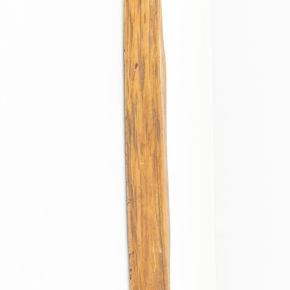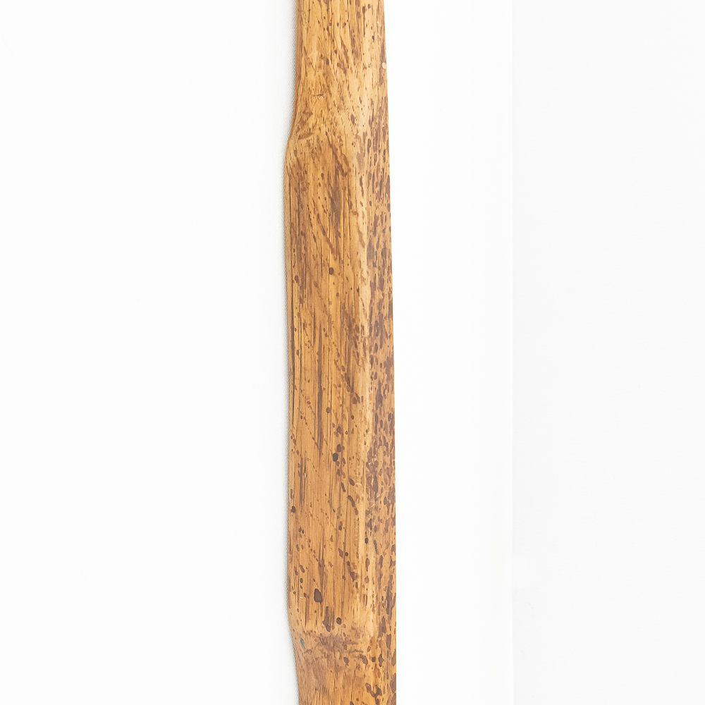 This Native American Northern Plains bow measures approximately 60” length. Constructed from a single piece of wood, possibly Osage or Hickory- materials traditionally favored for their strength and flexibility. The bow is simple and unadorned, characteristic of utilitarian bows from the Plains region. The bow profile is slightly curved, indicating it is a self-bow, meaning made from a single piece of wood without additional reinforcement. There are several longitudinal cracks in the bow structure. Please see photos.