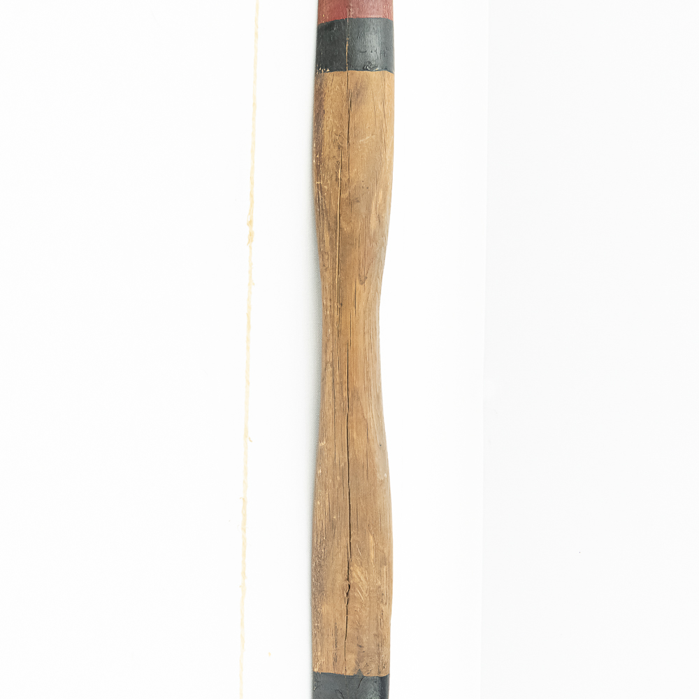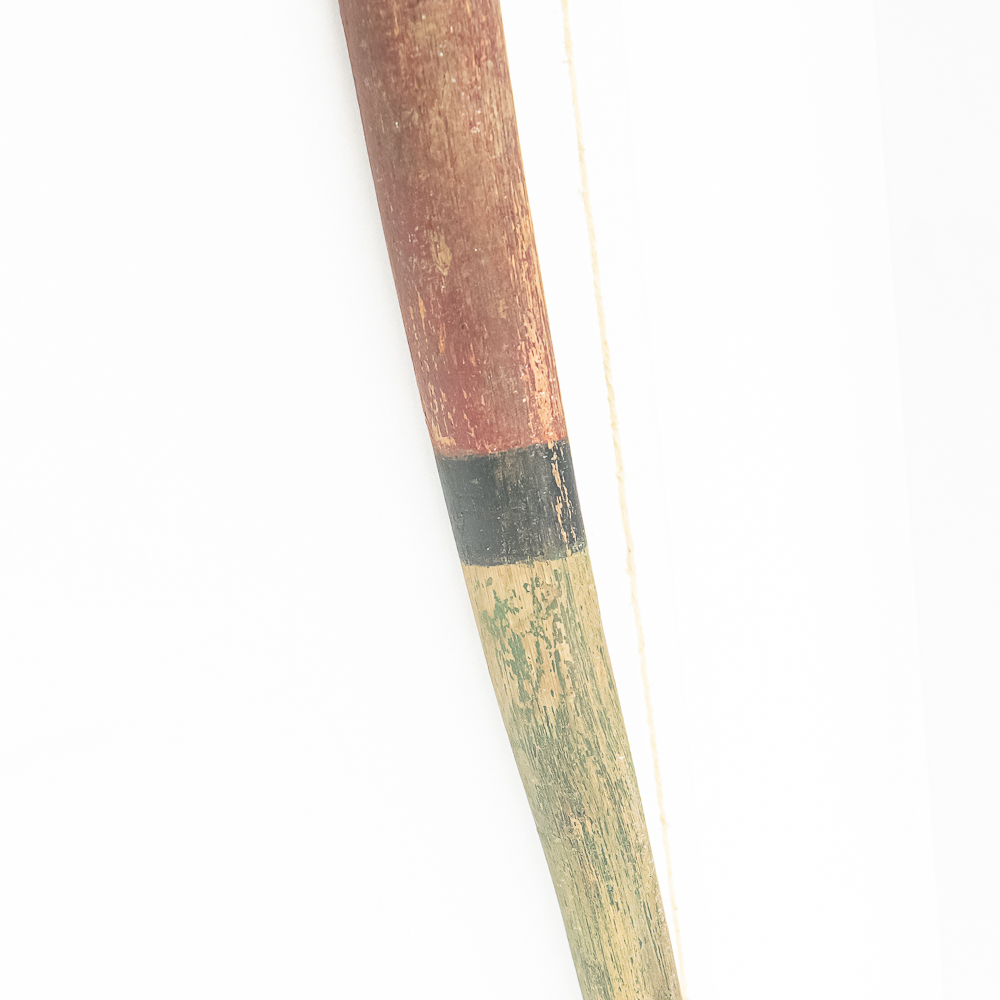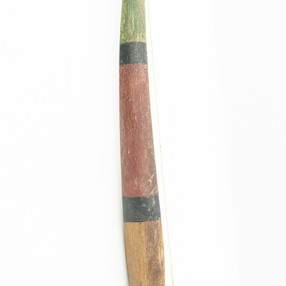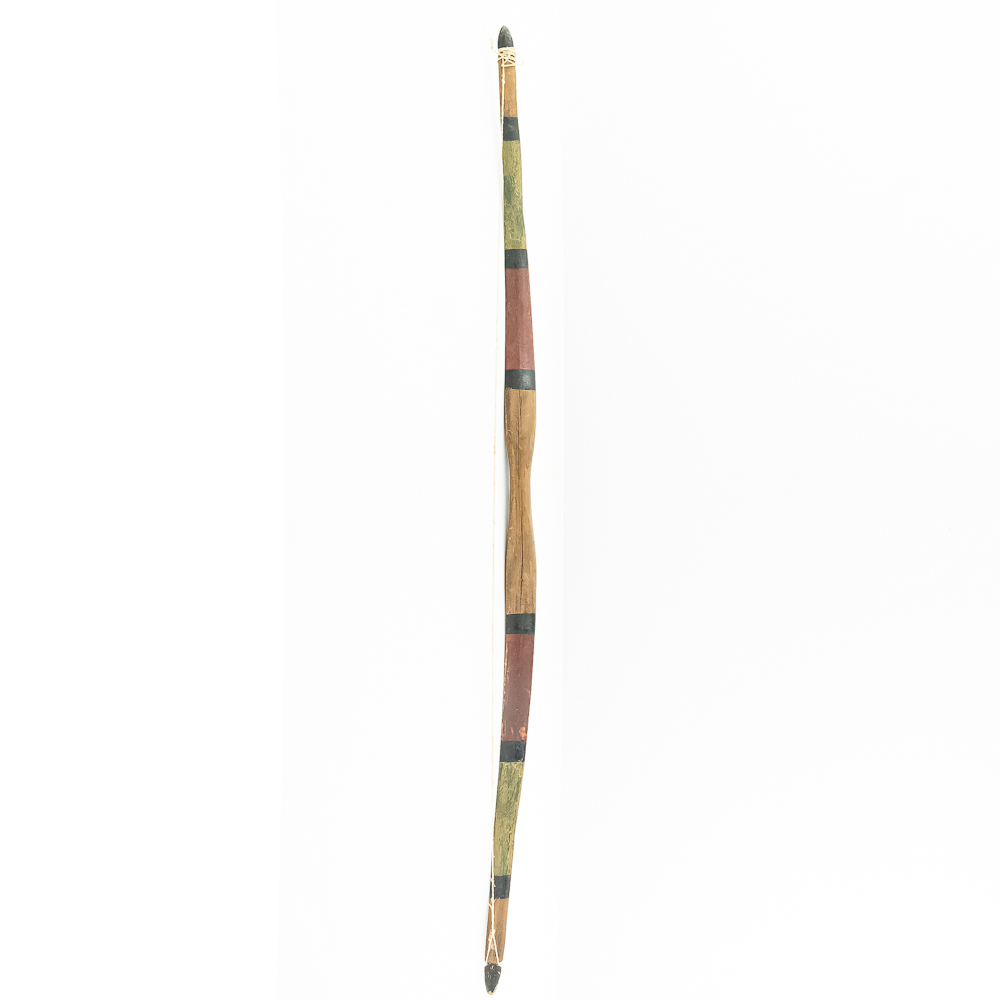 This Native American bow, attributed to the Sioux tribe. It measures 44.25” in length. Constructed from a single piece of wood likely Osage orange or Hickory, commonly used by Plains tribes. The bow has a thick central grip and a gentle curve on either side. It is painted with a green and red section on the top and bottom with black striped borders. The nocks are also painted black. It has a braided sinew or nylon string. There is a structural crack and the central grip portion extending into the red painted sections of the bow. Please see photos.