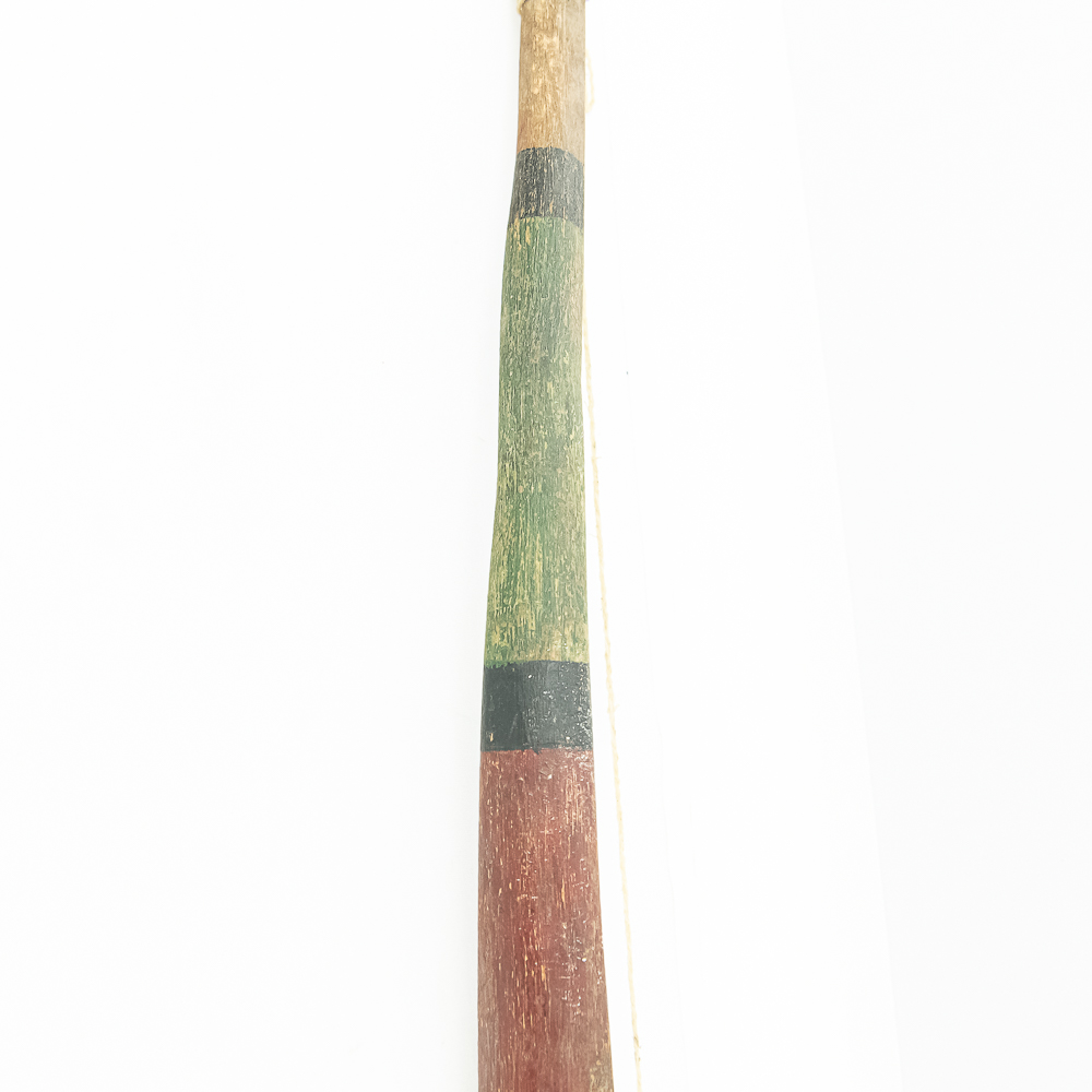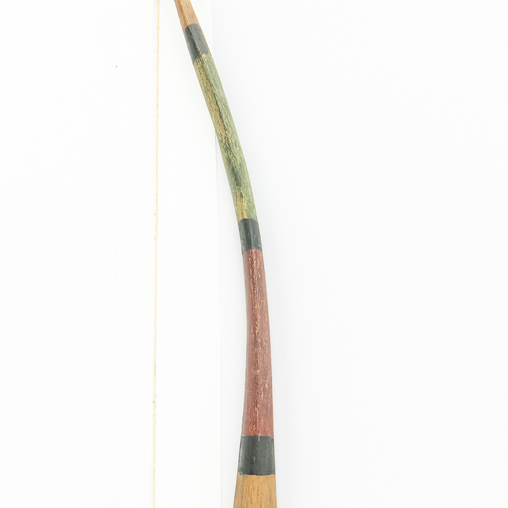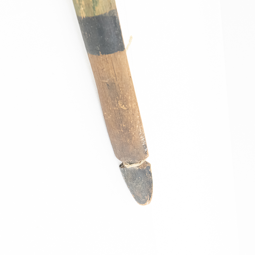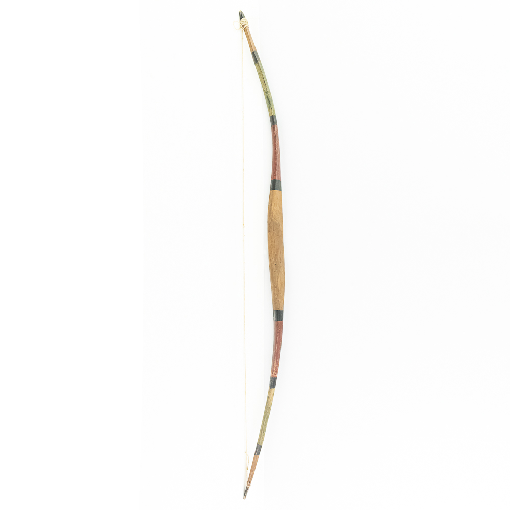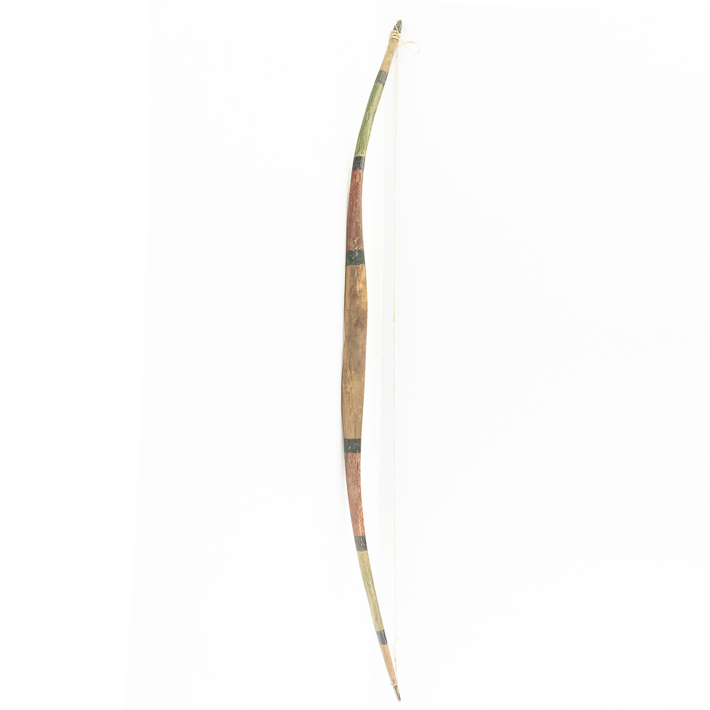 This Native American bow, attributed to the Sioux tribe. It measures 44.25” in length. Constructed from a single piece of wood likely Osage orange or Hickory, commonly used by Plains tribes. The bow has a thick central grip and a gentle curve on either side. It is painted with a green and red section on the top and bottom with black striped borders. The nocks are also painted black. It has a braided sinew or nylon string. There is a structural crack and the central grip portion extending into the red painted sections of the bow. Please see photos.