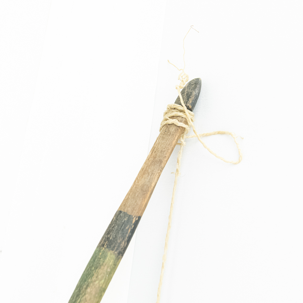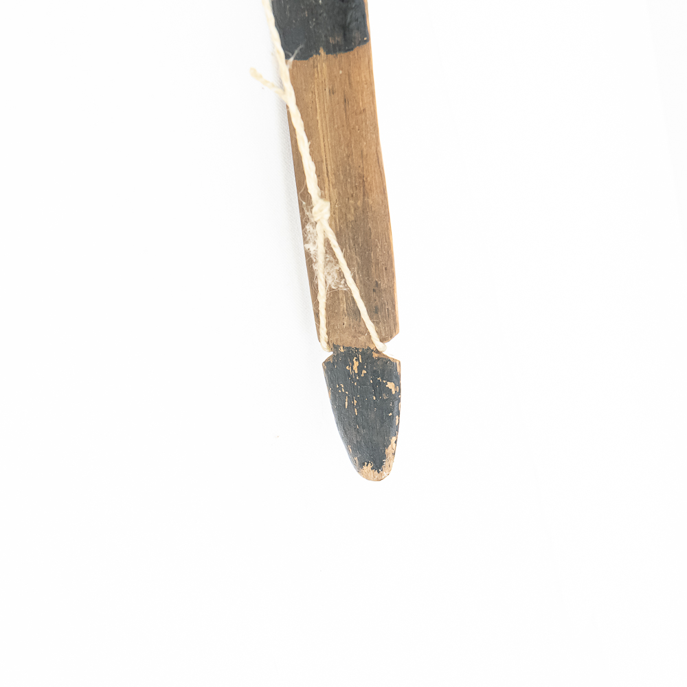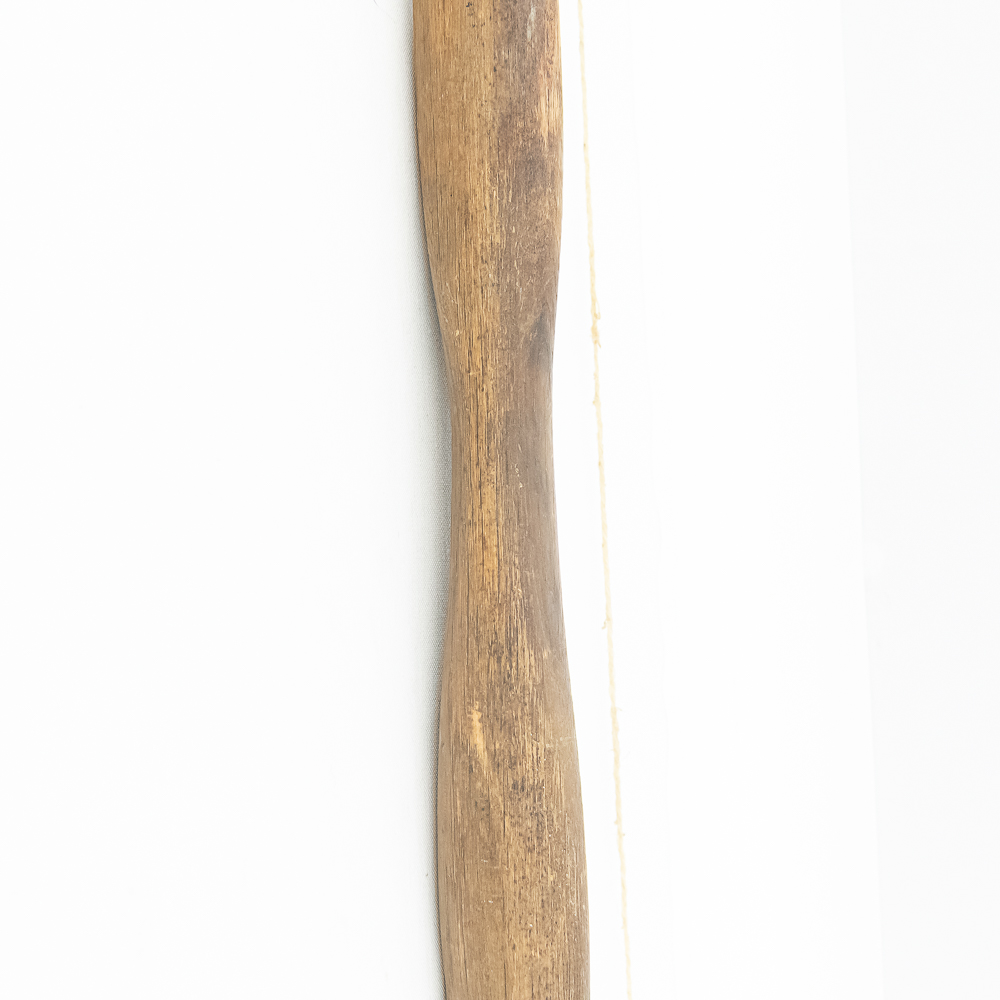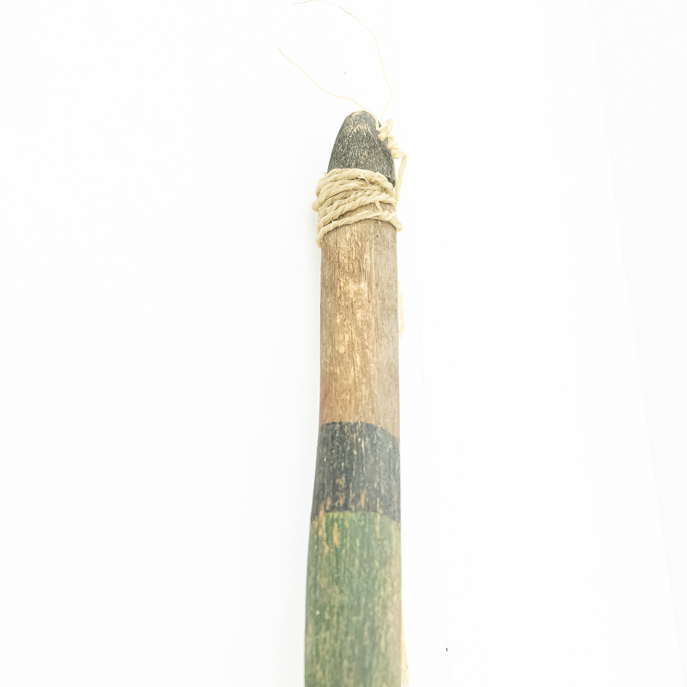 This Native American bow, attributed to the Sioux tribe. It measures 44.25” in length. Constructed from a single piece of wood likely Osage orange or Hickory, commonly used by Plains tribes. The bow has a thick central grip and a gentle curve on either side. It is painted with a green and red section on the top and bottom with black striped borders. The nocks are also painted black. It has a braided sinew or nylon string. There is a structural crack and the central grip portion extending into the red painted sections of the bow. Please see photos.