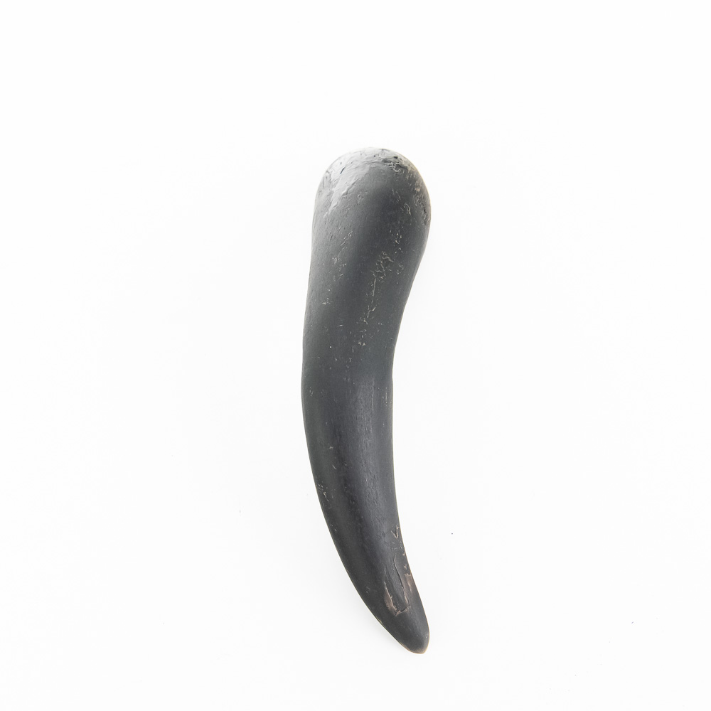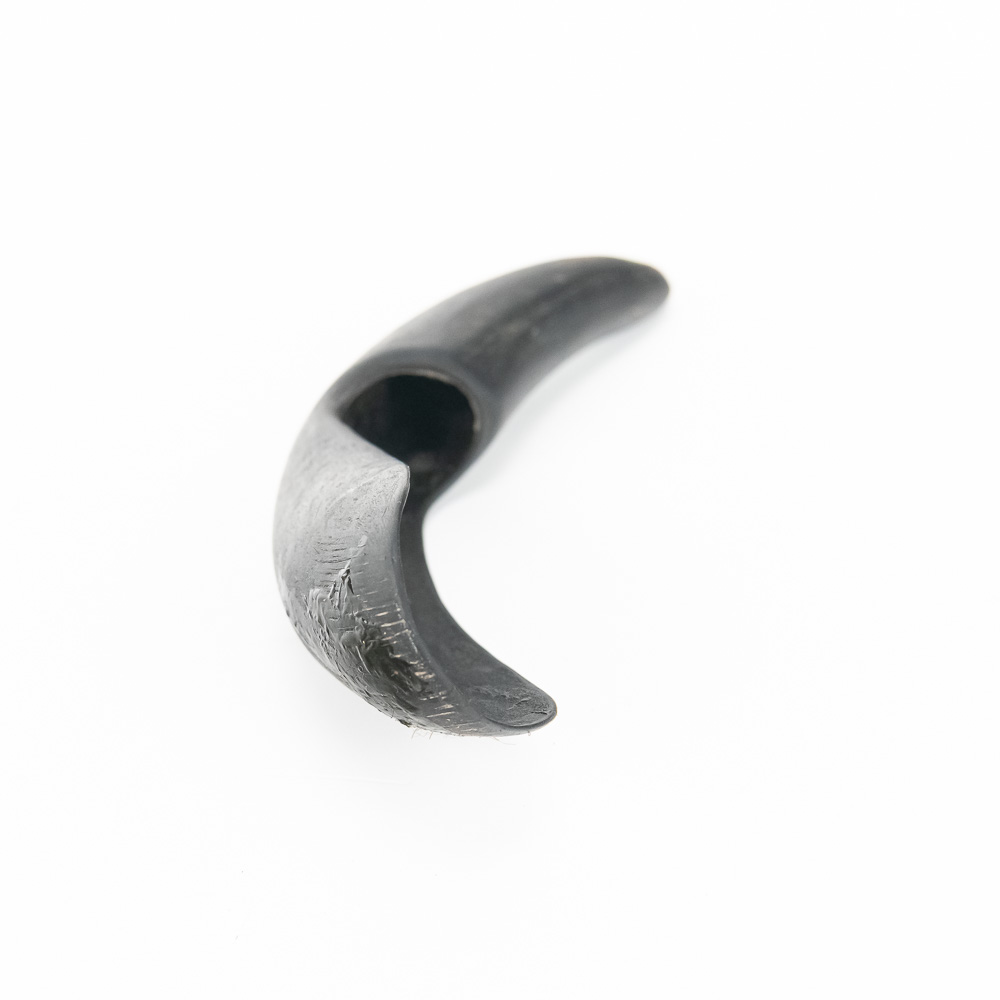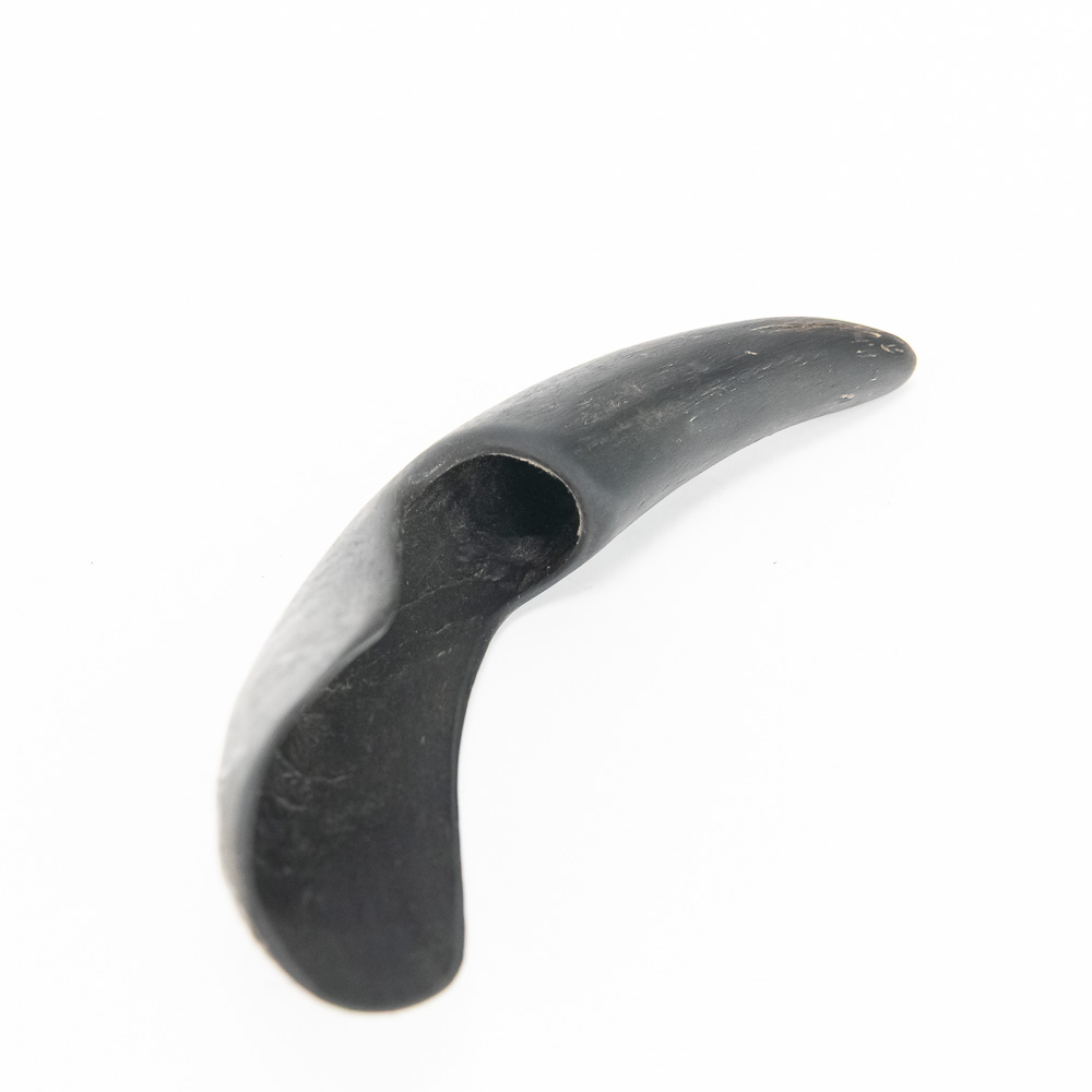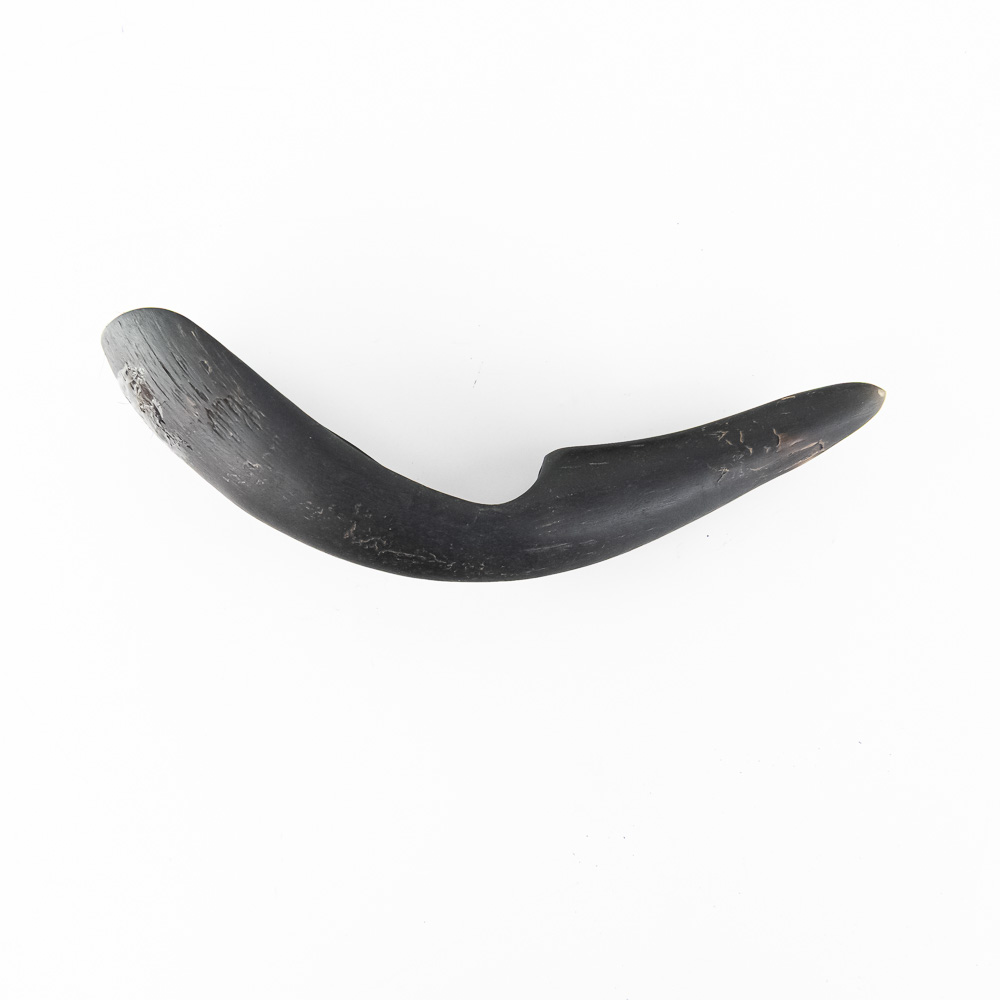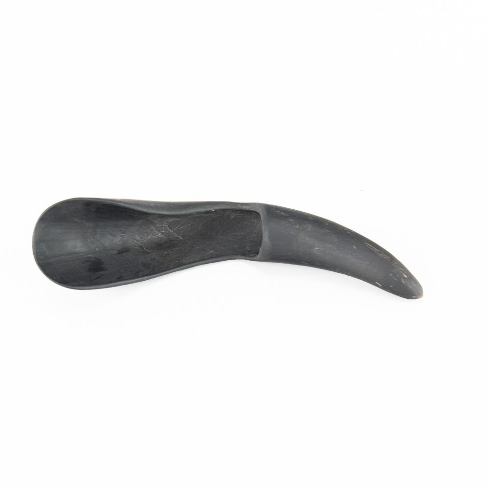 This is a superb example of a North American hand-carved horn implement, crafted from a dense, dark material, most likely buffalo or bovine horn. Its distinct, crescent-like form, featuring a deep, scooped bowl on one end that tapers to a pointed, slightly curved handle, is characteristic of a powder horn scoop or a small, utilitarian serving ladle. The style is typical of American folk art or items crafted for personal use throughout the 18th and 19th centuries, particularly on the frontier where materials like horn were readily available and durable. It exhibits a deep, near-black coloration with subtle grain or texture. Condition is very good overall, noting expected minor surface wear, including light scratches and small nicks along the inner rim and convex surfaces. Visible residue on the outer, convex surface of the scoop’s bowl, possibly mineral residue from its final storage environment. H 1.75″, W 7.25″, D 1.75″. From the Native American display in Donley’s Wild West Town.