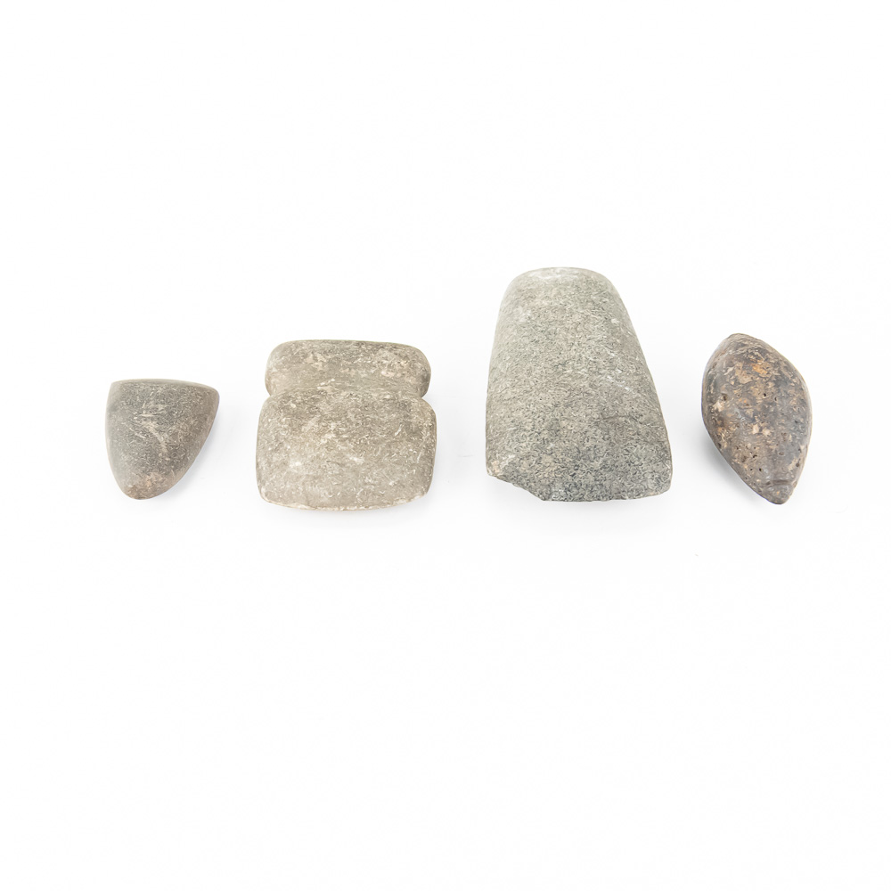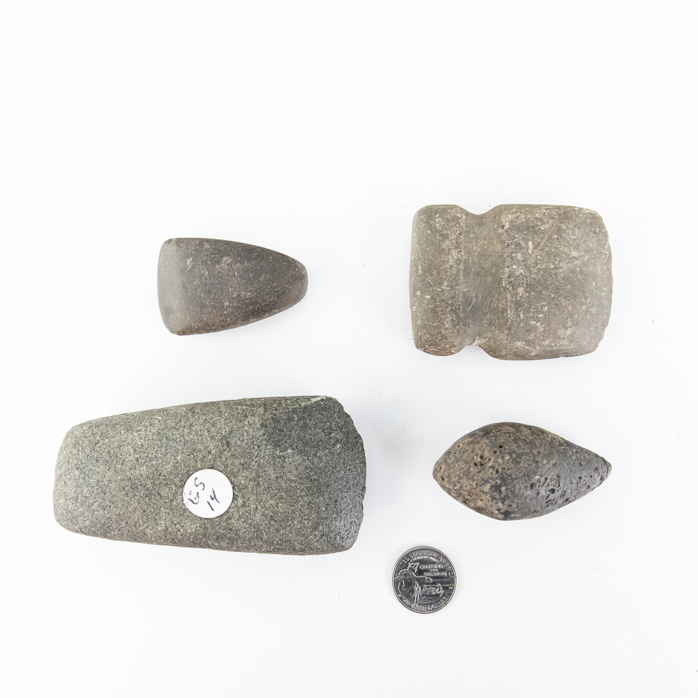 This fascinating assortment of prehistoric ground stone tools likely dates to the Archaic or Woodland periods. The implements appear to be made of metamorphic or igneous stone, such as granite or basalt, fashioned through pecking and grinding—a signature of ancient tool-making technology. The lot includes four distinct artifacts: an elongated hand stone or cel; a distinctively shaped grooved axe head or maul, designed for hafting; a smooth, ovate pestle or hammerstone; and a smaller cel or axe head bit. All four pieces exhibit considerable patination and wear consistent with age and use, displaying the characteristic smoothness from extensive grinding and handling. Aside from the largest piece, no major chips or breaks are immediately visible; surface textures show the expected natural inclusions and weathering typical of lithic artifacts. Largest axe L 4.25″, W 2.75″, D1” Grooved axe; L 2.75″, W 2.25″, D .75″; Oval head L 2.5″, D 1.25″; Smallest axe L 2.25″, W 1.25″, D 1.5″ From the Native American display in Donley’s Wild West Town.