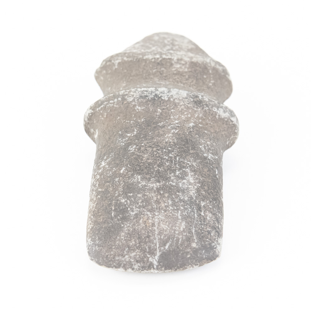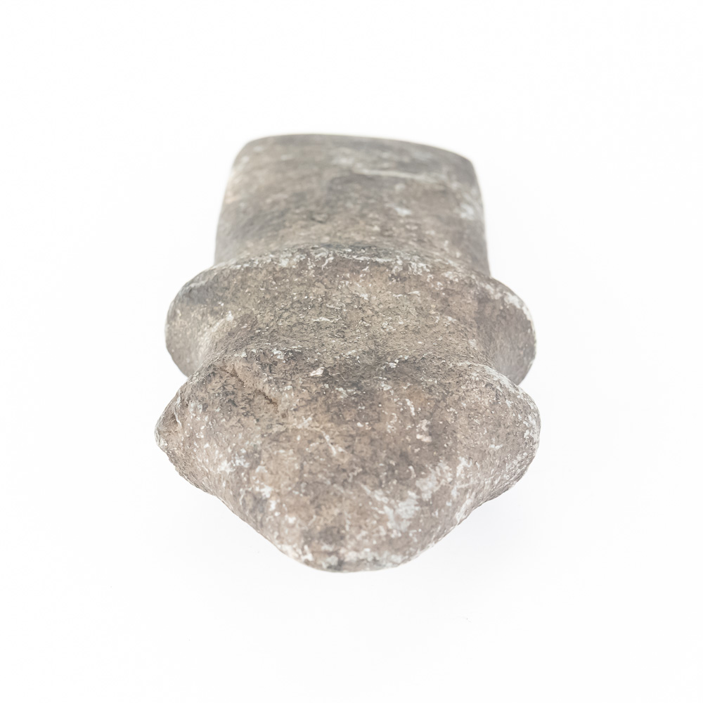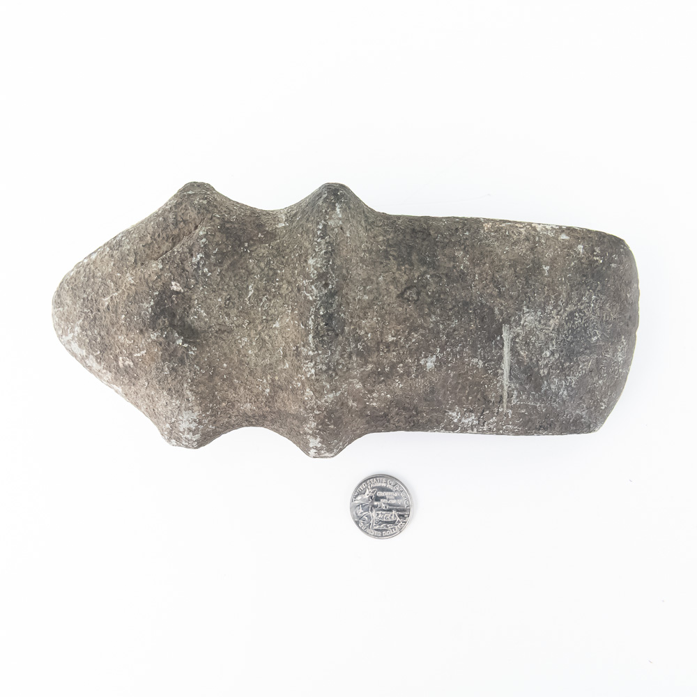 This is an exceptional example of a full-grooved stone axe head, an artifact typically associated with prehistoric Native American cultures, dating possibly to the Archaic or Woodland Periods (roughly 8000 B.C. to A.D. 1000). Crafted from a dense, dark igneous or metamorphic stone—likely basalt, granite, or similar hard rock—it was shaped through a laborious process of pecking and grinding. The characteristic groove, running circumferentially around the middle, was essential for securely hafting the axe to a wooden handle, a technique that would have provided a powerful tool for felling trees, woodworking, or heavy butchering. This particular style exhibits a robust poll (butt end) and a well-formed cutting edge (bit). The condition is consistent with age and typical use wear; the surface shows significant patina, minor surface pitting from weathering, and the edges of the groove and the bit exhibit the expected dulling and micro-chips from percussive use and time. H 2.25″, W 8.25″, D 3.75″. From the Native American display in Donley’s Wild West Town.
