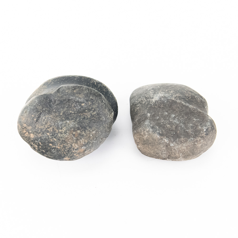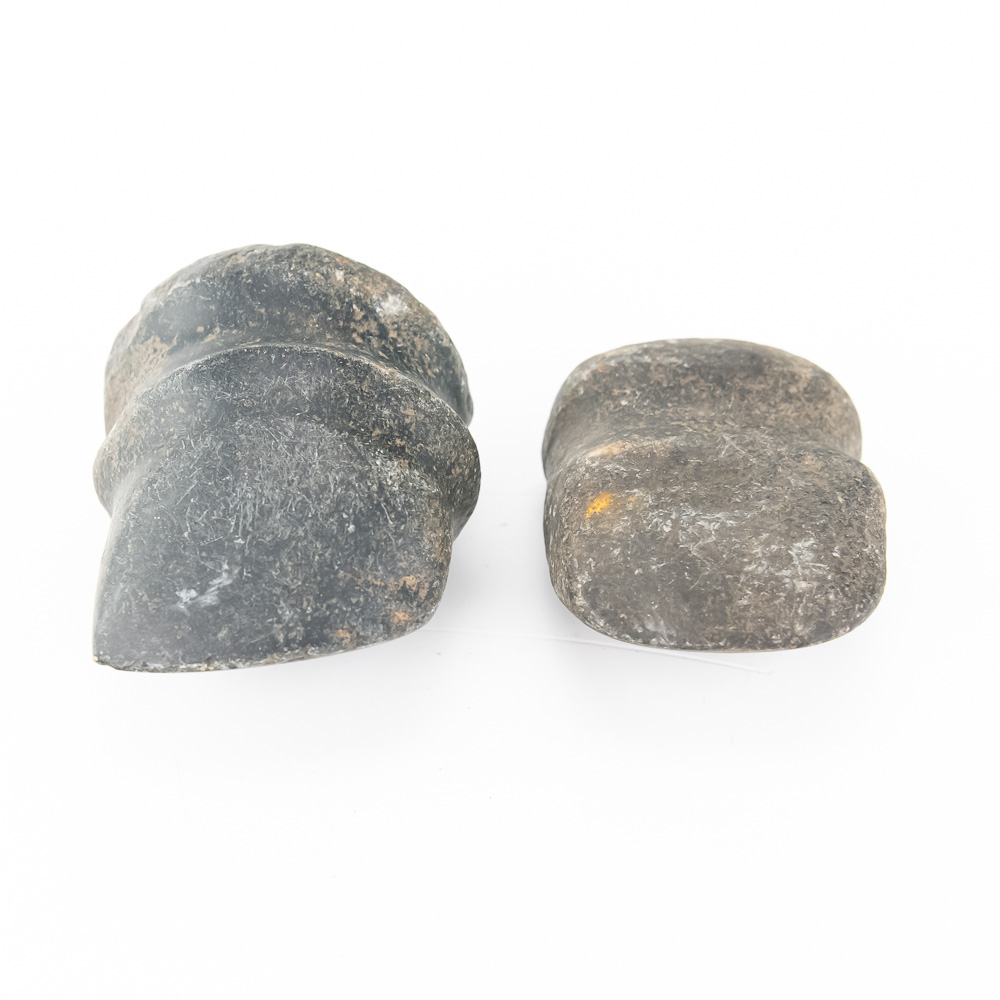 These two excellent examples appear to be Archaic or possibly early Woodland period grooved stone tools, likely a form of axe or maul/hammerstone. The material is a dark, fine-grained igneous or metamorphic rock such as basalt, diorite, or possibly a very hard slate, consistent with prehistoric ground stone artifacts intended for heavy use. Both feature the characteristic full or three-quarter groove pecked and ground into the midsection, which was used for hafting a wooden handle. The larger, fatter piece shows a more pronounced, deeper, and smoother groove, indicative of a finer finish or greater wear/polishing from use. The overall style is classic for Native American prehistoric implements used for wood clearing, processing game, or quarrying. Condition for both is good to very good, with expected surface wear, minor pitting, and patina consistent with age and subterranean recovery. Working faces appear intact. The thinner tool measures approximately H 1.25″, W 3″, D 2.25″. The fatter tool measures approximately H 2″, W 3.25″, D 2.5″. From the Native American display in Donley’s Wild West Town.