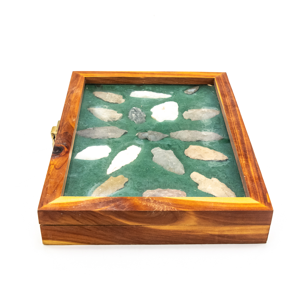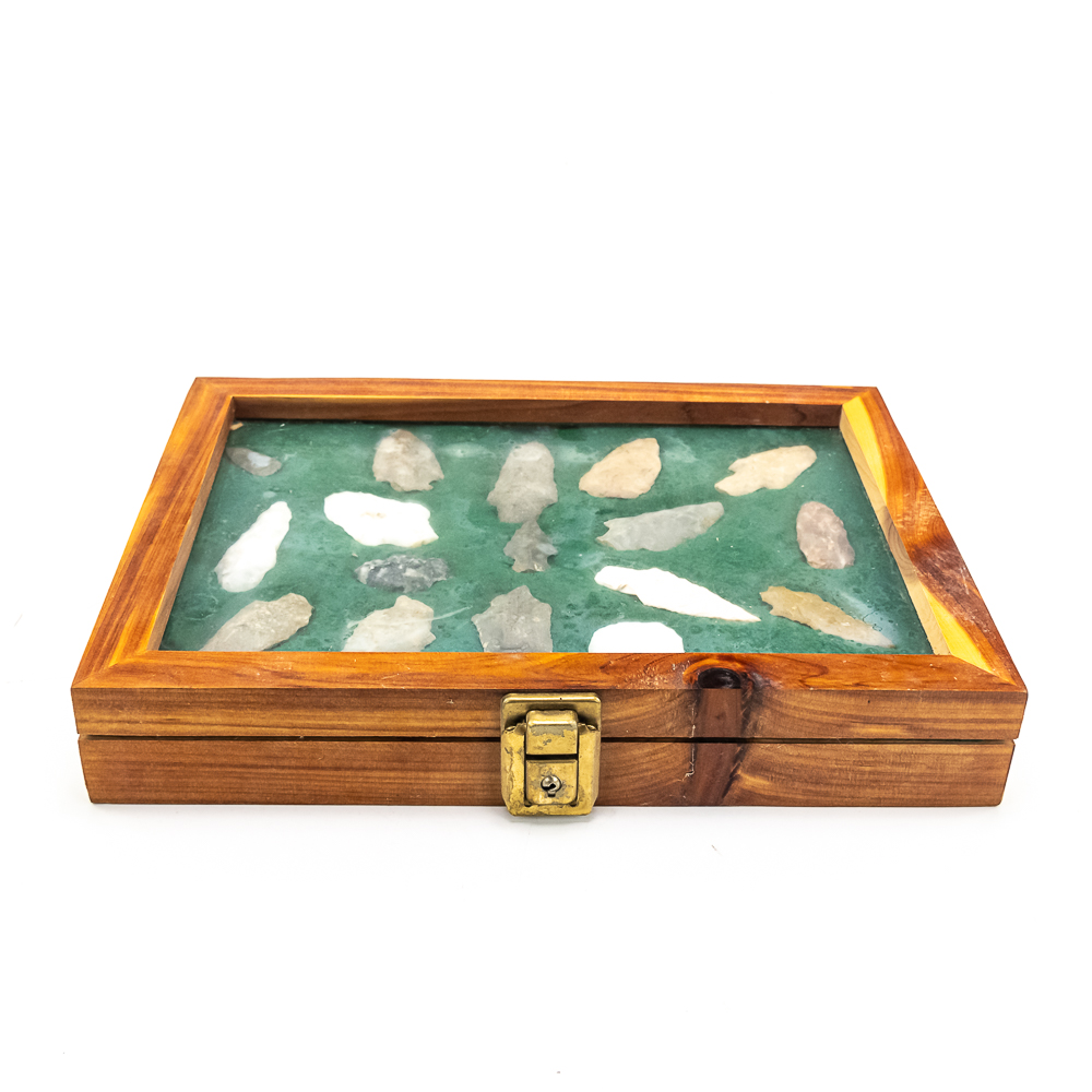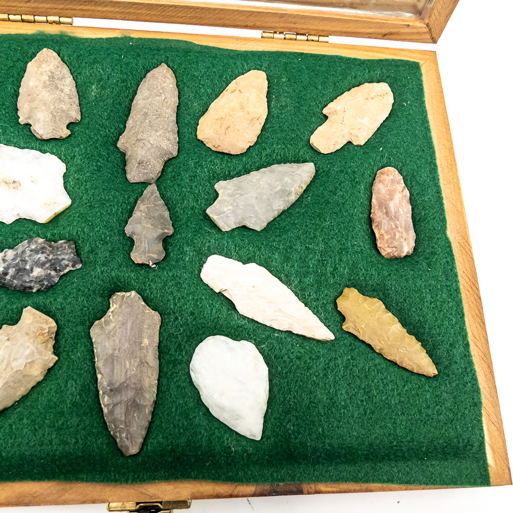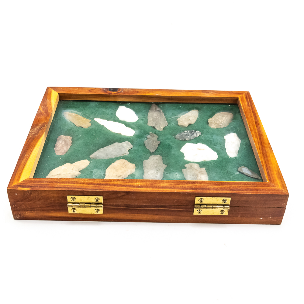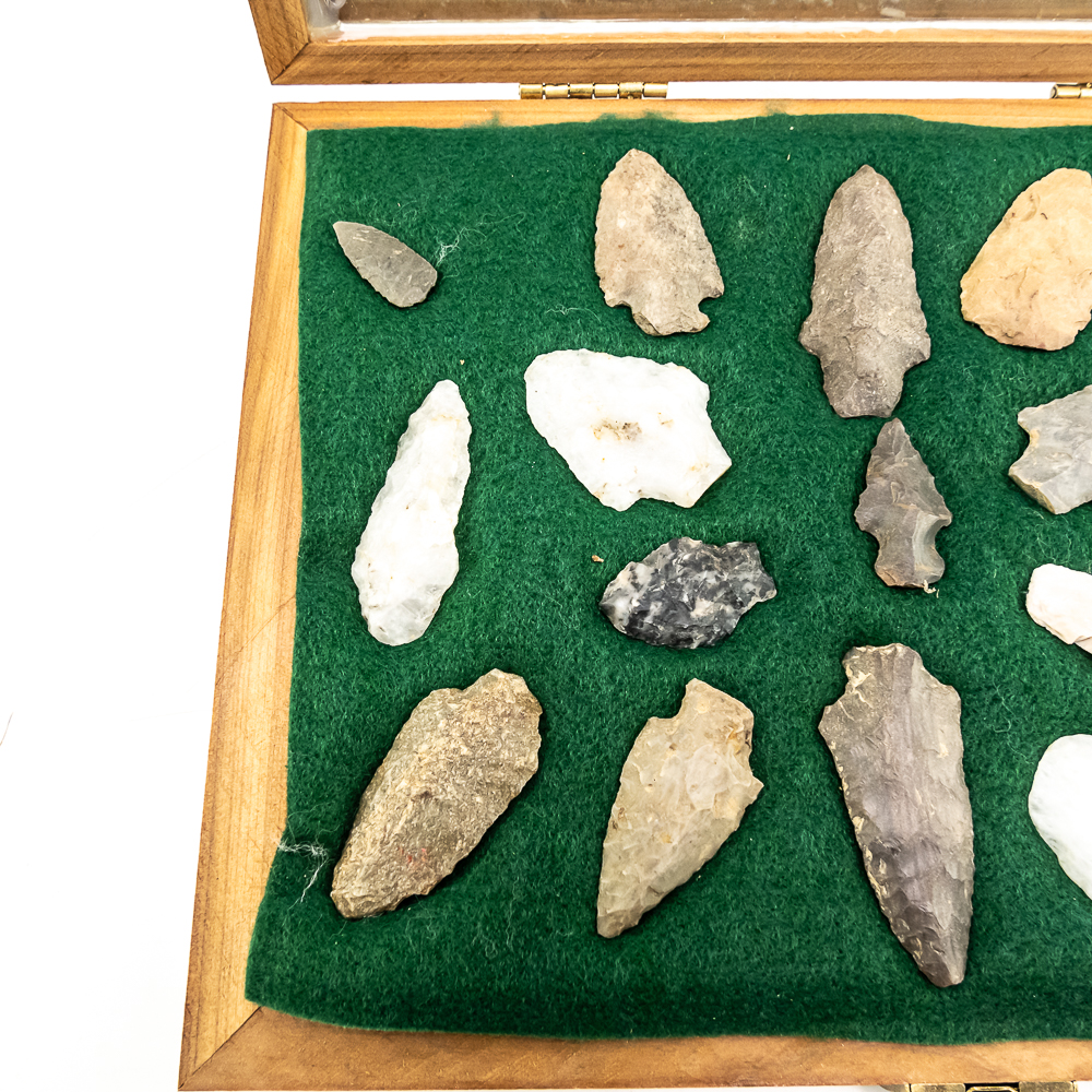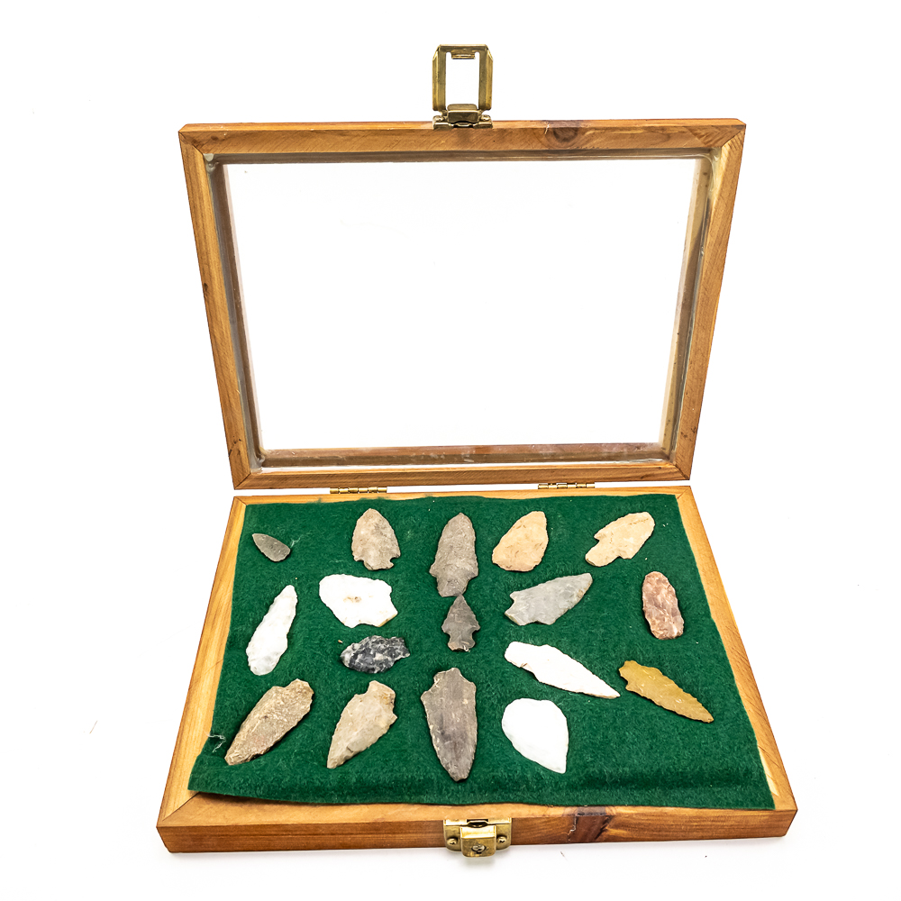 A collection of 17 arrowheads prehistoric projectile points recovered from Wisconsin. Made from various materials including Flint, Quartzite and Chert. The styles include: triangular, stemmed and lanceolate points. Sizes range from 1.25” to 2.75” in length. Case dimensions: 12”x9”x2”. Please see photos.