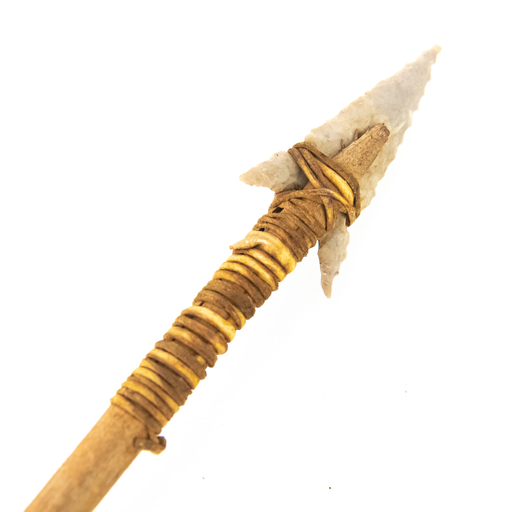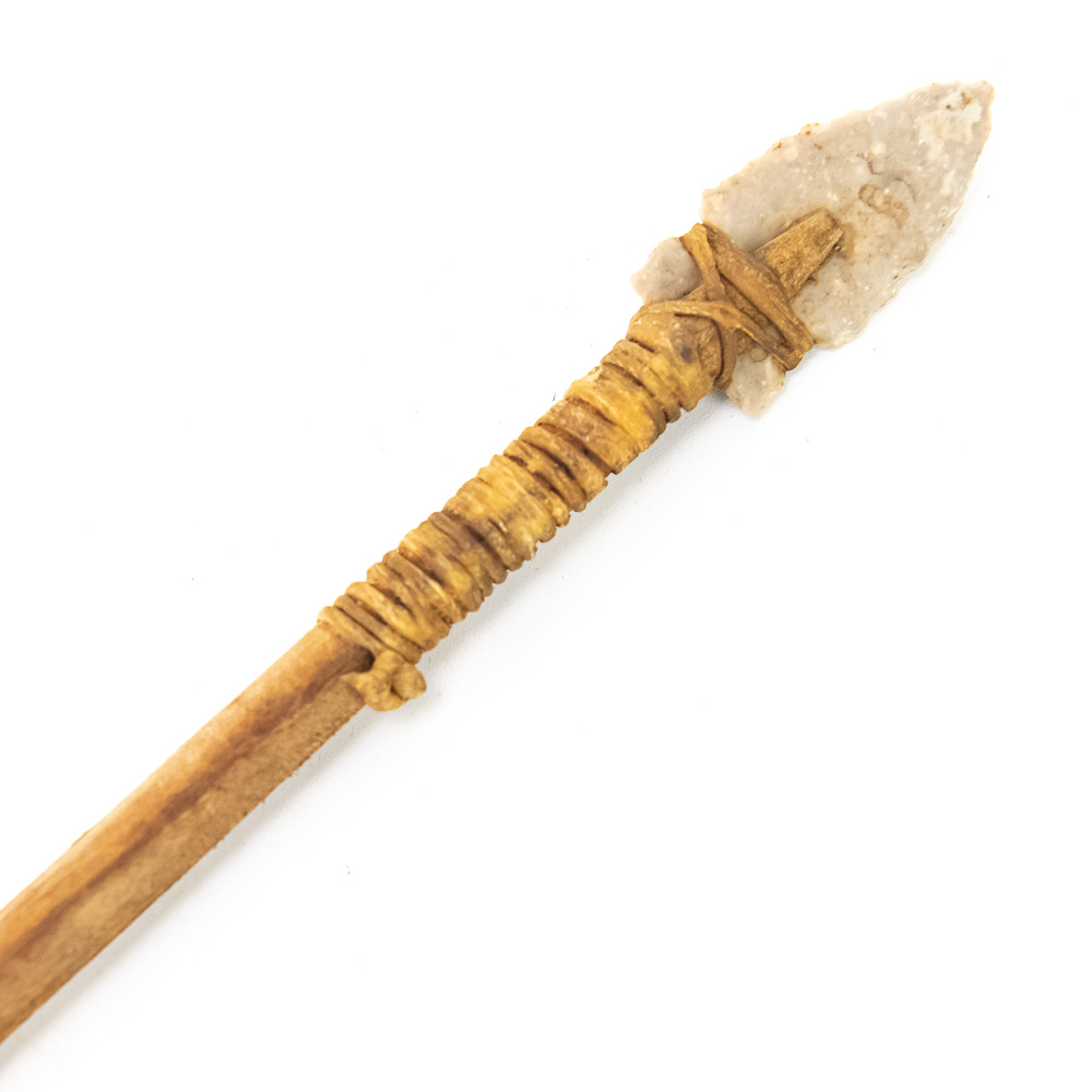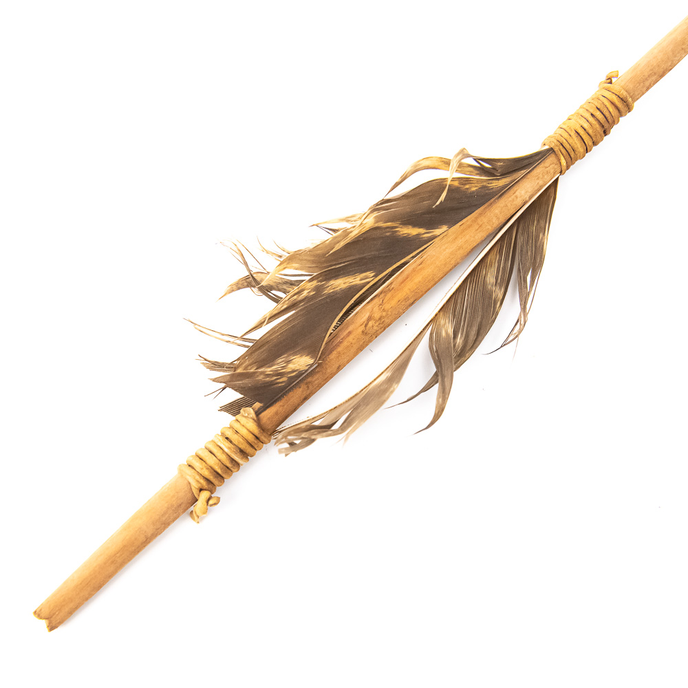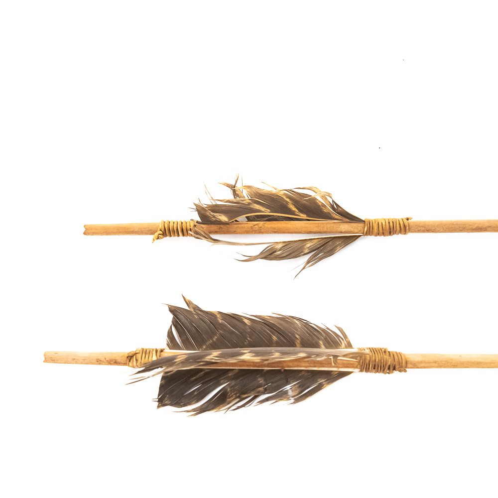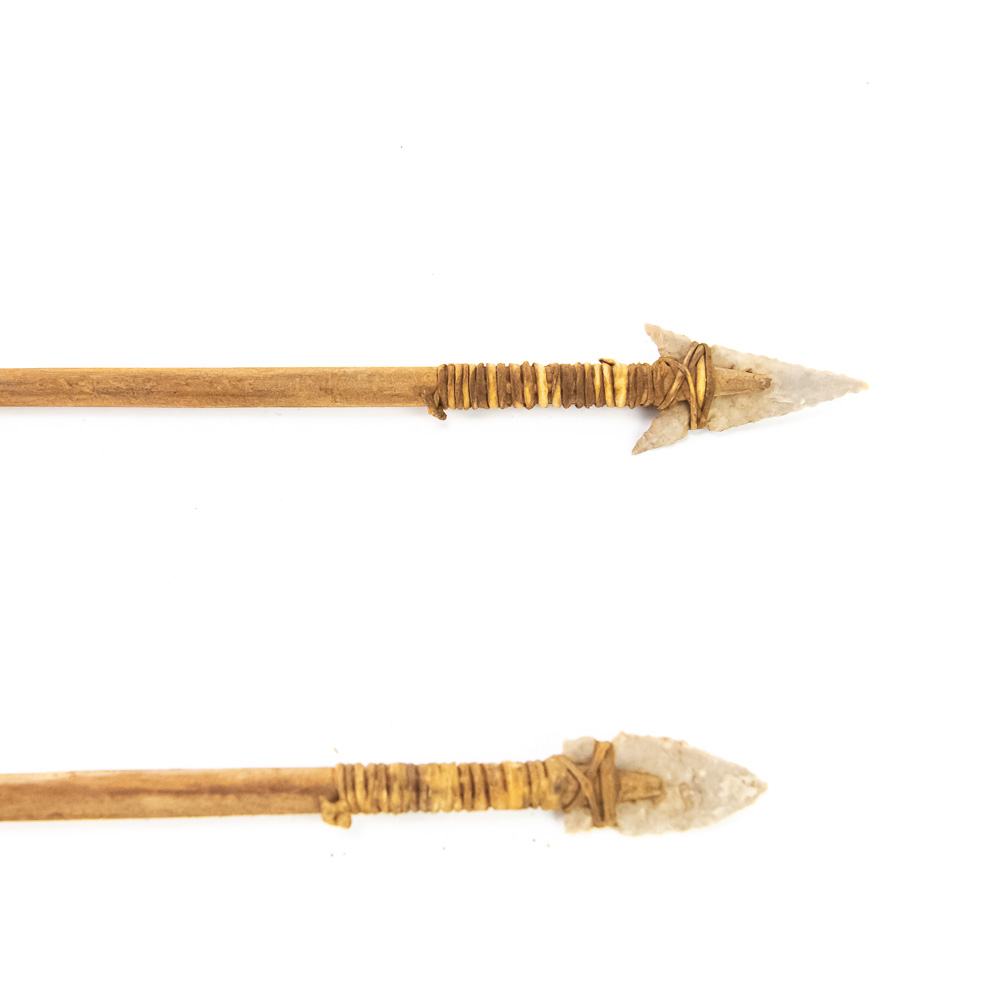 These are a pair of primitive-style arrows, likely modern reproductions, expertly crafted in the traditional manner. Each features a natural wooden shaft, flint-knapped stone projectile point (arrowhead), and natural feather fletching secured with sinew or leather cord wrapping . The stone points are well-formed, suggesting a style inspired by Paleo-Indian or Archaic period artifacts. The feather fletching appears to be natural bird feathers, perhaps hawk or turkey, split and attached with wrapping to aid in flight stabilization. While the exact maker and city of origin are not identifiable from the images, the quality of the knapping and construction suggests a skilled artisan. Condition is excellent; they appear to be modern, well-preserved pieces with no significant chips, breaks, or material loss. The wrapping is tight, and the fletching is full, showing only minor expected wear from handling or storage. L 25″, W 1.5″, D 0.5″ From the Native American display in Donley’s Wild West Town.