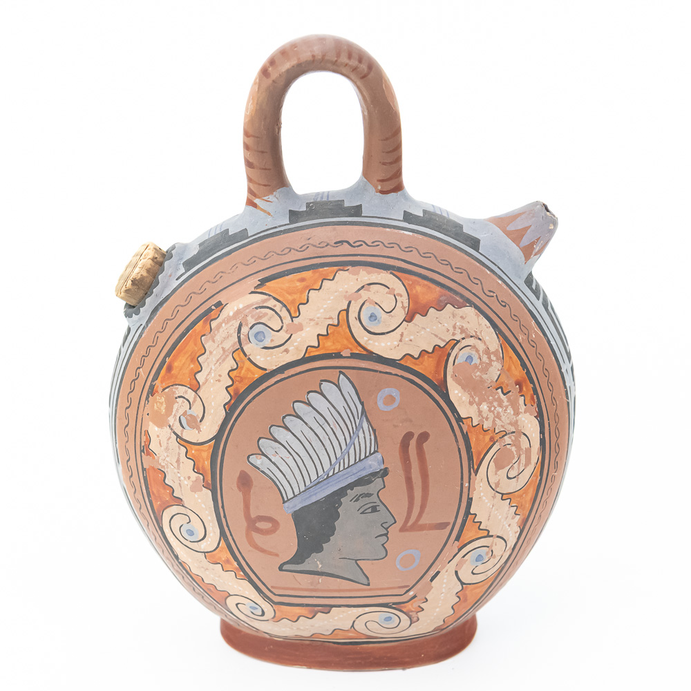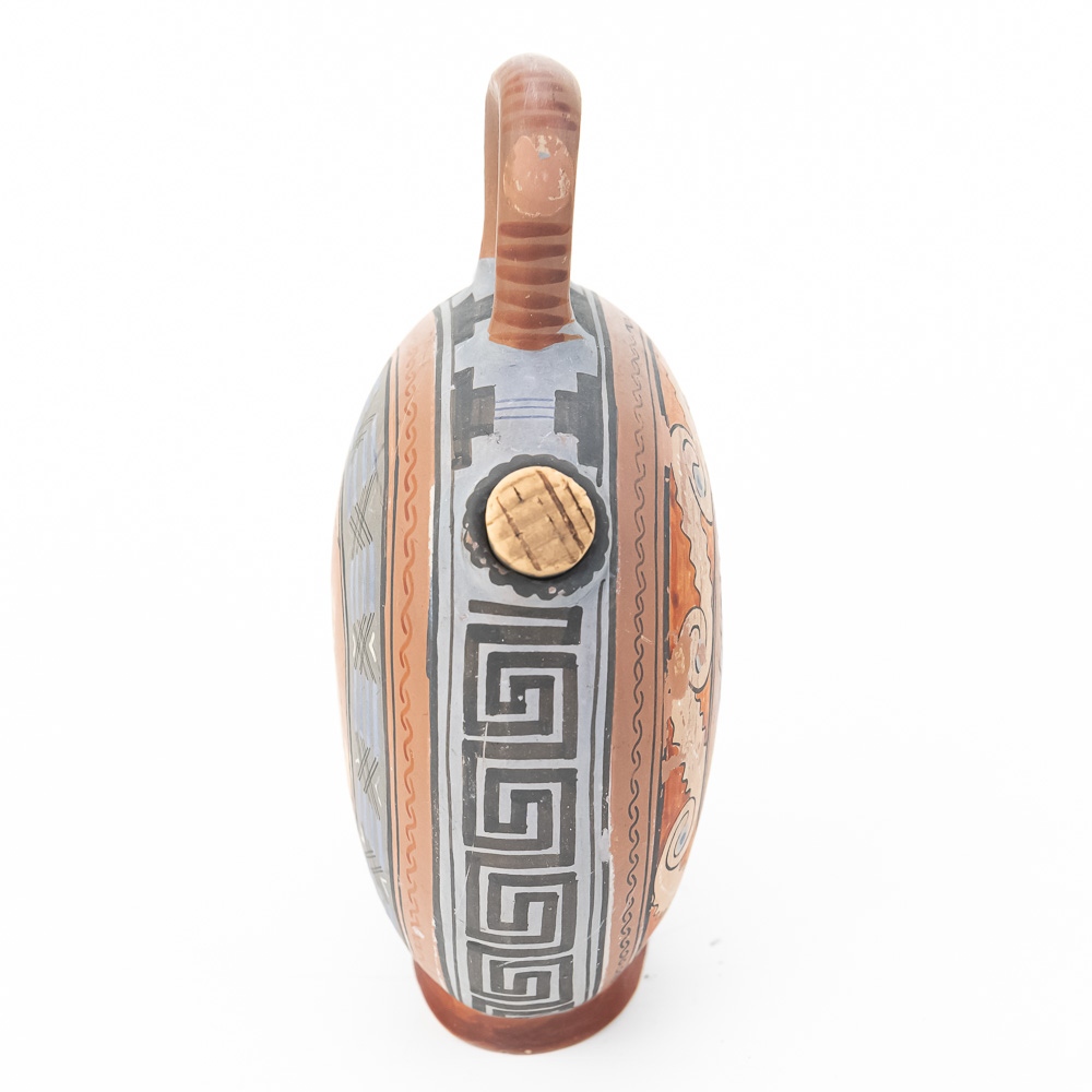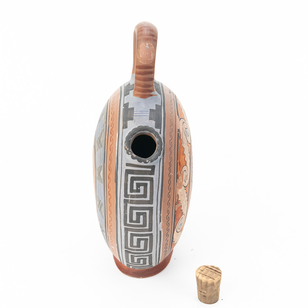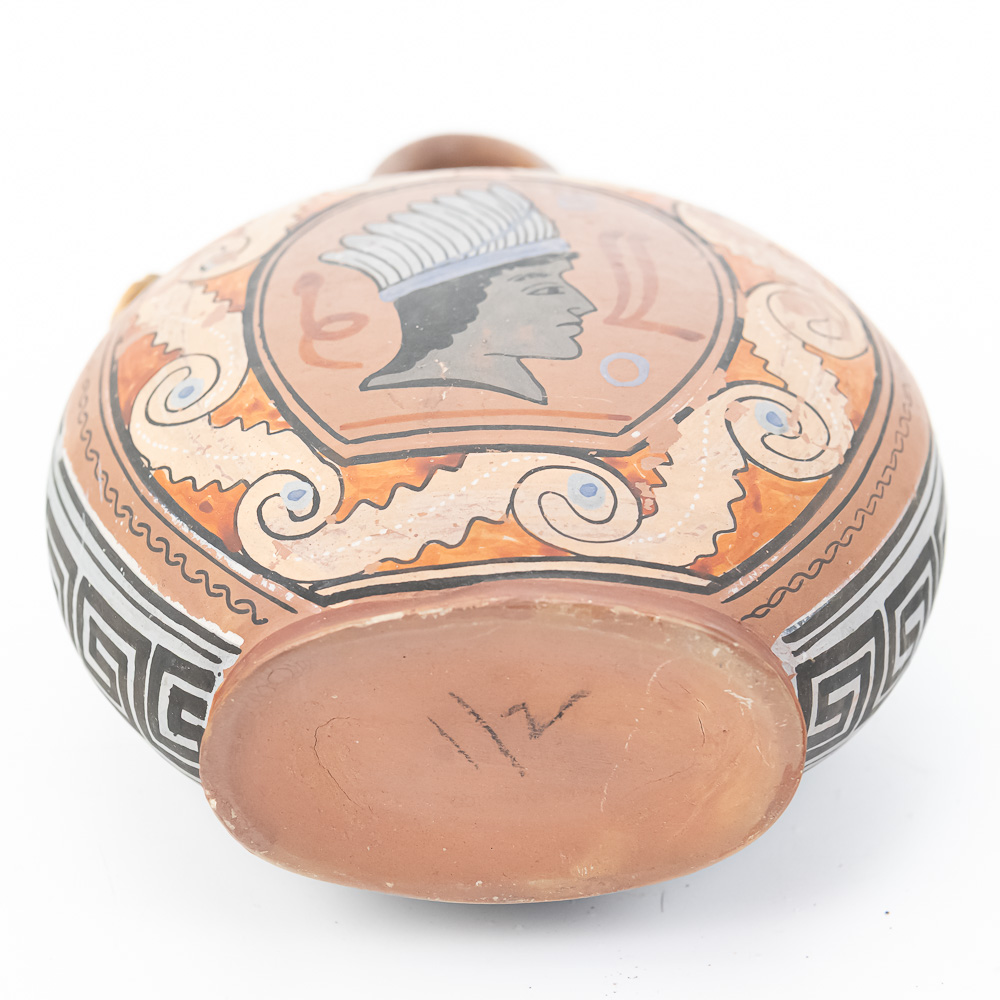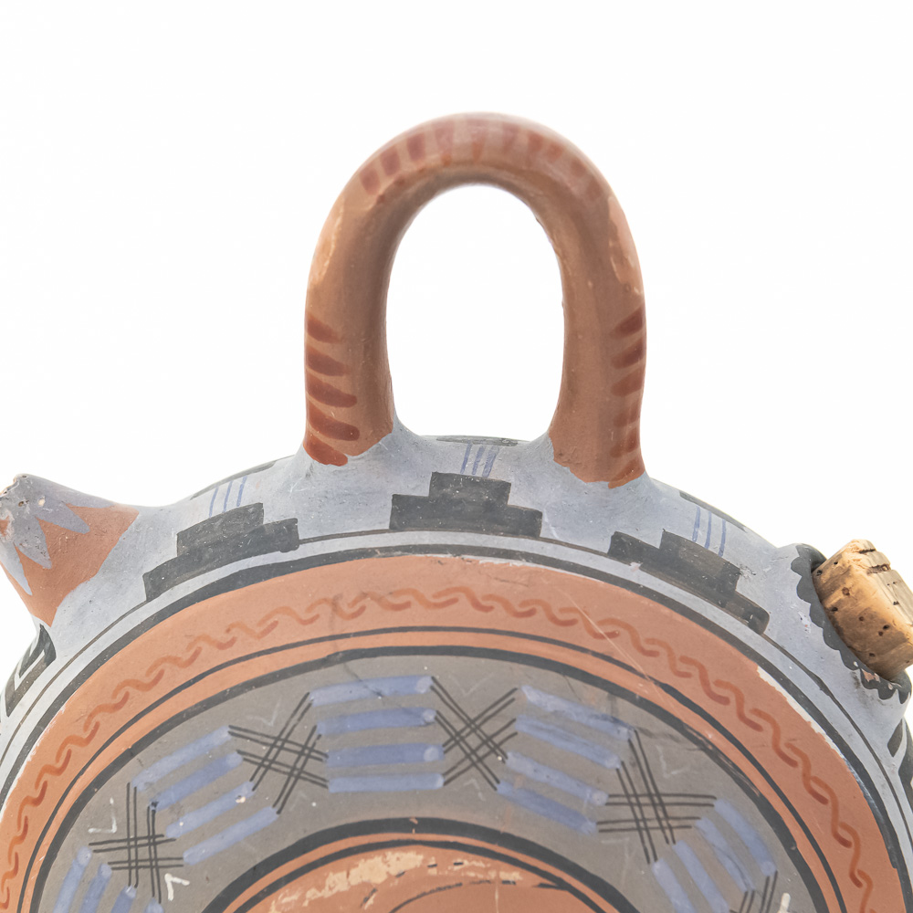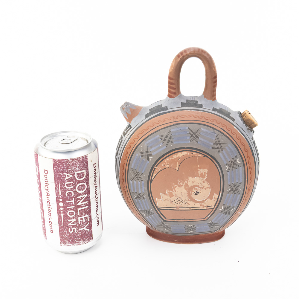 This remarkable terracotta flask, or askos, is a perfect example of mid-20th-century Mexican tourist pottery, likely emanating from a major artistic center such as Tonalá or Tlaquepaque in Jalisco, which catered heavily to American travelers. These souvenir pieces often feature a deliberate and fascinating blend of influences: the globular canteen form echoes ancient Greek or Roman askoi and local pre-Columbian water vessels, while the decorative motifs combine the classical Greek Key or meander pattern with polychrome figurative elements inspired by Aztec or Mayan profiles. The style is an excellent crossover piece, possessing a finish and color palette that also allowed it to appeal to the popular Southwestern American décor market. This particular piece is boldly hand-painted with a central profile bust wearing a feathered headdress on one side, and a stylized ram or animal figure on the reverse, all in a traditional red, black, white, and blue-gray palette. It includes an integrated loop handle and a narrow spout plugged with a cork. The vessel is in good, commensurate-with-age condition, displaying significant wear that is desirable in folk art of this type, including notable surface abrasions, paint loss, and small chips, particularly on the relief figures and along the edges, confirming its life as a well-traveled souvenir. H 8.5″, W 6.25″, D 3.25″. From the Native American display in Donley’s Wild West Town.