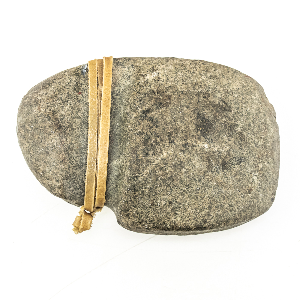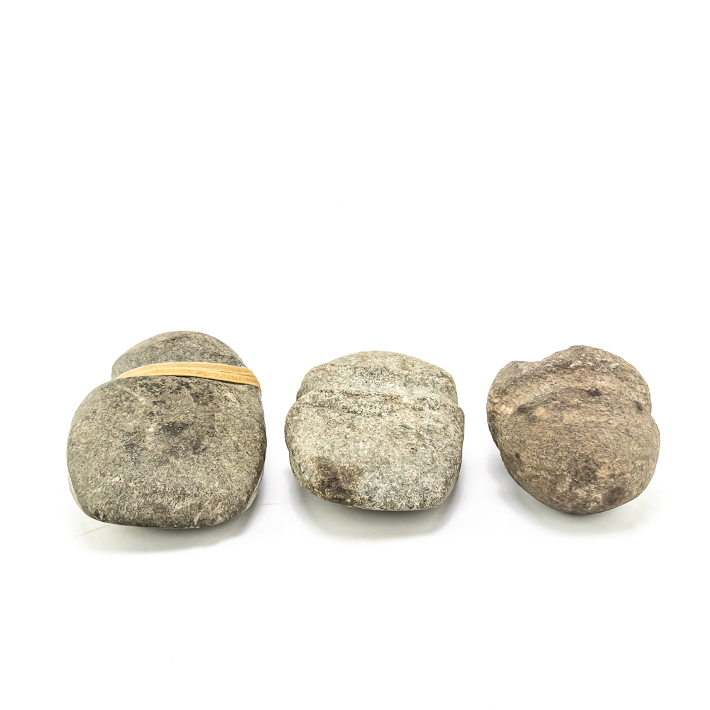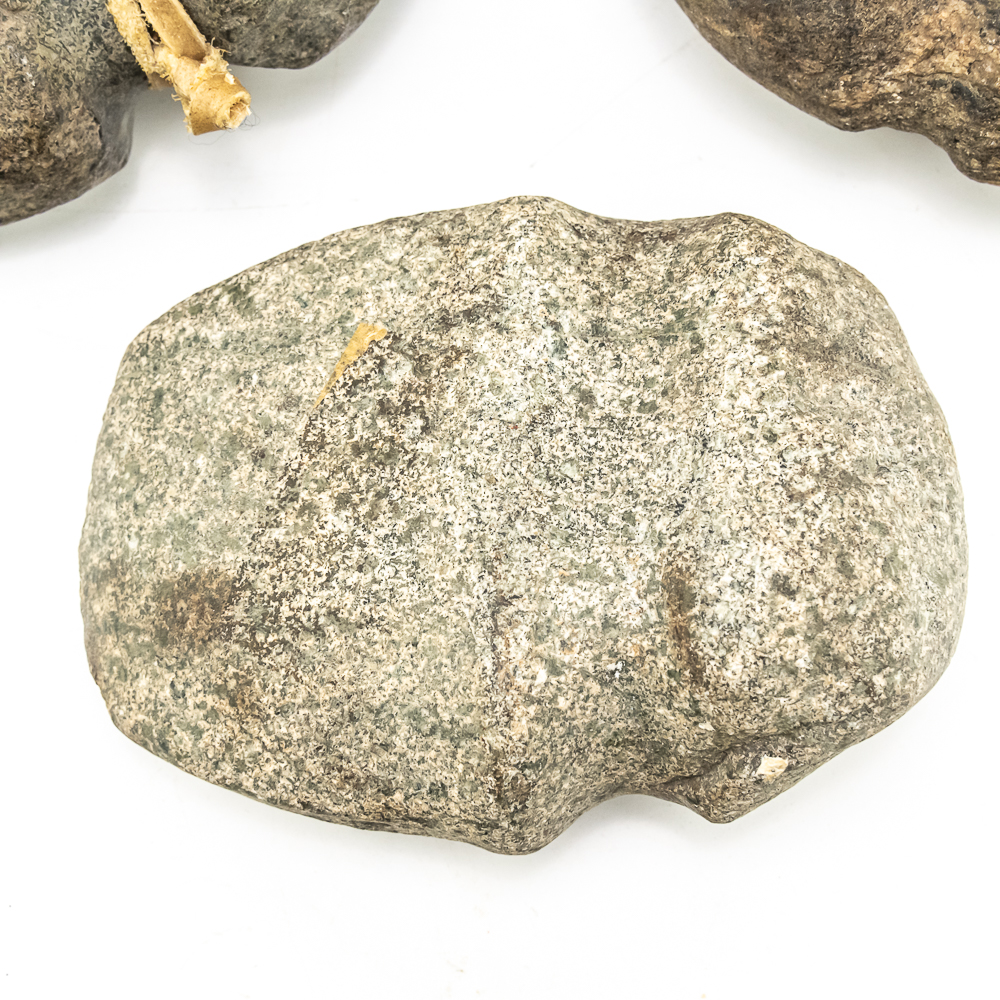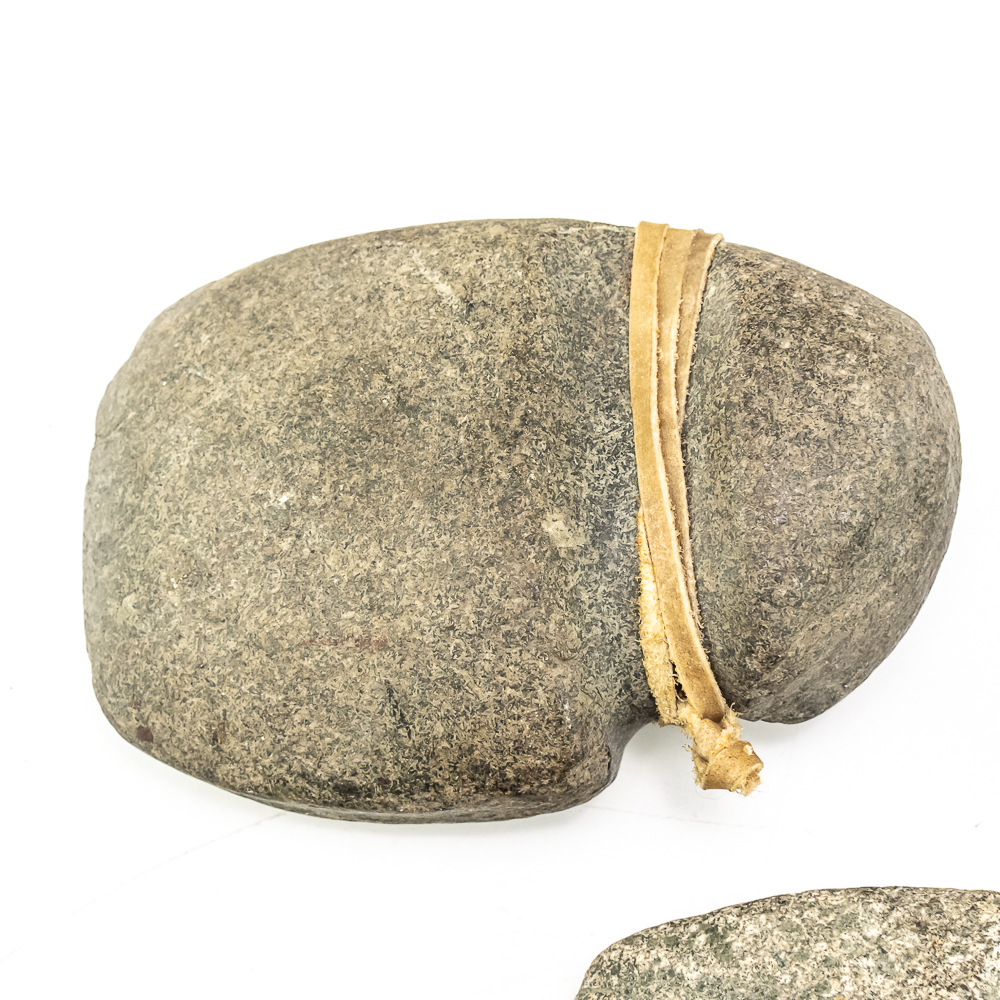 Three prehistoric stone grooved axes-North America. Axe #1 is the largest of the three and made from a smooth dark grey stone featuring a well-defined groove around its center. A length of sinew has been added to simulate how it may have been hafted to a handle. Dimensions: 6.75” x 4.25” 2.5”. Axe #2 is smaller and made from a rougher more textured stone. Its groove is prominent. One end is blunted and coarse while the other end is very rounded. Dimensions: 4.5” x 4” x2.75”. Axe #3 is made from a lighter colored, possibly sedimentary rock. It has a similar groove depth of axe #2 ,and its point tapers quite sharply. It is very smooth suggesting a significant amount of use or effort to craft. Dimensions: 5.75” x 4” x 2.25”. See photos.
