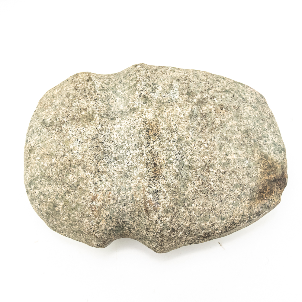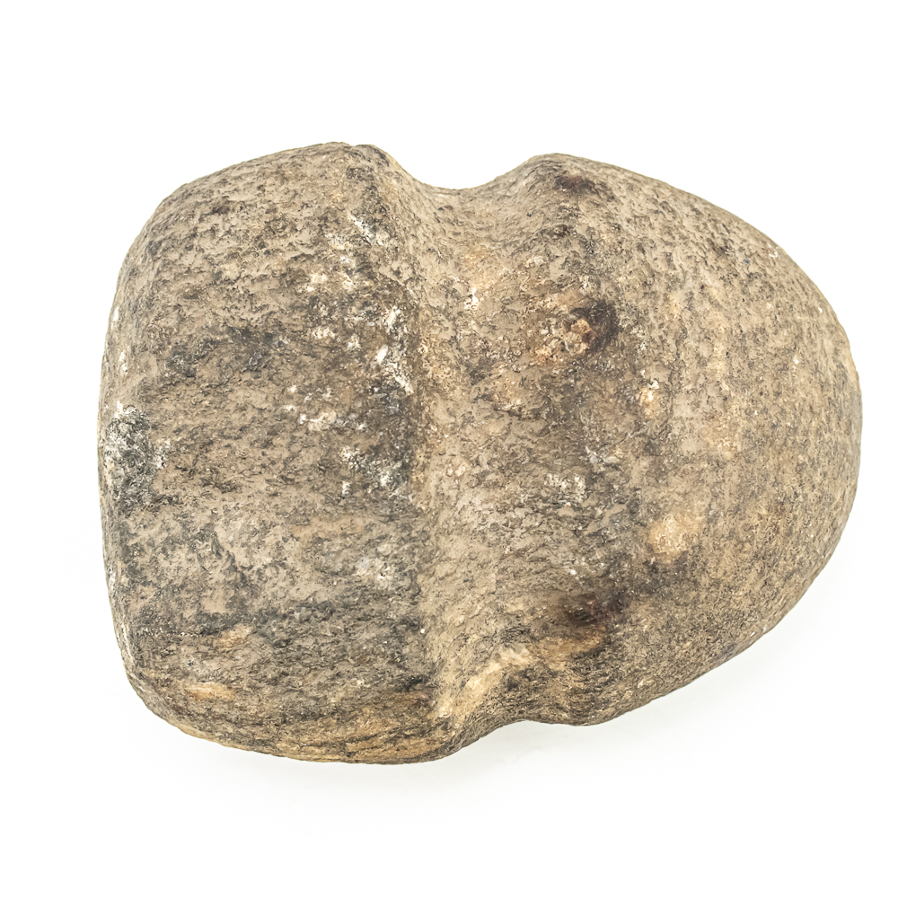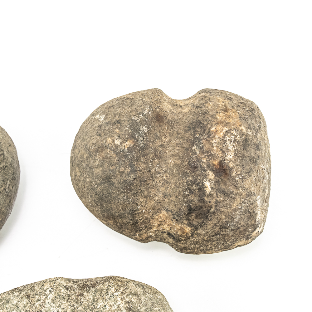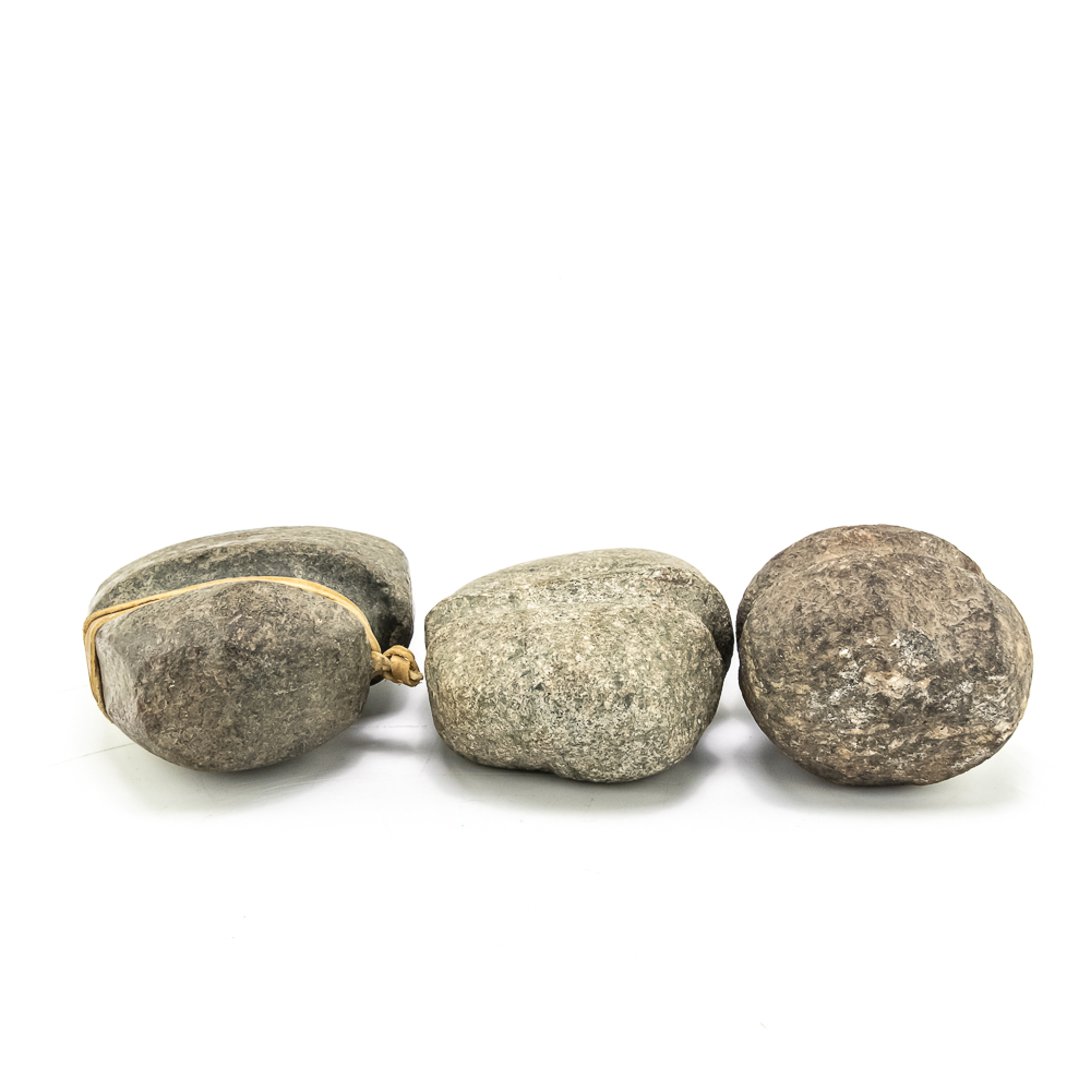 Three prehistoric stone grooved axes-North America. Axe #1 is the largest of the three and made from a smooth dark grey stone featuring a well-defined groove around its center. A length of sinew has been added to simulate how it may have been hafted to a handle. Dimensions: 6.75” x 4.25” 2.5”. Axe #2 is smaller and made from a rougher more textured stone. Its groove is prominent. One end is blunted and coarse while the other end is very rounded. Dimensions: 4.5” x 4” x2.75”. Axe #3 is made from a lighter colored, possibly sedimentary rock. It has a similar groove depth of axe #2 ,and its point tapers quite sharply. It is very smooth suggesting a significant amount of use or effort to craft. Dimensions: 5.75” x 4” x 2.25”. See photos.