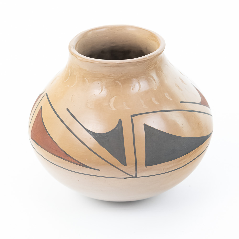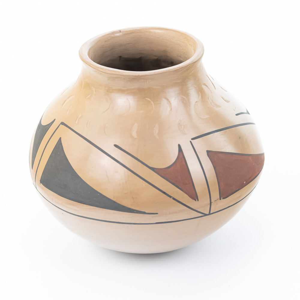 This is a wonderful example of Native American Pueblo pottery, likely from the Santa Clara Pueblo given the characteristic buff or tan slip, the polished finish, and the use of geometric and curved design elements in black (fire clouding/carbon paint) and red-brown pigments. The upper register features an incised or lightly carved pattern of repeating crescent or wave shapes, which adds a beautiful textural element to the traditional globular form with a flared rim. This style of pottery, featuring the combination of incised and painted designs, is highly collectible. The condition appears to be good with a nice sheen, showing some minor scuffs/surface wear and a few faint lines or marks consistent with age and handling. H 5.5″, W 6″, D 6′. From the Native American display in Donley’s Wild West Town.