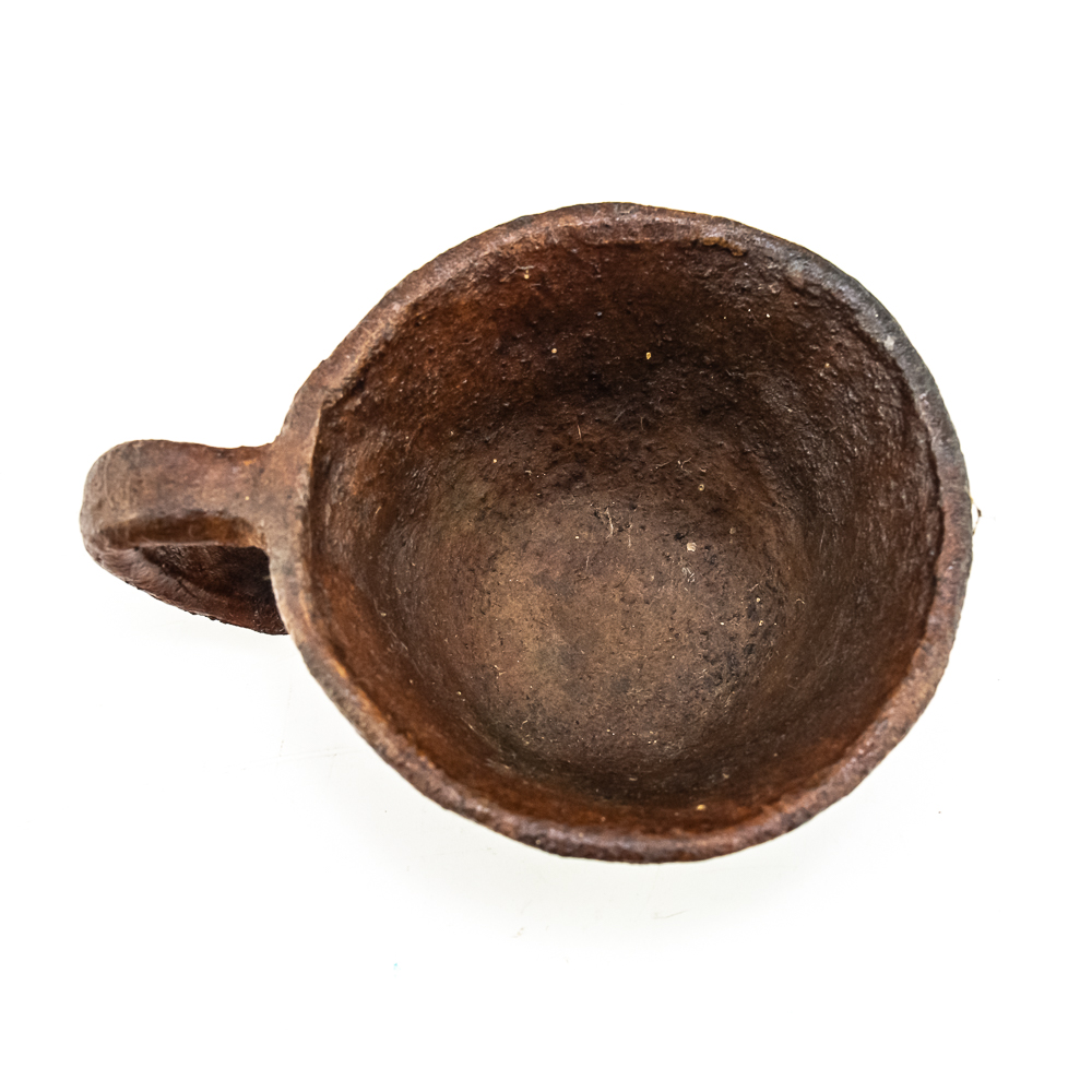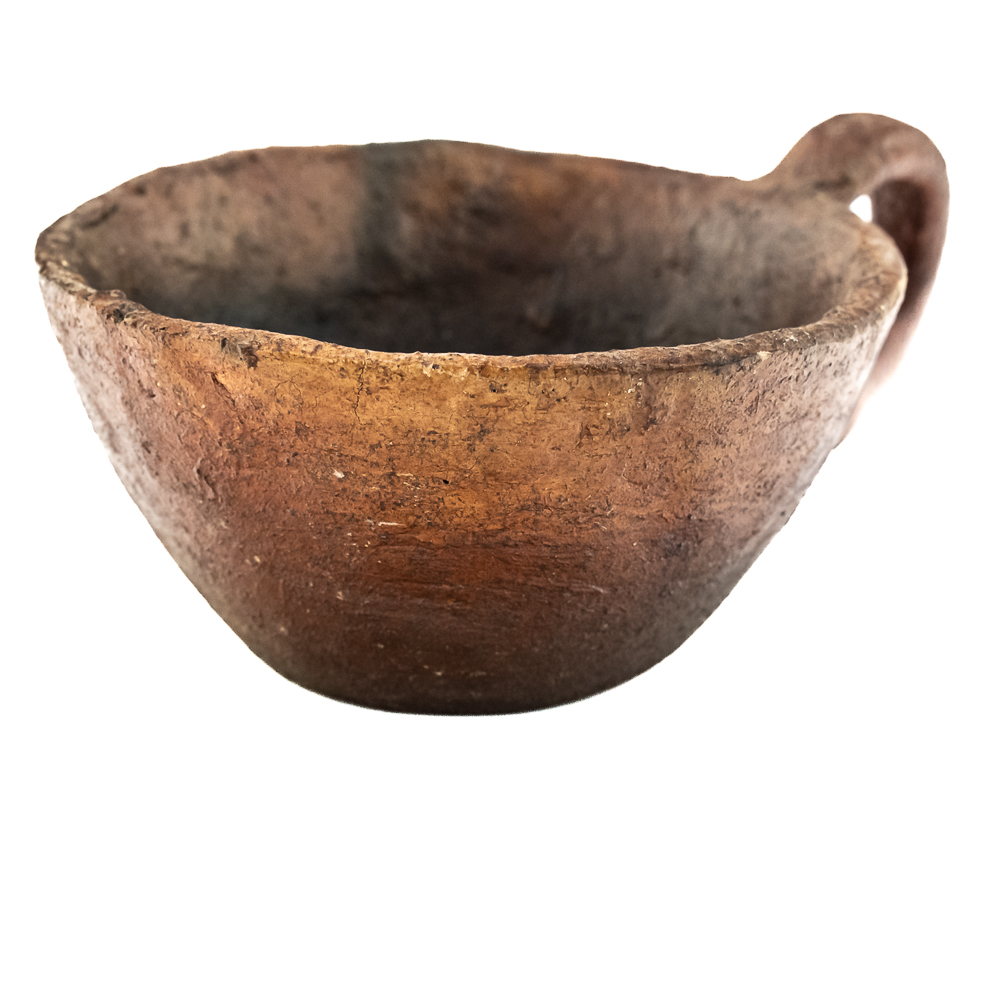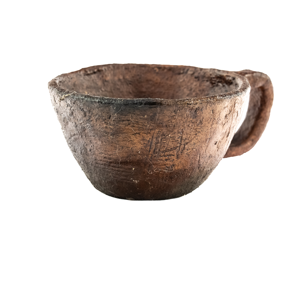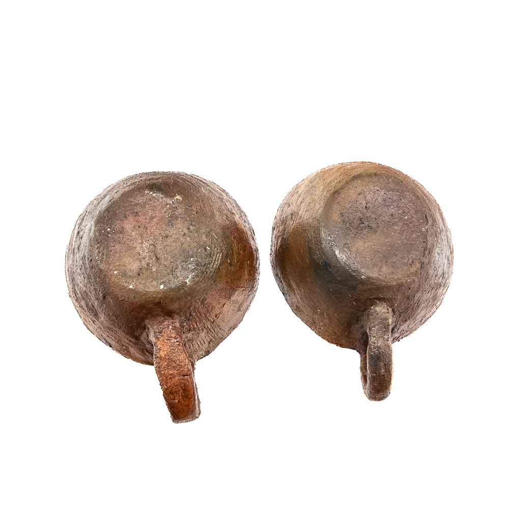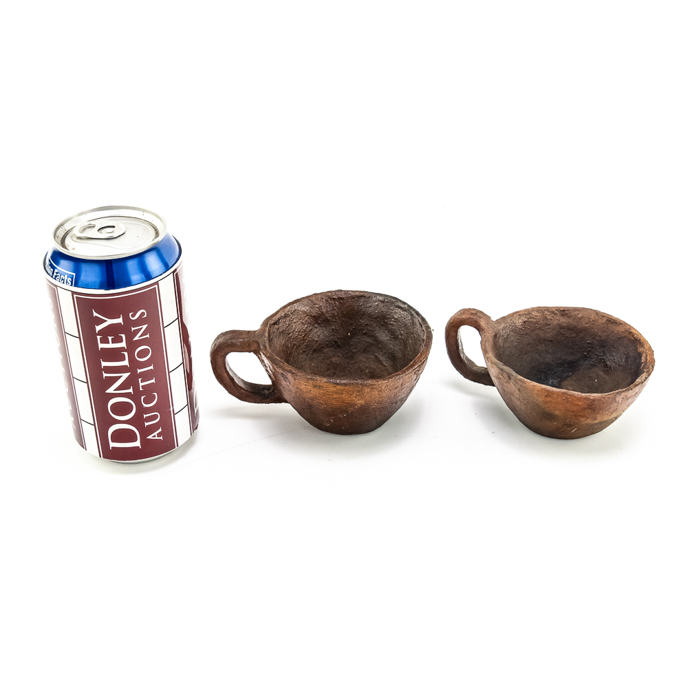 This pair of Apache clay cups are handmade with a rustic aesthetic mimicking western commercially manufactured coffee cups. Manufacture date unknown. Their exterior is rough and they look to be covered with some sort of protect coating. They have a simple bottom and a flat base 1 cup is larger than the other. Dimensions: 3.5” and 3.75” diameter x height: 2” and 1.75” respectively.