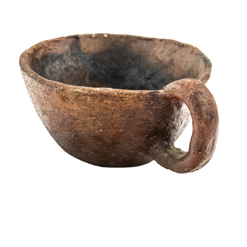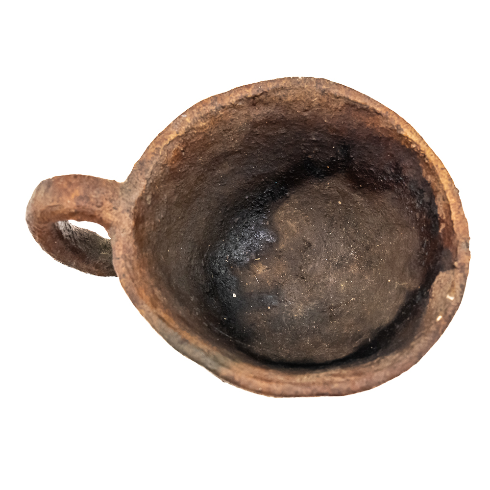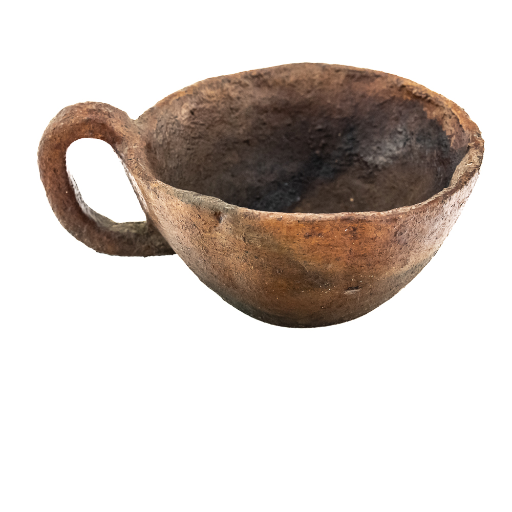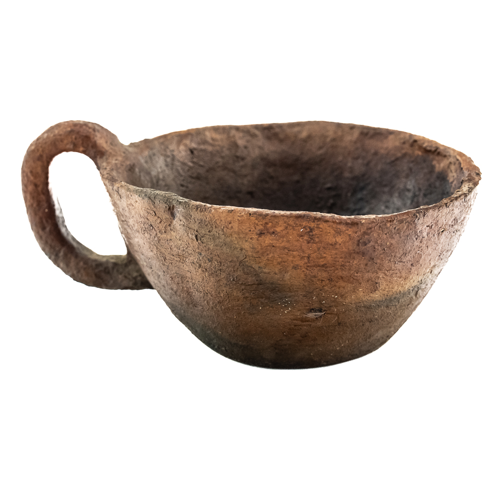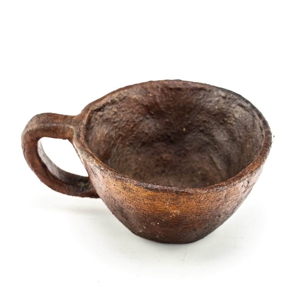 This pair of Apache clay cups are handmade with a rustic aesthetic mimicking western commercially manufactured coffee cups. Manufacture date unknown. Their exterior is rough and they look to be covered with some sort of protect coating. They have a simple bottom and a flat base 1 cup is larger than the other. Dimensions: 3.5” and 3.75” diameter x height: 2” and 1.75” respectively.