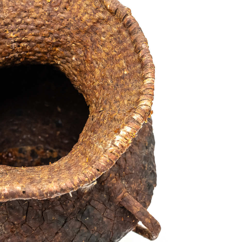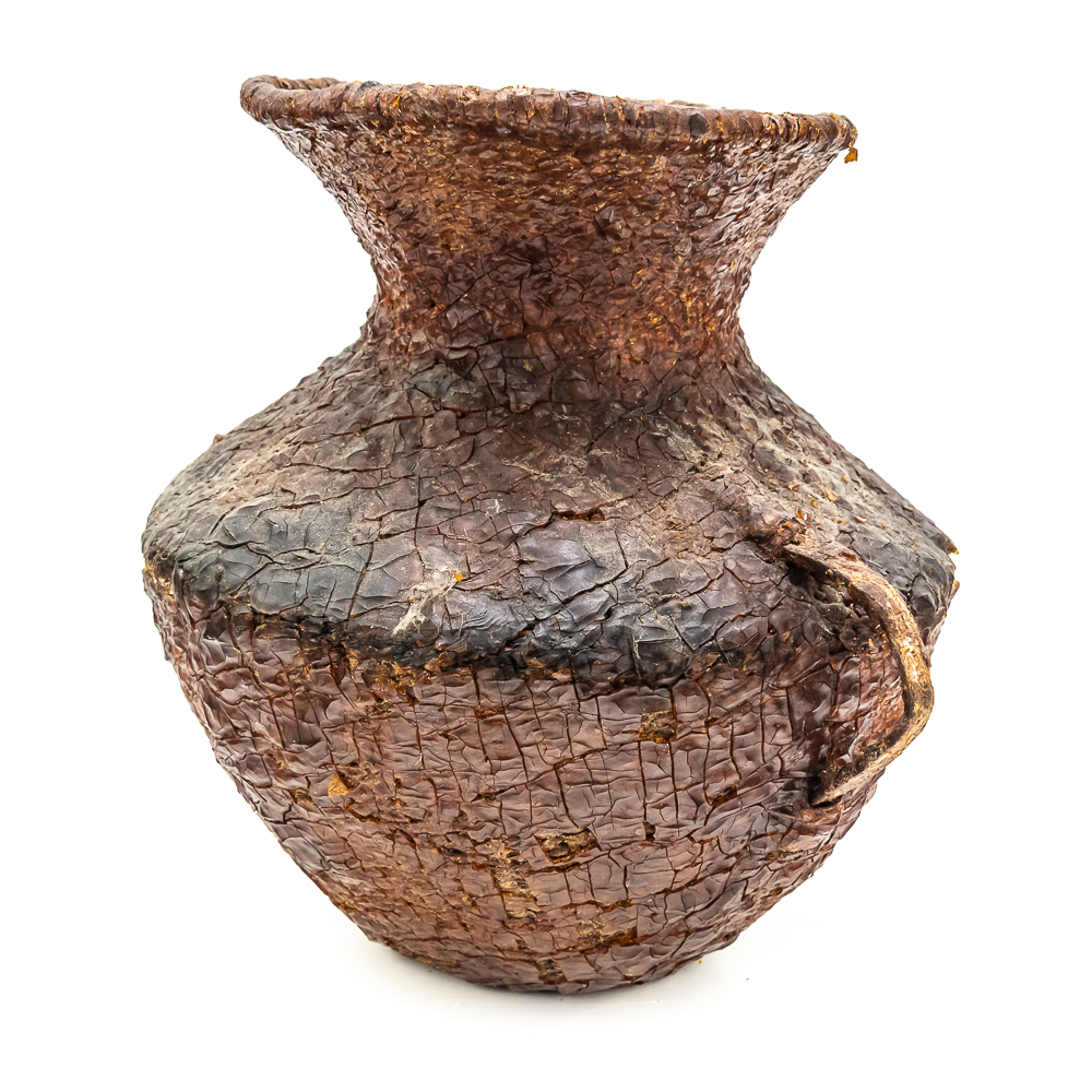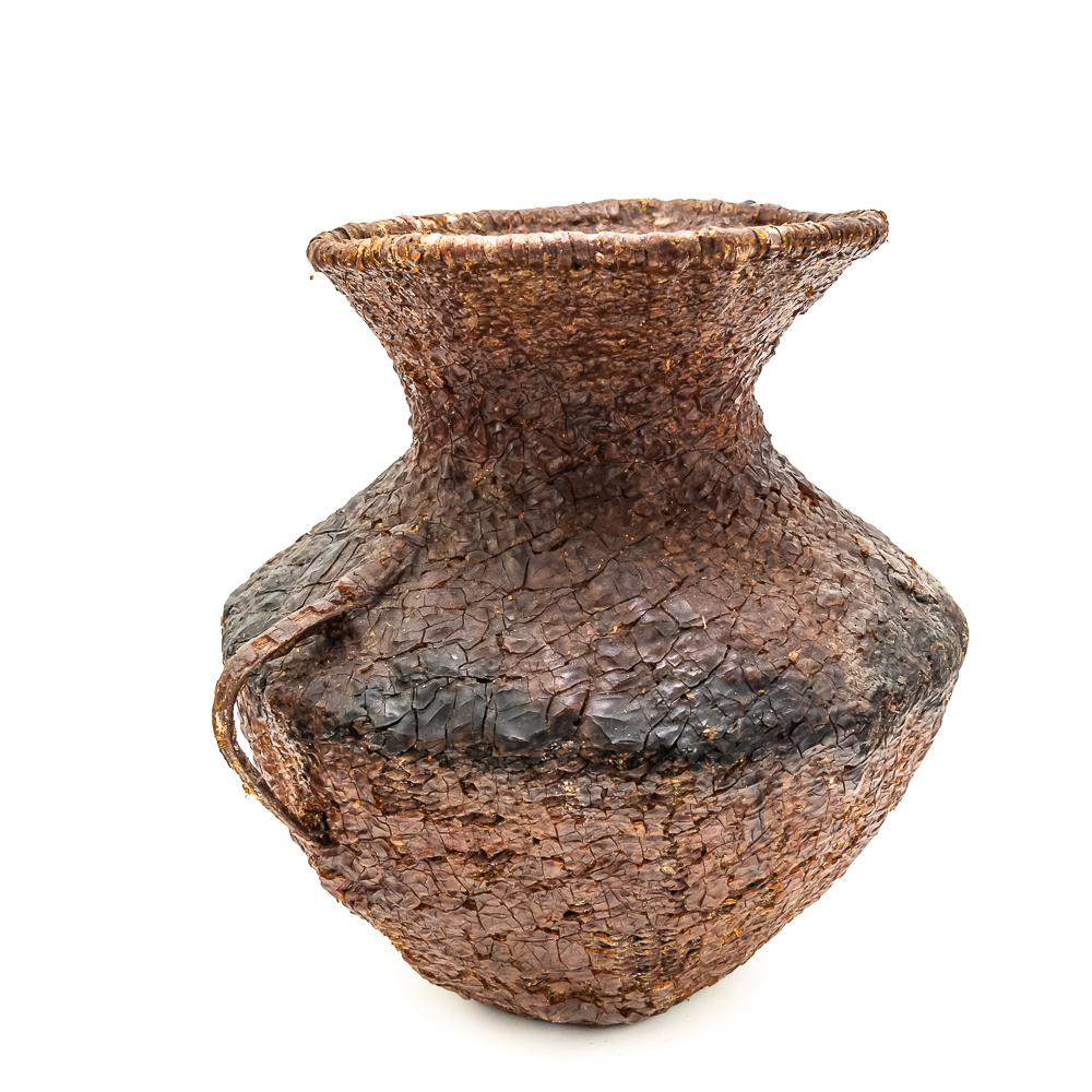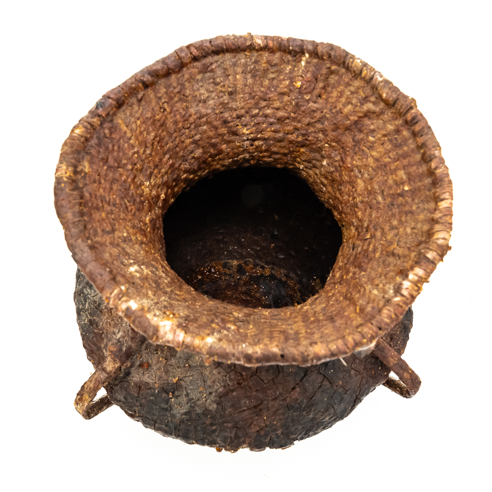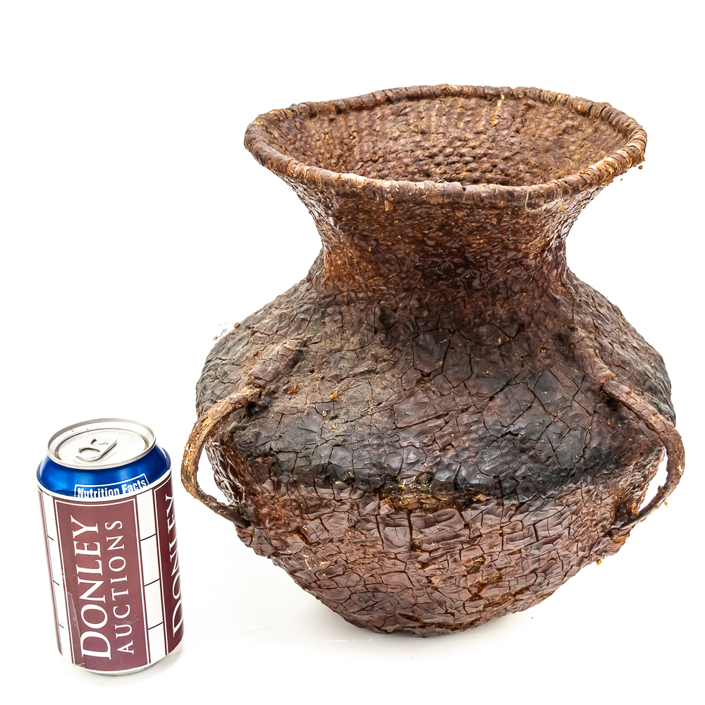 This circa 1930s Apache Tus water vessel showcases the ingenuity and craftsmanship of the Apache people. Hand woven from natural fibers. It features a wide body with a narrower neck and two small handles. The interior and exterior are coated with a pine pitch to waterproof the vessel making it ideal for carrying water in the arid southwest. The pitch exterior coating is delicate and should be handled cautiously. Dimensions: 10.5β tall x 10.5β wide at waist x 7.75β rim diameter x 4β base diameter. See photos.