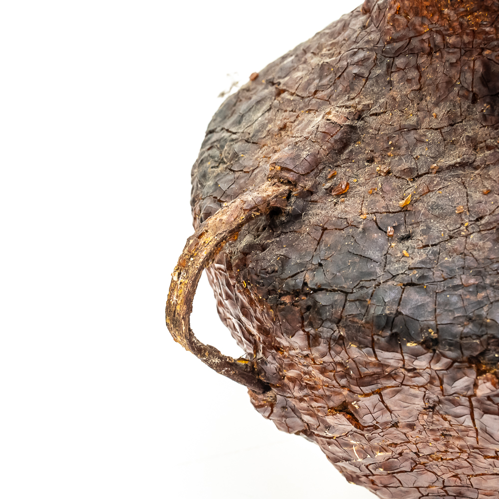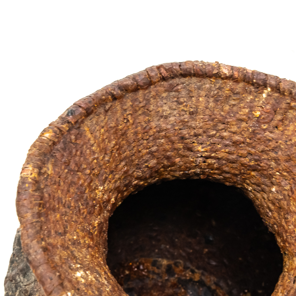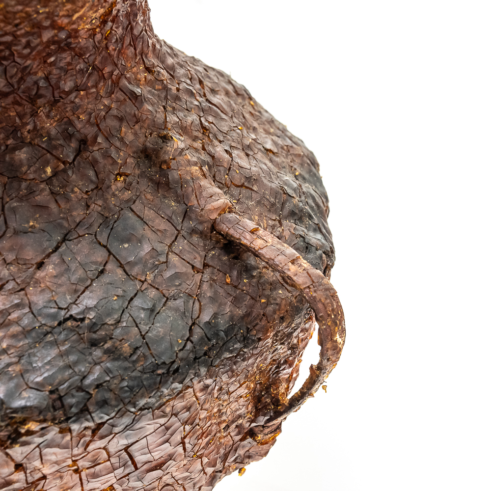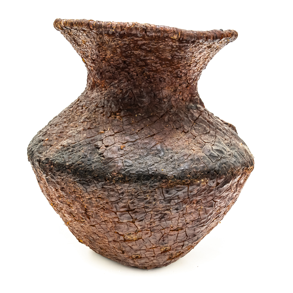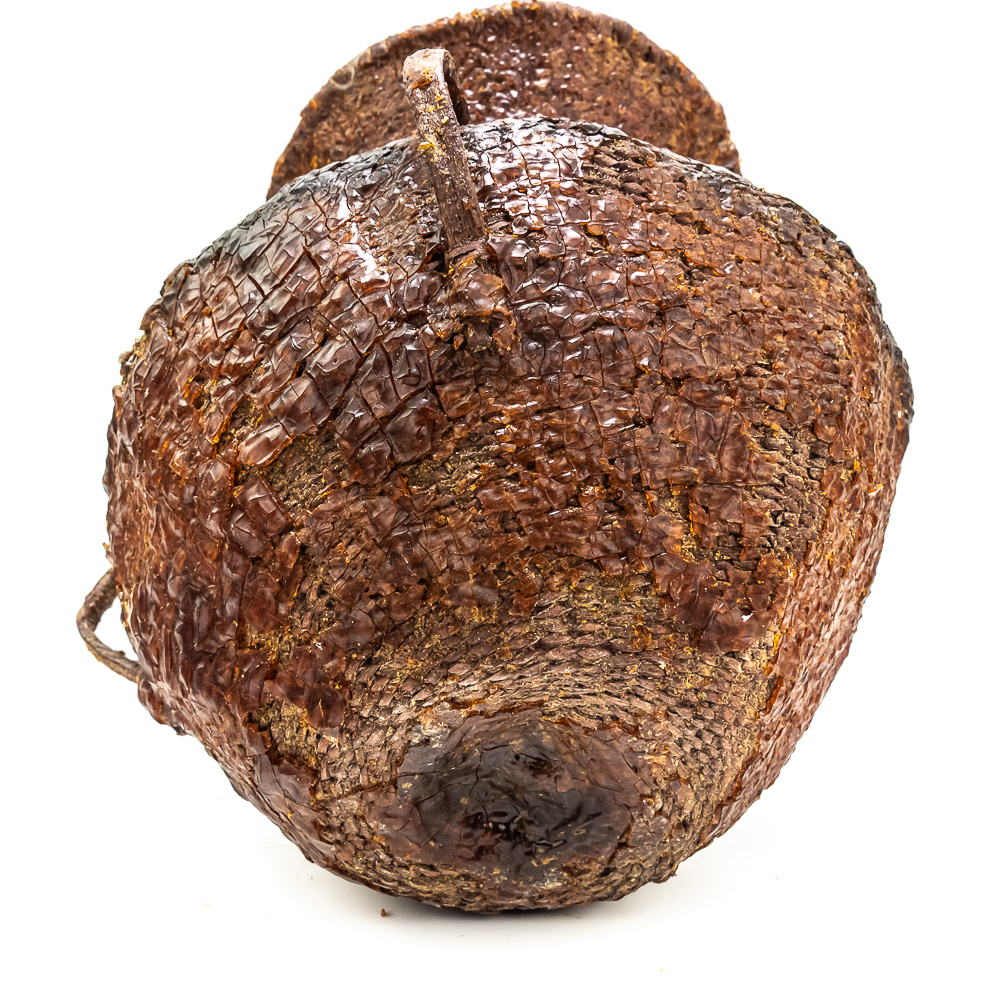 This circa 1930s Apache Tus water vessel showcases the ingenuity and craftsmanship of the Apache people. Hand woven from natural fibers. It features a wide body with a narrower neck and two small handles. The interior and exterior are coated with a pine pitch to waterproof the vessel making it ideal for carrying water in the arid southwest. The pitch exterior coating is delicate and should be handled cautiously. Dimensions: 10.5β tall x 10.5β wide at waist x 7.75β rim diameter x 4β base diameter. See photos.