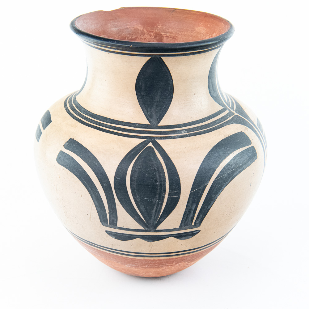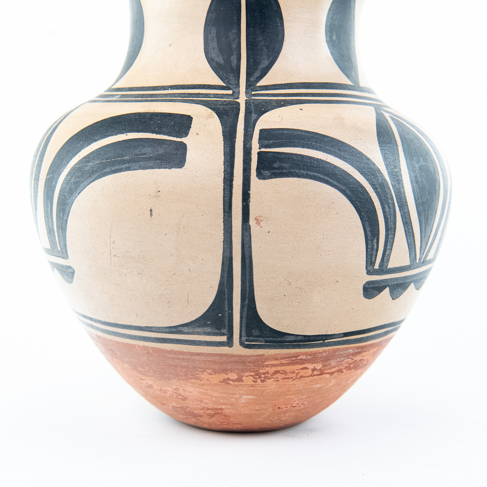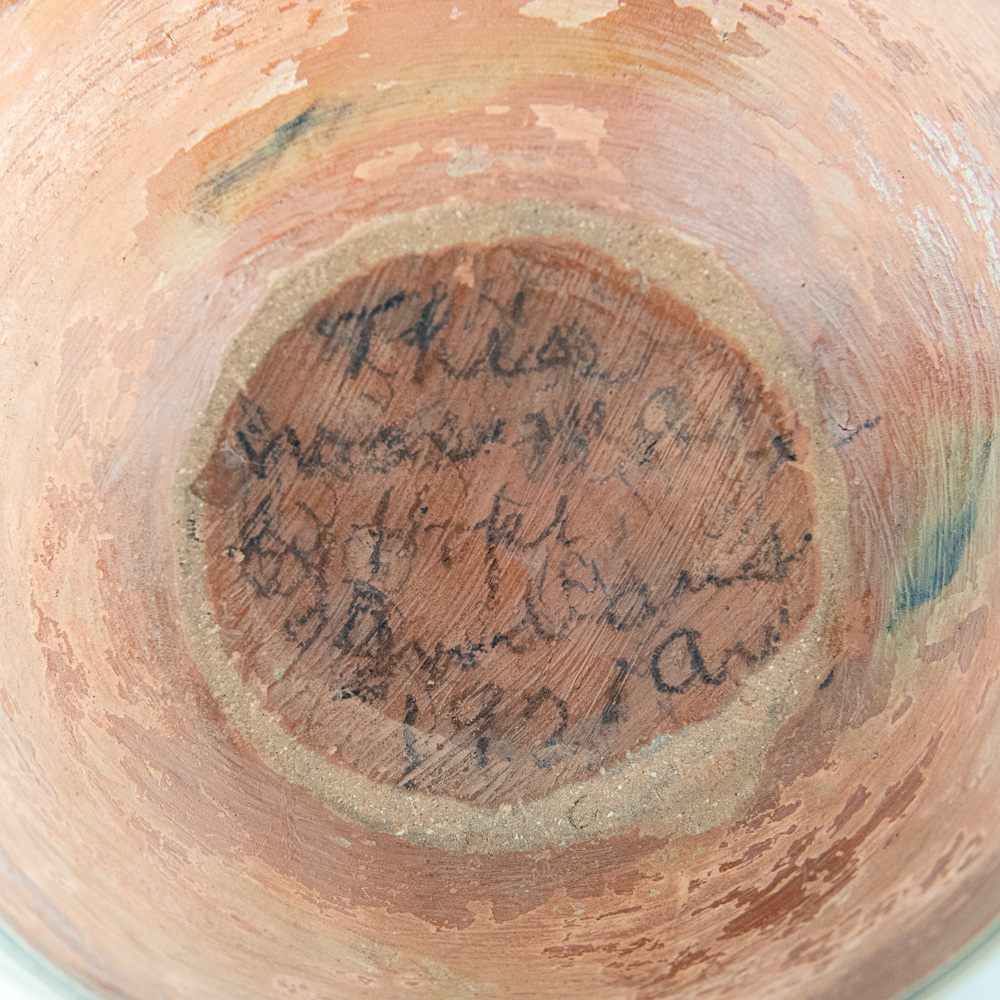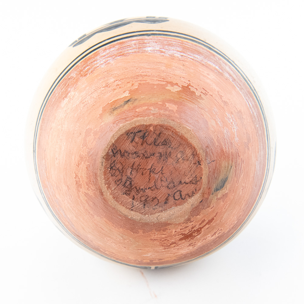 This is a beautiful piece of historic Hopi or Hopi-Tewa polychrome pottery, which showcases the enduring influence of the Sikyatki Revival style popularized by Nampeyo of Hano and her descendants starting in the late 19th and early 20th century. The classic olla form, with its globular body and restricted neck, is elegantly proportioned. The black-on-tan decoration features sophisticated, stylized Sikyatki bird or seed pod motifs and geometric banding, hand-painted over a light slip on the naturally fired terracotta clay body. Likely dated 1931 (written on base) aligns perfectly with the aesthetic of this period, a time when the daughters of Nampeyo, like Fannie and Annie, were actively potting and signing pieces was not yet standardized. The signature on the base, appearing to be “T. Kida” or “T. Kela” (which is not an immediately recognized 1930s master potter in my database), may represent a lesser-documented but equally talented artist from First Mesa, or possibly a collector’s identification mark. The item is in good vintage condition, showing considerable age-appropriate wear including multiple areas of paint abrasion and scuffing on the polychrome designs, which has softened the sharpness of the pattern. Most notably, there is a small, shallow chip visible on the exterior rim. The handwritten inscription on the base is heavily faded and only partially legible. This is a genuinely compelling piece of early 20th-century Pueblo art. H 9.5″, W 8.5″, D 8.5″ From the Native American display in Donley’s Wild West Town.